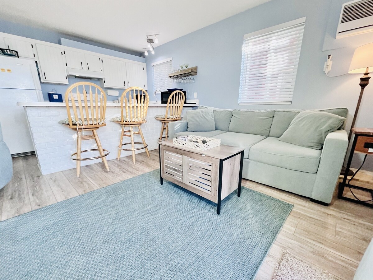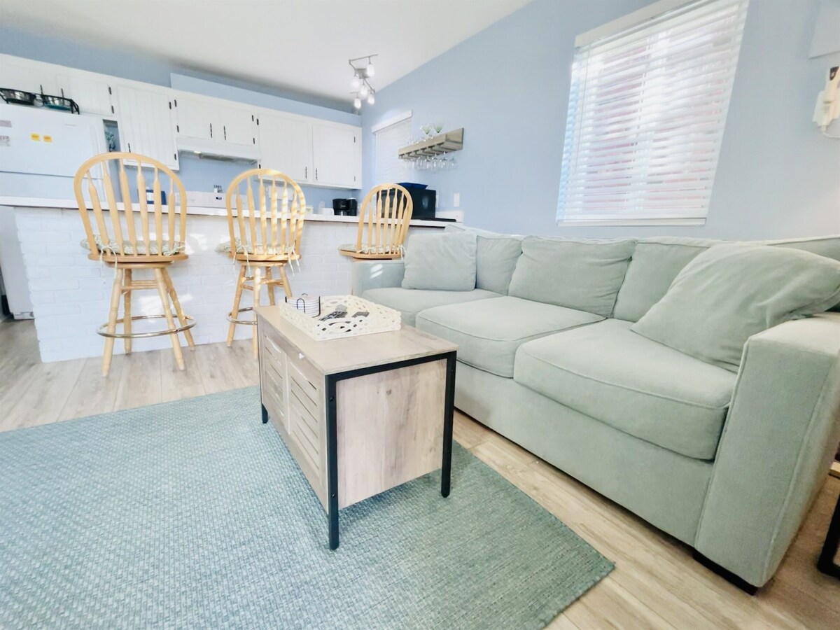 Enjoy Picturesque Views while relaxing at this newly renovated bayfront condo. When you're not at the beach or strolling the boardwalk, the fun continues. You can step off your porch onto the community pier to try your hand at fishing or crabbing, or bring your own kayak or paddleboard to explore the bay. Cook up a favorite dish in your fully equipped kitchen and enjoy Breathtaking Sunsets over the Assawoman Bay while dining on your private bayfront porch. The location is ideal with Ocean City’s famous sandy beaches, restaurants and shopping all just moments away! LESS PACKING : Amenities provided include 4 Tommy Bahama beach chairs, a beach umbrella, sand toys, boogie boards, fishing and crabbing equipment and many other amenities such as a Pack N’ Play, high chair and BPA-free plastic dishware for children. Numerous other expected amenities are listed under the amenities tab. OUTDOOR SPACE: Bayfront private covered porch with dining table and deck chairs. Community deck and pier. Entrance to the porch and condo does require 2 steps. LIVING SPACE: Bay-facing, beach-themed decor, 2 Smart TVs, Free WiFi (100 Mbps), newly remodeled bathrooms. Fully stocked kitchen with all major kitchen appliances as well as a washer and dryer. Dining table and bar seating. Window AC units and ceiling fans. SLEEPING: Bedroom 1: King Bed, Bedroom 2: Queen Bed and Full Bed, Living Room: Sleeper Sofa LINENS: Beds are made with linens, pillows, a blanket/bedspread. Towels include 1 bath towel/1 washcloth/1 hand towel per guest ESSENTIALS PROVIDED: Paper Towels, Toilet Paper, Trash Bags, Dishwasher Detergent, Dish Soap, Sponge, Laundry Detergent, Shampoo and Bar Soap Our prices include all fees. No hidden fees.