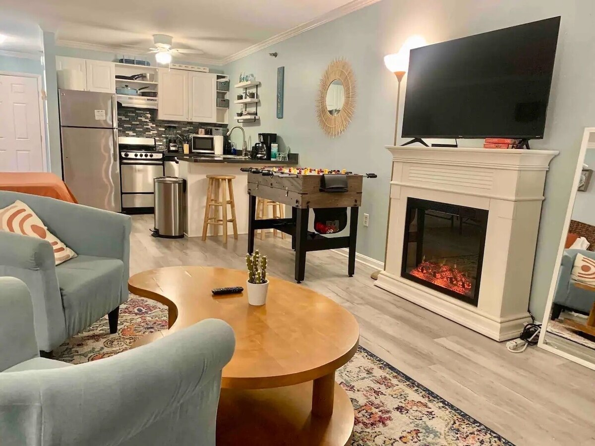 This charming OC studio promises nothing but good vibes! The studio has a full bath, an open layout with an electric fireplace, a fully equipped kitchen, and washer and dryer. Relax on the private balcony, sipping a drink in a hanging chair or dining at the patio table. Proximity to Jolly Roger Amusement Park and Splash Mountain Water Park adds to the excitement, while numerous restaurants and shops are a short stroll away. The beach and boardwalk are just a few blocks from your doorstep! Our prices include all fees. No hidden fees.