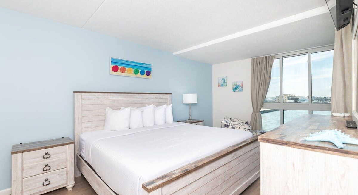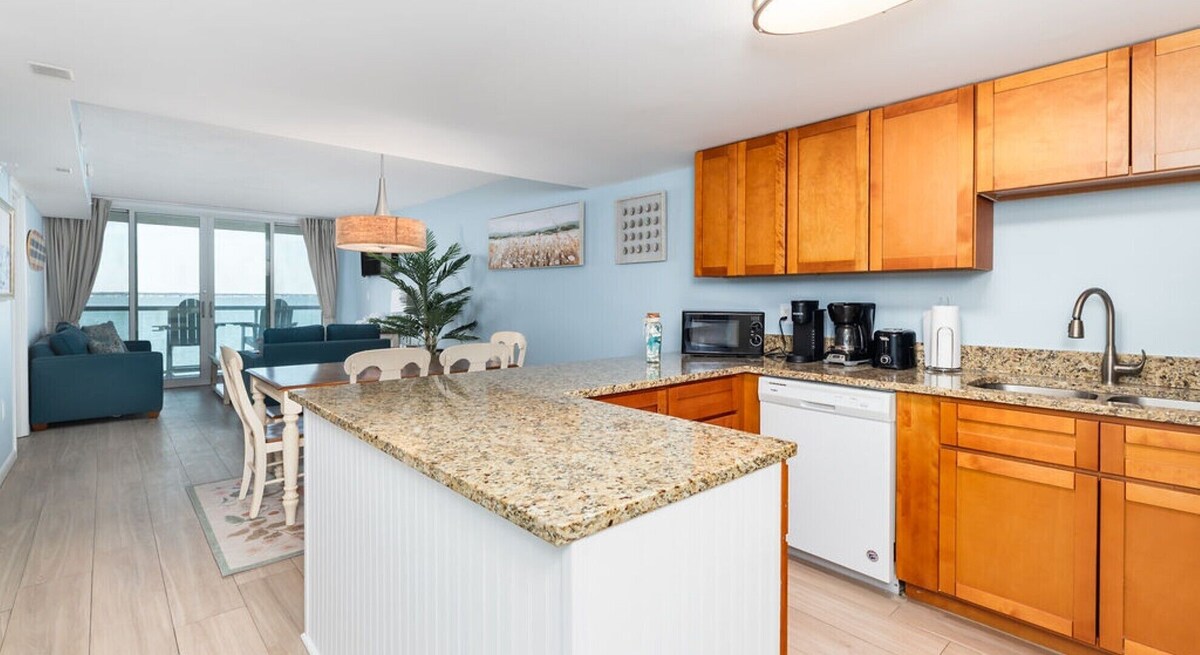 The blues and light wood tones create a beach haven, with extra chairs in the main bedroom overlooking the bay,an ideal spot to curl up and relax. The balcony, furnished with two Adirondack chairs, offers a perfect place to enjoy the bay breeze. This updated third-floor 2-bedroom, 2-bath condo boasts amazing views of Assawoman Bay. Just 5 blocks from the Boardwalk, the condo is centrally located near popular attractions and restaurants. Main Bedroom: Spacious king-sized bed with direct access to the balcony and bay views. Guest Bedroom: Furnished with two twin beds, ensuring comfort for your guests. Balcony: Accessible from both the living room and main bedroom, ideal for soaking in the breathtaking scenery. Living Area: Wall-mounted TV, couch with sofa bed, love seat, and convenient end tables with lamps. Kitchen: Features white full-sized appliances set against wood-tone cabinets and is equipped with a coffee pot, toaster, kitchenware, utensils, and pots and pans. Dining Area: Comfortably seats six, perfect for memorable shared meals and gatherings. Additional Conveniences: In-unit washer and dryer Bath towels and linens provided Free Wi-Fi Two parking permits included **Amenities Disclaimer: While we strive to maintain excellent amenities, occasional maintenance or unforeseen issues may arise. Our team is committed to resolving any concerns promptly to ensure a pleasant stay.** Rental Policies: Must be 21 or older to rent A security hold is due at check-in We do not provide salt, pepper, cooking oils, or coffee filters Pet Policy: This is a dog-friendly resort. Pet fee is payable upon check-in. Max: 2 dogs per unit 70lbs max weight limit per dog. Dogs are NOT to be left unattended in the unit. Ocean City's beaches are pet-friendly from October 1st to April 30th; pets are not permitted on the beach between May 1st and September 30th Our prices include all fees. No hidden fees.