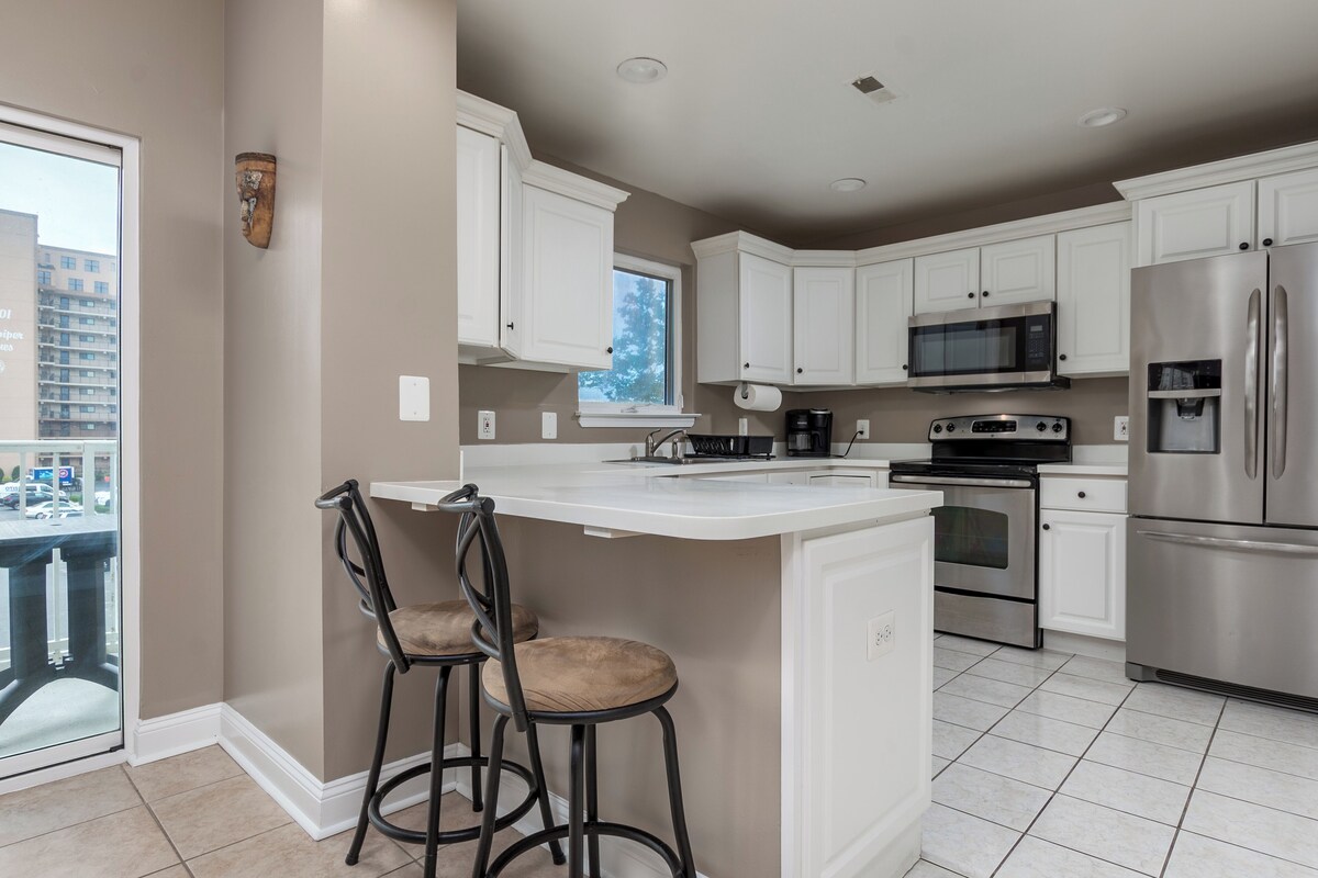 Ocean Side spacious 3 bedroom 2 full Bathroom Condo with Jacuzzi, sleeps 10 people, plus pull out sofa in the living room. Walking distance to the beach. Building has an elevator and 2+ parking spots per apartment. Partial ocean view from balcony and best location in town. Near Fager's Island, Seacrets and other great restaurants and entertainment venues. Our prices include all fees. No hidden fees.