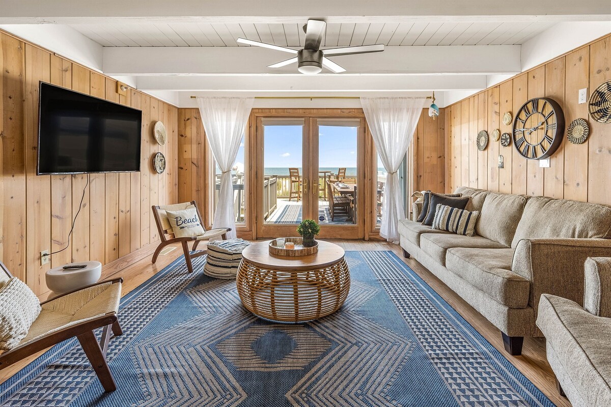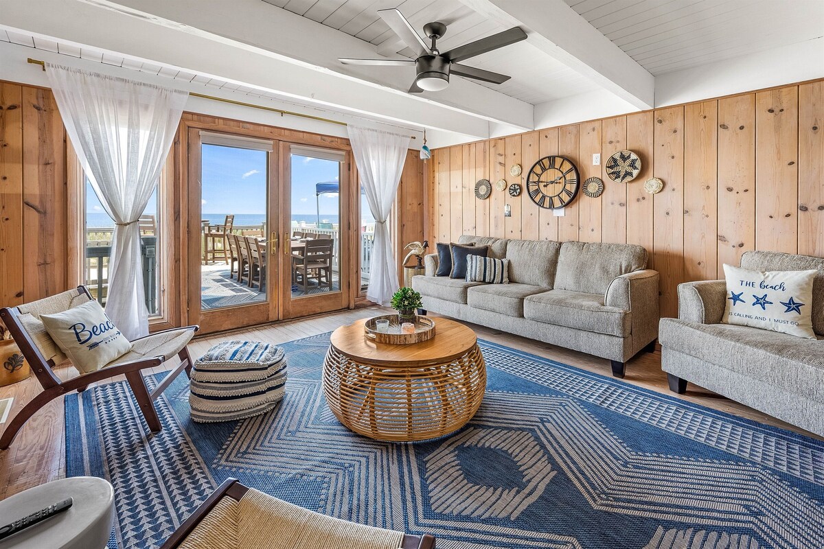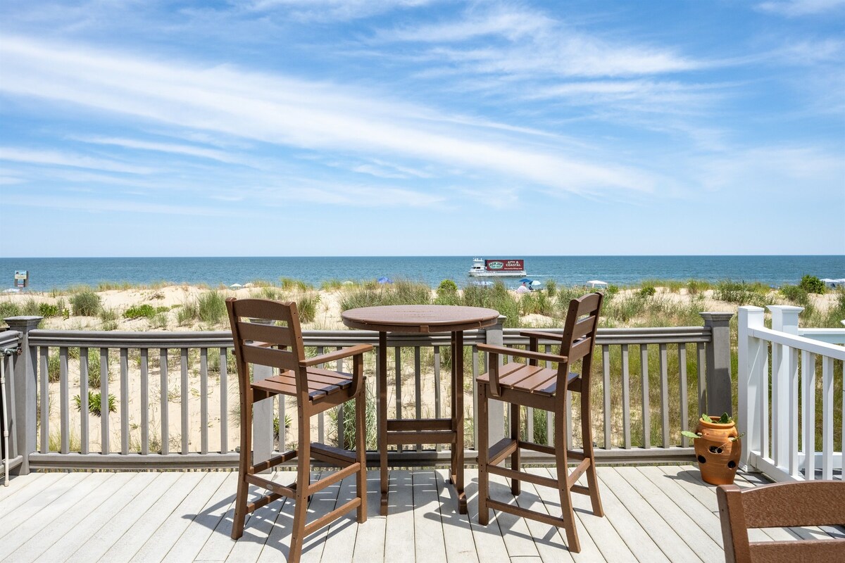 Nestled on the pristine shores of Ocean City, this stunning 5-bedroom beach house epitomizes coastal living. With sweeping views of the Atlantic from nearly every room, this retreat offers a seamless blend of modern elegance and beachfront serenity. The spacious interior features a gourmet kitchen, expansive living areas, and stylish decor throughout. Outside, a private oversized deck provides the perfect spot to relax to the sound of crashing waves or host gatherings with friends and family. LIVING ROOM: - Oversized Sofa and Club Chair - Additional Seating - Smart TV - Ocean Views - Access to Oceanfront Deck KITCHEN & DINING: - Standard Cooking Essentials - Dishwasher - Drip and Keurig Coffee Maker - Bar Seating for 2 - Dining Table with Seating for 8 OCEANFRONT DECK: - Outdoor Dining Table with Seating for 8 - Adirondack Bar Top with Seating for 2 - Stairs Leading to Lowered Covered Patio with Gas Grill BEDROOM I: - King Bed - Ensuite Full Bathroom (Shower/Tub Combo) - Smart TV SECOND FLOOR: - Bedroom II: Queen Bed, Smart TV, Clothing Storage, Ocean Views, Lounge Chair - Bedroom II Balcony (East): Covered Balcony with Direct Ocean Views, 2 Rocking Chairs - Bedroom III Bunk Room: 3 Bunk Beds (6 Twins), Smart TV, Arcade Games, Clothing Storage - Bedroom III Deck (West): Seating for 2, Stairs Leading to Bedroom V - Full Bathroom: Shower Only THIRD FLOOR: - Bedroom IV: King Bed, Smart TV, Clothing Storage, Lounge Chair, Ocean Views - Bedroom IV Balcony (East): Covered Balcony with Direct Ocean Views, 2 Rocking Chairs - Bedroom V: Queen Bed, Smart TV, Clothing Storage - Bedroom V Deck (West): Outdoor Seating and Stairs Leading to Bedroom III - Full Bathroom: Bath/Shower Combo ENTRYWAY: - Washer & Dryer BEACH ESSENTIALS: - Beach Chairs, Umbrella, Boogie Boards *** LINENS ARE INCLUDED - Beds are fully made with linens, pillows, a blanket/bedspread. -Towel Set for Each Guest (1 bath towel/1 washcloth/1 hand towel per guest) *** WELCOME BAG INCLUDED - Includes Paper Towel Roll, 2 Rolls of Toilet Paper, 2 Trash Bags, Shampoo, Bar Soap, Dishwasher Detergent, Dish Soap, Sponge and 1 Laundry Detergent Pod. Our prices include all fees. No hidden fees.