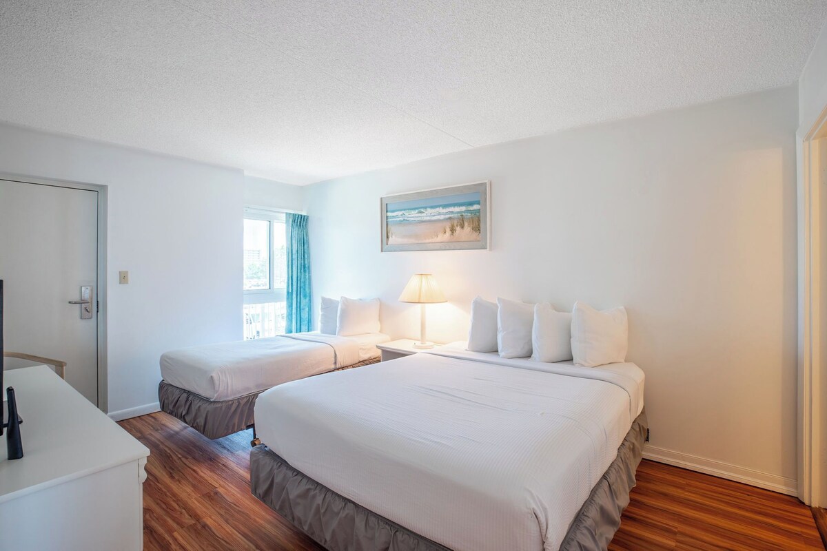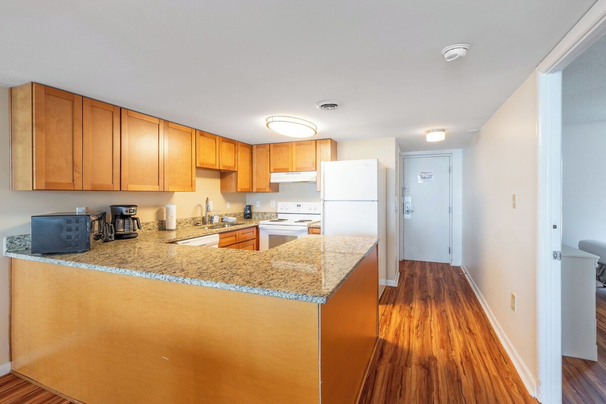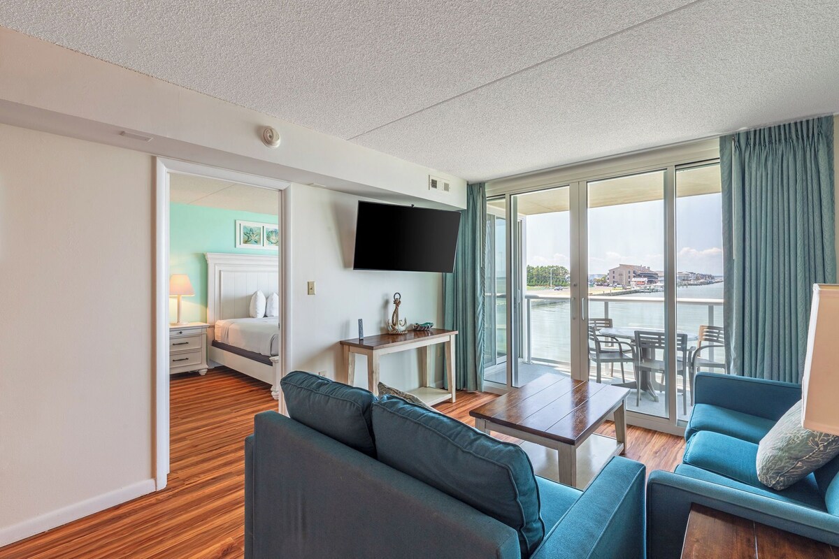 Nestled on the second floor with stunning views of Assawoman Bay, this 2-bedroom, 2-bath condo offers a serene escape just 5 blocks from the Ocean City Boardwalk. It's perfectly positioned and a short distance from local attractions and dining options. Main Bedroom: Features a spacious king-sized bed and direct access to the balcony with beautiful bay views. Guest Bedroom: Furnished with one queen bed and one single bed, ideal for guests or family. Balcony: Accessible from both the living room and the main bedroom, equipped with a circular glass-topped table and two chairs, perfect for enjoying the scenic vistas. Living Area: Includes a wall-mounted TV, a plush couch, a love seat, and convenient end tables with lamps. Kitchen: Fully equipped with a coffee pot, Keurig, toaster, kitchenware, utensils, pots and pans, wine glasses, dishware, and ample counter space. Dining Area: Comfortably seats six, perfect for shared meals and gatherings. Laundry: Washer and dryer in-unit for your convenience. Extras: Bath towels and linens and complimentary wifi are provided. Parking: Two parking permits are included with your stay. **Amenities Disclaimer: While we strive to maintain excellent amenities, occasional maintenance or unforeseen issues may arise. Our team is committed to resolving any concerns promptly to ensure a pleasant stay. Renters must be 21 or older.** Security Hold: A security hold is due at check-in. Please note that we do not supply salt, pepper, cooking oils, or coffee filters. Dog-Friendly: This resort welcomes dogs. A pet fee is payable upon check-in. Limitations: A maximum of 2 dogs per unit, each weighing up to 70 lbs. Dogs must not be left unattended in the unit. Seasonal Beach Rules: Ocean City's beaches are pet-friendly from October 1st to April 30th. Pets are not permitted on the beach between May 1st and September 30th. We appreciate your cooperation in following these guidelines. Our prices include all fees. No hidden fees.