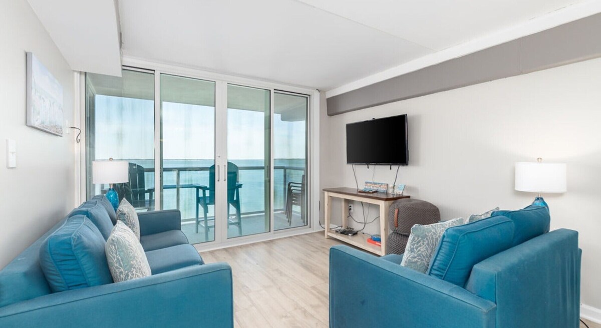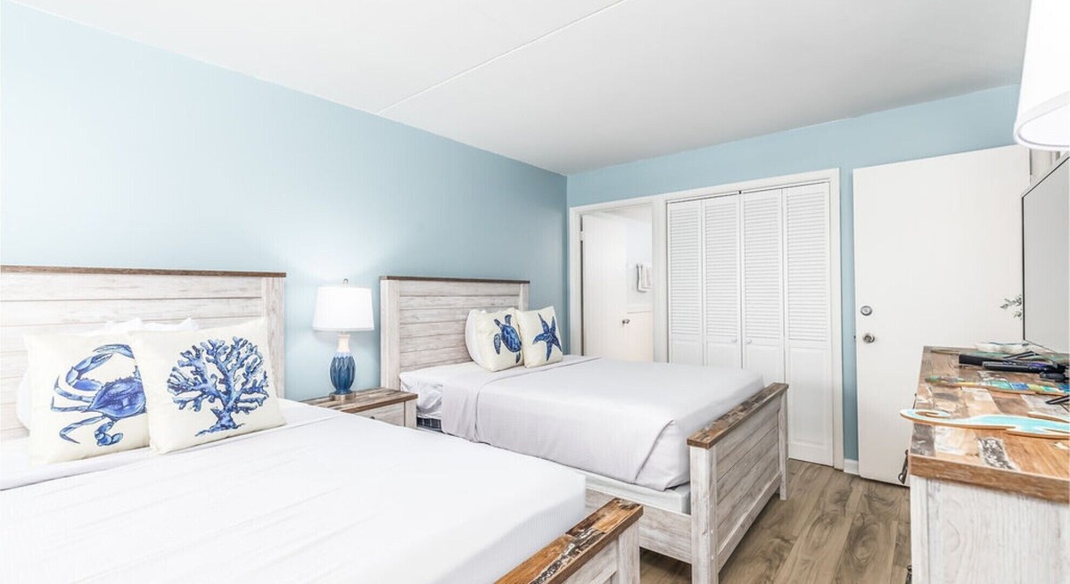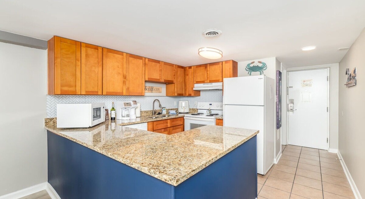 Unwind in style at this freshly updated two-bedroom, two-bath condo, where calming coastal hues of blue, tan, and warm wood set the tone for total relaxation. Located in a lively waterfront community just a short stroll from the beach, boardwalk, and convention center, this spacious retreat blends homey comfort with unbeatable convenience. Perfect for families or small groups, this pet-friendly condo sleeps up to six guests and welcomes dogs (with a fee). The primary bedroom features a king-size bed and private access to a furnished balcony or patio overlooking peaceful bay views. The second bedroom offers two full-size beds—ideal for kids or additional guests. The open-concept living area includes a comfy sofa bed, loveseat, and flat-screen TV—great for laid-back evenings after a day at the beach. Gather around the dining table for meals or board games, and take advantage of the fully equipped kitchen, complete with full-size appliances, generous counter space, a coffee maker, cookware, dishware, and utensils for easy, home-style cooking. Thoughtful extras include a large dog crate, a shoe cabinet, and bedskirts for a tidy, comfortable stay. You'll also enjoy in-unit laundry, complimentary Wi-Fi, fresh linens and towels, and two parking permits available through the front office. Whether you’re soaking up the sun or savoring a quiet sunset, this well-appointed condo offers a peaceful, pet-friendly escape just minutes from all the Ocean City action. Our prices include all fees. No hidden fees.