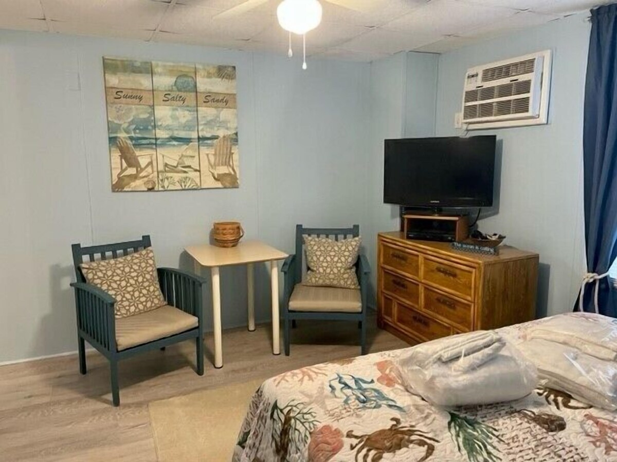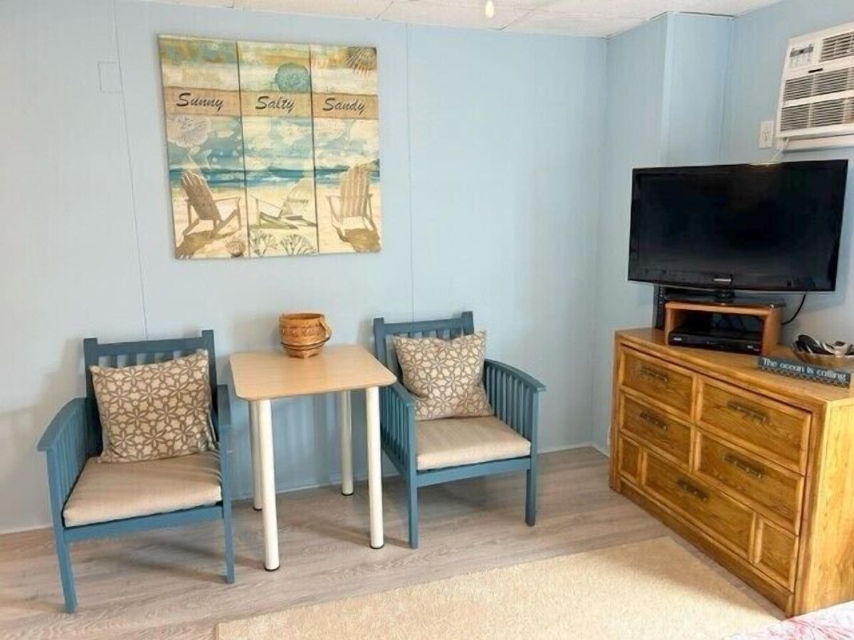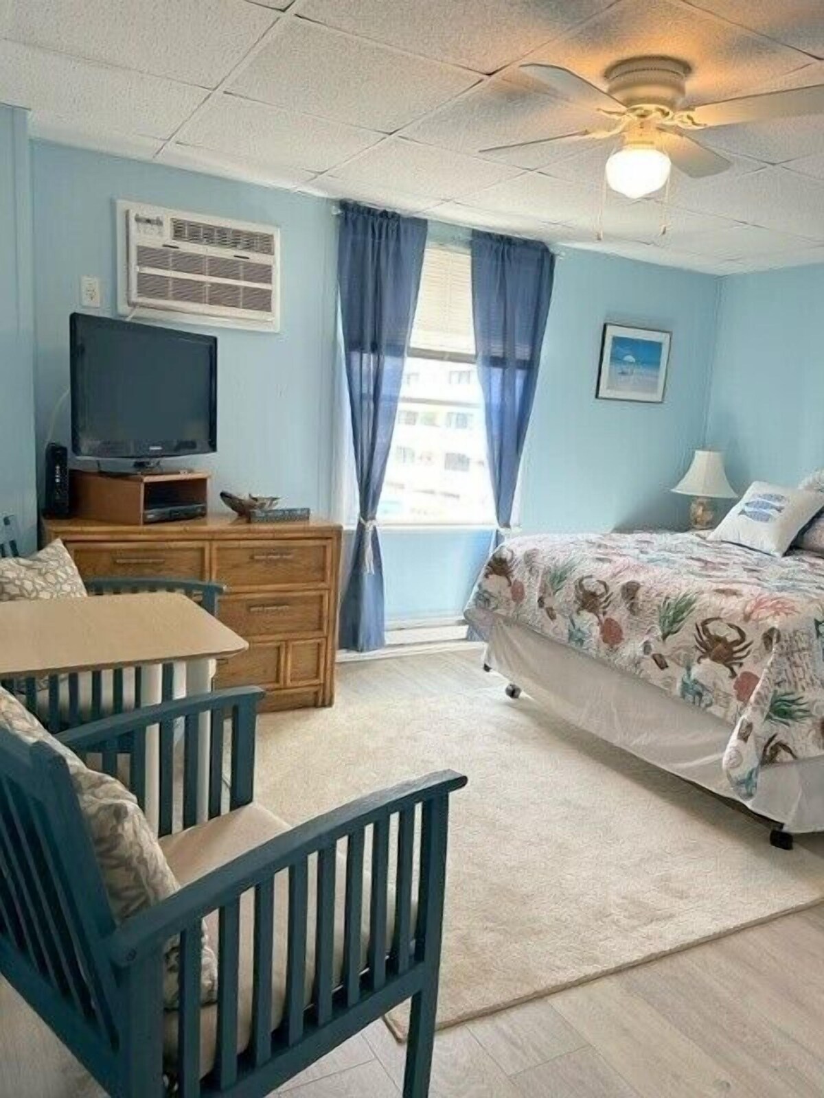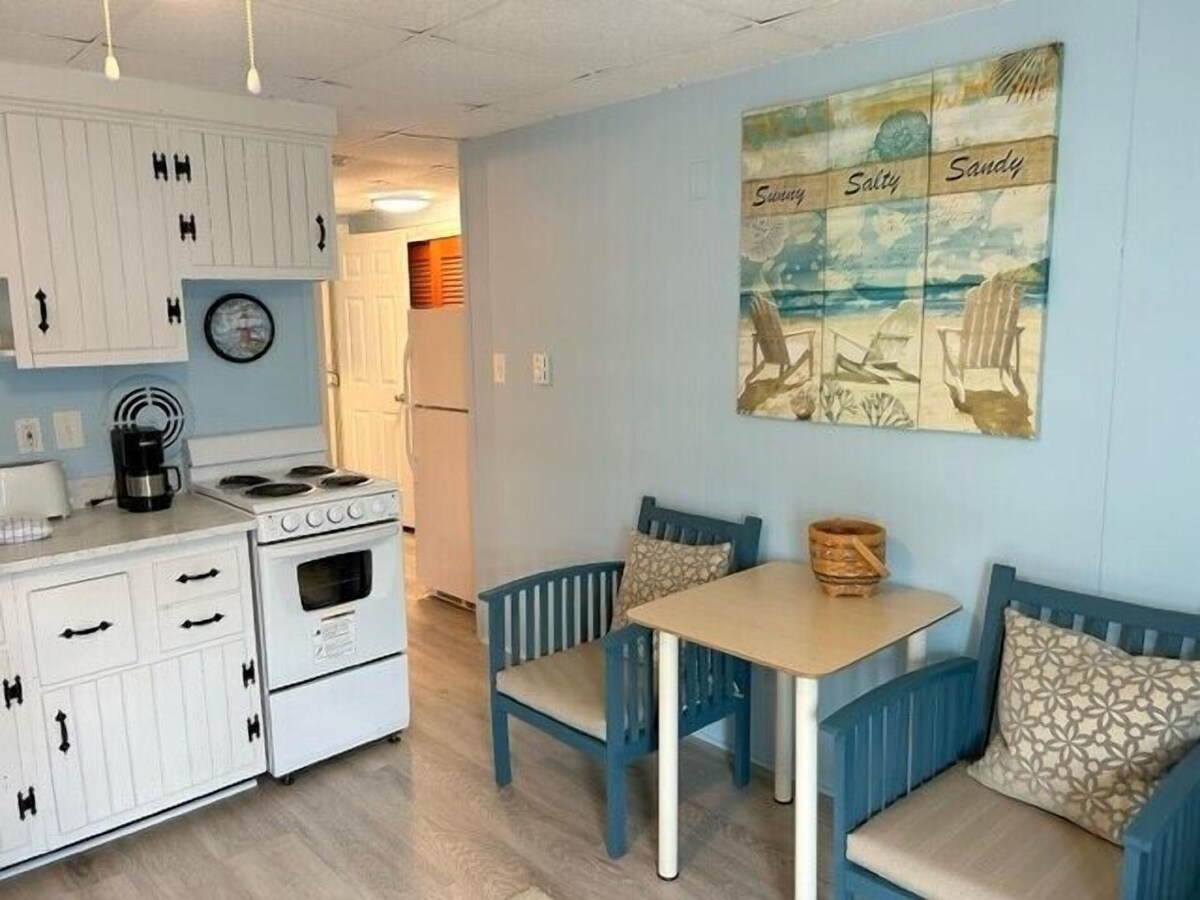 The Windjammer Condominiums located ocean front on 46th street offer that wonderful retro Ocean City feel providing the perfect setting for a memorable visit to Ocean City, Maryland. This 2nd level efficiency, one bath unit (walk-up) can sleep two with one queen bed. This unit sits back from the walkway and does not have a view, but still gives you the convenience of being right on the ocean, and steps to the warm, sandy beach. This efficiency unit was recently updated with new laminate flooring and beachy decor. Spend your day relaxing in the sun, and maybe see some dolphins swimming by, while having the convenience of taking an afternoon break at your condo a few steps away. A one-of-a-kind family vacation destination, each condo is individually owned and decorated offering the guest a unique feel and comfortable stay with direct beach access. Enjoy the exclusive private sand patio for grilling, picnics and play, free WiFi, flat screen TVs. Our condos are stocked and ready for you with towels, linens, cookware and utensils. Don't pass up the chance to stay at your home away from home at the beach! Property rents any 2 nights all season. This unit permits up to two dogs, 50lb limit for one pet or 70 lb combined limit for two pets. There is an additional $35.00 per day pet fee. Although pets are allowed all season, absolutely no pets on the private sand patio courtyard. There is a designated pet area supplied with waste bags just a minute's walk away. An on-site laundry room is available for guests at no additional cost from 9am to 5pm. Non-Smoking/Non-Vaping This property owner does not permit group rentals to guests under the age of 25. We make every effort to ensure the accuracy of our properties including photos, descriptions, pricing and amenities shown above. Although they are deemed reliable, they cannot be guaranteed. Please be advised we do not advertise any properties on Craig's list. Our prices include all fees. No hidden fees.