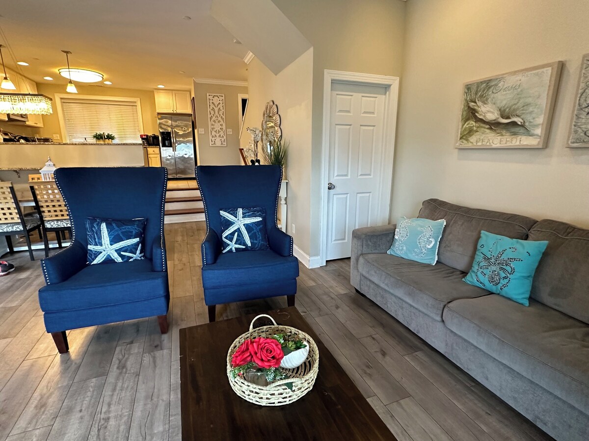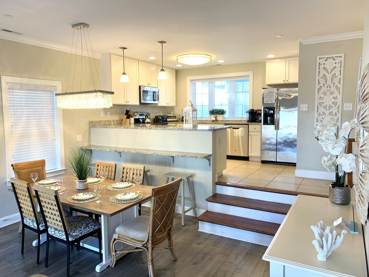 Relax and enjoy our newly updated, beautifully decorated 3 Br/ 3 Ba luxury ocean block Townhouse, (2014) which has a 2 car garage on 16th street. The end unit luxury townhouse is less than a 2 minutes walk from the beach and the boardwalk in a prime Downtown location. Enjoy beautiful sunrises Ocean View from two private balconies and drink coffee from Starbucks Coffee across street. Within walking distance are great restaurants/bars, mini-golf, shopping, amusements, and nightlife. The Space This townhouse has an open floor plan and two private balconies that are overlooking the excitement of downtown Ocean City and is the perfect place for you to entertain family and friends. After waking up in the morning, you can walk right out to the boardwalk for exercise or rent a 4-wheeled bicycle with family or friends and drive around the boardwalk or sit out on our two balconies to enjoy the cool ocean breeze and drink a coffee from the local Starbucks just across the street with your family and friends to create beautiful memories. We gladly welcome you to bring your furry family member(s) up to two house-trained and well-behaved dogs or cats to our unit year-round to enjoy the beach and boardwalk with a one-time Pet Fee of $75 per stay. However, please note that per Ocean City's pet policy and regulation, dogs are not allowed on the beach or boardwalk from May 1 to September 30. They are permitted between October 1 and April 30. Unattended pets must be crated. It is equipped with a fully stocked kitchen, microwave, washer, dryer, dishwasher, and central air conditioning unit. This townhouse has all the modern conveniences, a gourmet kitchen with granite counter and SS appliances, a flat-screen TV in every room, free high speed Internet WiFi, High Definition cable TVs, DVD player. ***Linens and towels are not included in the rate but can be rent from a third party online. Should you decide NOT to rent Bed Linens & Towel Packages through a 3rd party, you must bring your own Bed Linens & Towels with you. This property has the sleeping arrangements necessary to comfortably accommodate up to 12 people. There are a lot of shops and restaurants nearby: * 1 Block to boardwalk/beach- 2 min walk * Starbucks Coffee- across the street (2 min walk) * CVS- across the street (1 min walk) * Layton's Family Restaurant- across the street (1 min walk) * Franco’s Pizza and Bar * Phillips Crab House Buffet- 8 min walk, 2 min by car * Fish Tales- 3 min by car * Bonfire Buffet- 7 min by car * Seacrets Night Club- 5 minute by car * Convention Center - 5 minute by car * bus stop -1 min walk The spacious living room is furnished with a comfy couch, a matching love seat, an armchair, and a television. The couch doubles as a queen-size sleeper sofa. The sliding balcony doors allow plenty of natural light to brighten the space. Right off the living room is a dining area, perfect for cozy meals with the family. Also off the living area is a bathroom. Next to the dining area is a fully-stocked kitchen with a breakfast bar and wide, granite counter top, just right for grabbing a quick bite. The master bedroom has a king-size bed, a television and a private bathroom. The second bedroom has a full bunk bed w/ trundle. The third bedroom has a queen-size bed w/ trundle and access to the hall bathroom. Sunburst 106 has the following amenities: Quick, easy check-in with code on the door (no key required), central air conditioning, 2 car garage, fourth TVs, one DVD player, free WiFi, cable TV, full-size washer and dryer, refrigerator, ice maker, microwave, a Keuriq, coffee maker, toaster, stove, disposal, dishwasher, and an outdoor foot shower. This property is non-smoking and does not allow pets. This property rents to families, married couples or responsible adults over the age of 21. It’s the perfect place for your family or friends to call home for a week or just a few days and have a wonderful summer vacation in Ocean City! Check out our other available listings: **Sunset Paradise: Bayview/Boardwalk w/3 Car Prkg Spaces https://www.vrbo.com/2105542 **DirectOceanFront🏖 on Boardwalk/Newly Remodeled/with Pool https://www.vrbo.com/2126591 Check-in: 3PM Check-out: 10AM Self check-in w/ keypad smartlock We provide an ADEQUATE supply of toiletries such as toilet paper (1 roll/bath), dishwasher pods (2/stay), and laundry detergent (2 cubes/stay). Please use sparingly or feel free to bring your own as we DO NOT replenish items if they run out. ***High School Seniors: The house can accommodate a MAXIMUM of 12 high school seniors, You must get approval from home owner prior to booking along with additional renter insurance ($99 non-refundable renter insurance).*** ***For safety of our guests, all children or guests under 18 years old must be accompanied by their legal guardian. *** ***No Loud parties, noise that disturbs other units will not be tolerated and will result in eviction with no refund of security deposit or unused rent. For weekly rentals, check-in dates are available any day of the week. You will be responsible for any damage to the rental property caused by you or your party during your stay. *Mini weeks are available any day of the week for check in with 2 night-stay minimum. **Linens and Towels Policy *Linen policies can vary among hosts in Ocean City. In our case, we offer the choice for guests to either bring their own linens (sheets) and towels OR choose a 3rd party linen service. *Websites will be provided upon booking. *Should you choose not to, you must provide your own bed linens (sheets) and towels. *All the beds are covered with water-resistant bed padding protectors over the mattress. *Remember to bring your own sheets, pillowcases, towels, and toiletries. Pillows and blankets are provided. Linens and towels are not included in the rate but can be rent from a third party online. Come stay at the Sunburst and create wonderful memories to last you and your family a lifetime! Other things to note We provide a