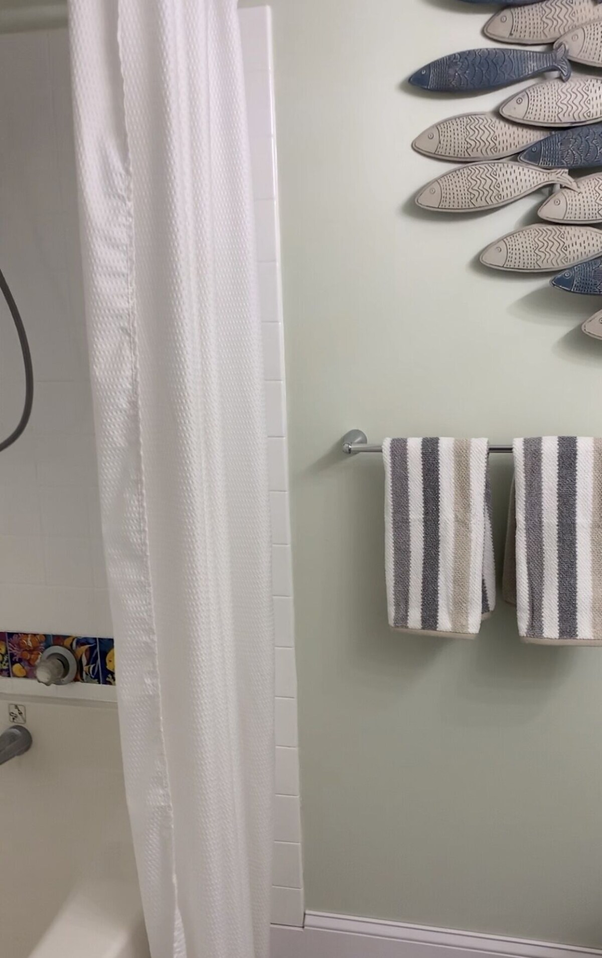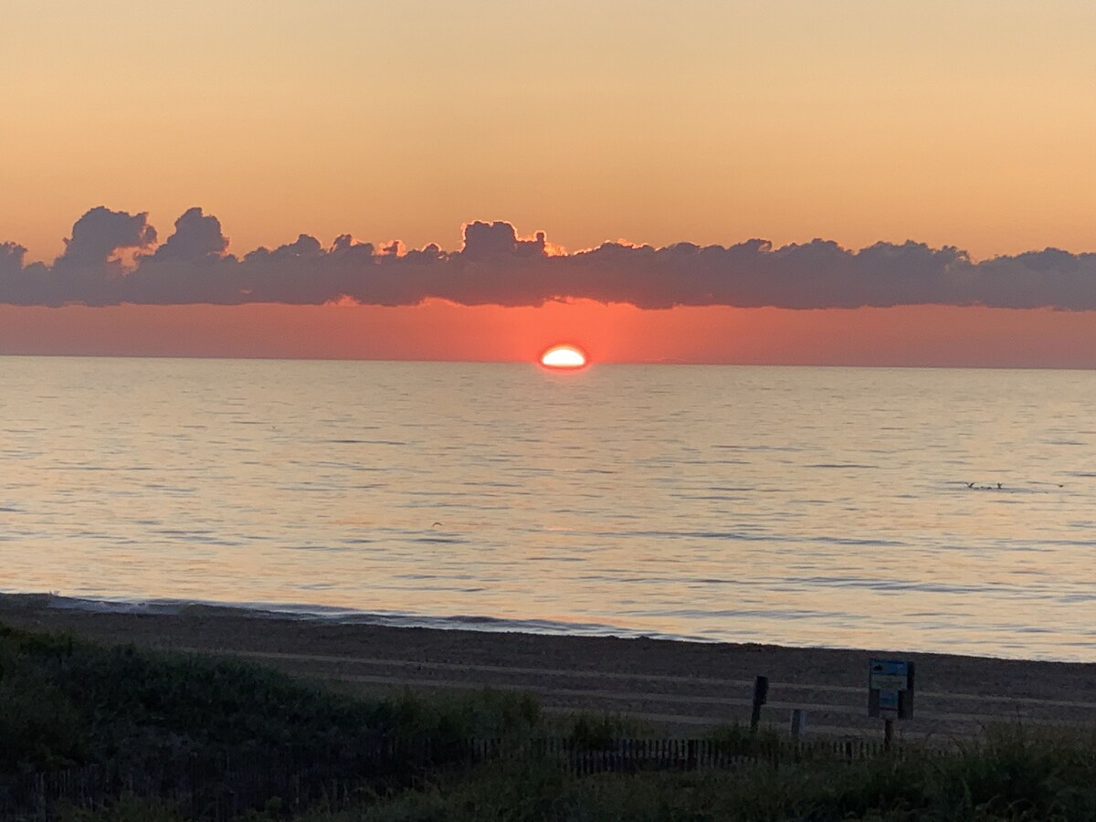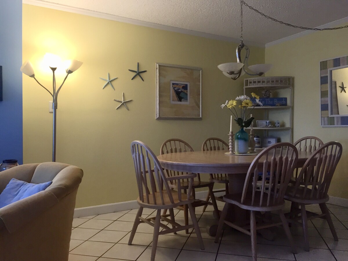 Cheerful condo with 2 bedrooms and 2 full bathrooms and Southern exposure in small 4 story building with an elevator.Well maintained, and decorator furnished, situated on a very uncrowded and wide beach. There is garage parking with two assigned spaces close to the elevator. Building has an outside shower. Owner provides linens (if you wish to use them, but must be laundered and folded before check-out). Owner provides beach chairs and umbrellas. There are 3 flat screens TVs. Washer and dryer in unit. Central air conditioning and ceiling fans in every room. Lovely 60 foot wrap around balcony. Excellent mid-town location 4 blocks from Rt. 90 bridge. Walking distance to fine restaurants, shopping and entertainment. Minimum age to rent: 25, sorry no Senior Week rentals permitted in this building. Our prices include all fees. No hidden fees.