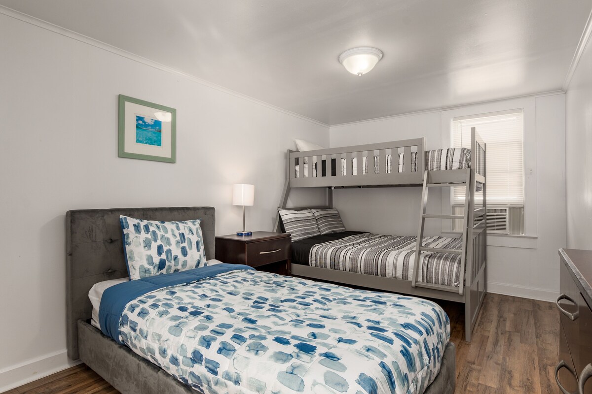 Somerset Harbor Condo #4 welcomes families and responsible groups are warmly welcomed at this charming beach condo, perfectly located in the heart of downtown Ocean City. Just two blocks from the iconic Ocean City Boardwalk and beach, you'll be steps away from sun-soaked adventures and vibrant local attractions. With less than a 2-minute walk to event and festival venues, and direct access to the beach, your days can be filled with sunbathing, beachcombing, or dining at nearby local favorites such as Angler’s, MR Ducks, Marina Deck, and many more—all just steps away. In the evening, unwind and enjoy breathtaking sunsets over the bay, as this condo sits directly across from the White Marlin Marina, offering stunning views. Just a few hundred feet away, you'll also find a fishing pier, mini-golf, watercraft rentals, surf and souvenir shops, fast-food spots, fine dining options, as well as lively bars and nightclubs. For thrill-seekers, Jolly Roger at the Pier is nearby, featuring a two-level carousel, the iconic Ferris wheel, the Slingshot, games, rides, and more family-friendly fun! Property Highlights: - renovated bathroom & floors - Updated furniture - Self check-in with keyless entry - Sleeps up to 6 guests - 2 assigned parking spots - Pet-friendly upon arrangement. 150$ per dog for the whole stay. - No smoking Sleeping Arrangements: Bedroom 1: Queen-size bed Bedroom 2: One double bed + two twin beds Living Room: Pull-out sofa All beds come with pillows and hypoallergenic protective mattress covers. Complimentary fresh sheets and a towel package are included with reservations of 3 nights or more, including: Two sheets per sleeping surface, Pillowcases, One bath towel, one hand towel, and one washcloth per guest. For hygiene and sanitation purposes, linens are professionally prepared, sealed in plastic and provided in a package. Guests will be responsible for making their own beds upn arrival At BluVista, we are dedicated to creating a unique and seamless vacation experience. As local hosts, we are always available during your stay to answer questions or address any concerns. Thank you for considering Somerset Harbor Condo #2—we look forward to hosting you! Our prices include all fees. No hidden fees.