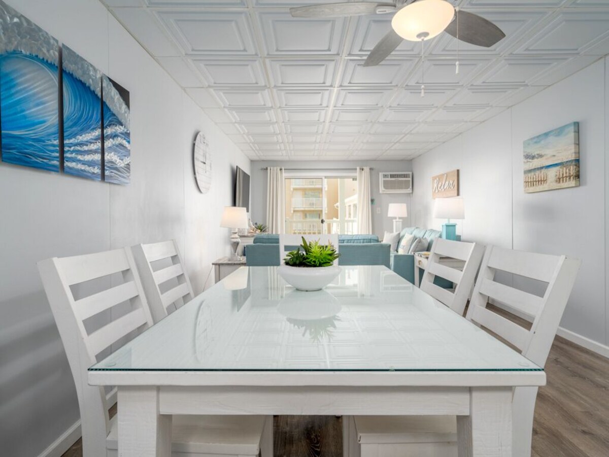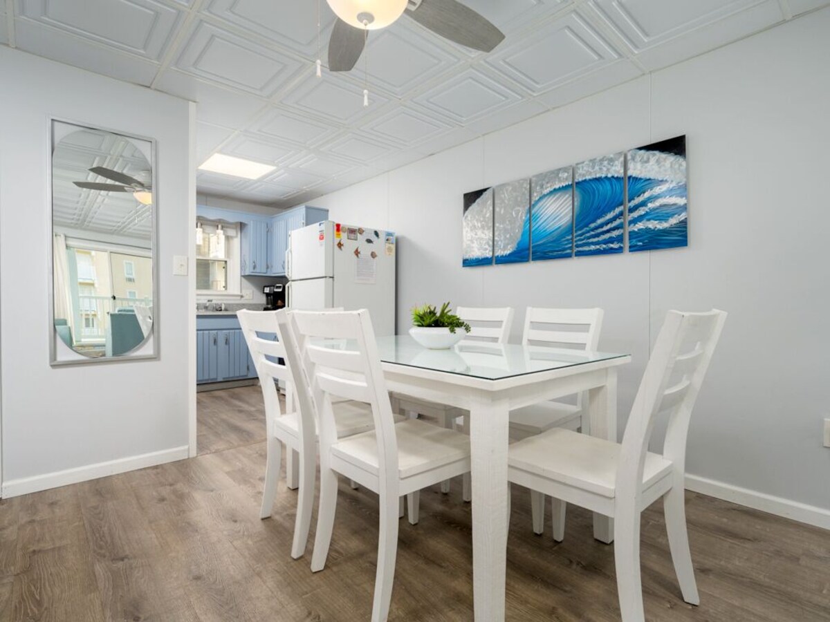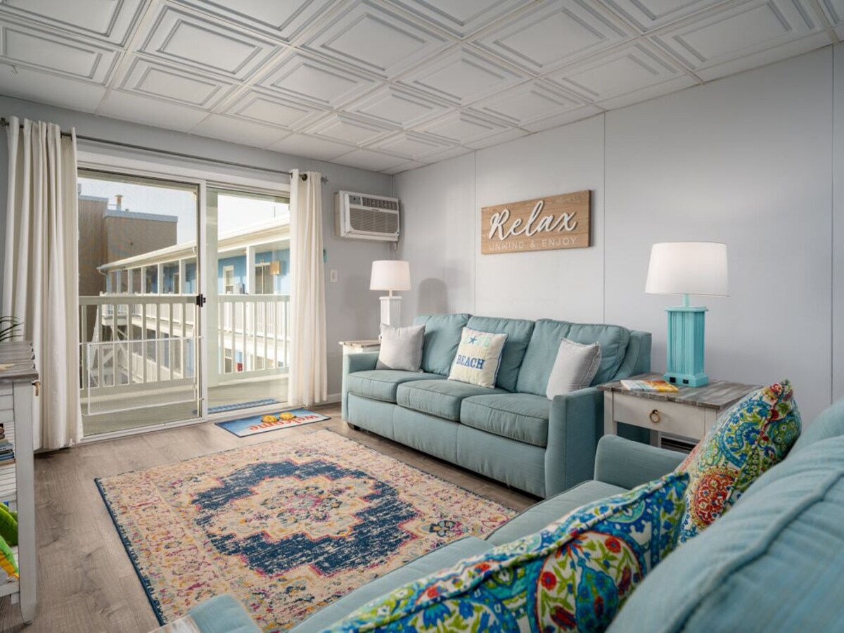 The Windjammer Condominiums located ocean front on 46th street offer that wonderful retro Ocean City feel providing the perfect setting for a memorable visit to Ocean City, Maryland. This 3rd floor walk up one bedroom, one bath unit can sleep five with bed sizes including a king in the bedroom, and both a queen and double sleeper sofa in the living area. A one-of-a-kind family vacation destination, each unit is individually owned and decorated offering the guest a unique feel and comfortable stay with direct beach access and ocean views. Enjoy the exclusive private sand patio for grilling, picnics and play, free WiFi, flat screen TVs. Our condos are stocked and ready for you with towels, linens, cookware and utensils. Don't pass up on the chance to stay at your home away from home at the beach! This unit permits up to two dogs, 50lb limit for one pet or 70 lb combined limit for two pets. There is an additional $35.00 per day pet fee. Although pets are allowed all season, absolutely no pets are permitted on the private sand patio courtyard. There is a designated pet area supplied with waste bags just a minute's walk away. An on-site laundry room is available for guests at no additional cost from 9am to 5pm. Property rents any 3 nights in season and any 2 nights off season. Non-Smoking/Non-Vaping. Property owner does not permit group rentals to guests under the age of 25. We make every effort to ensure the accuracy of our properties including photos, descriptions, pricing and amenities shown above. Although they are deemed reliable, they cannot be guaranteed. Please be advised we do not advertise any properties on Craig's list. If you see the content of our listings on Craig's list, it is not a legitimate advertisement from Central Reservations. Our prices include all fees. No hidden fees.