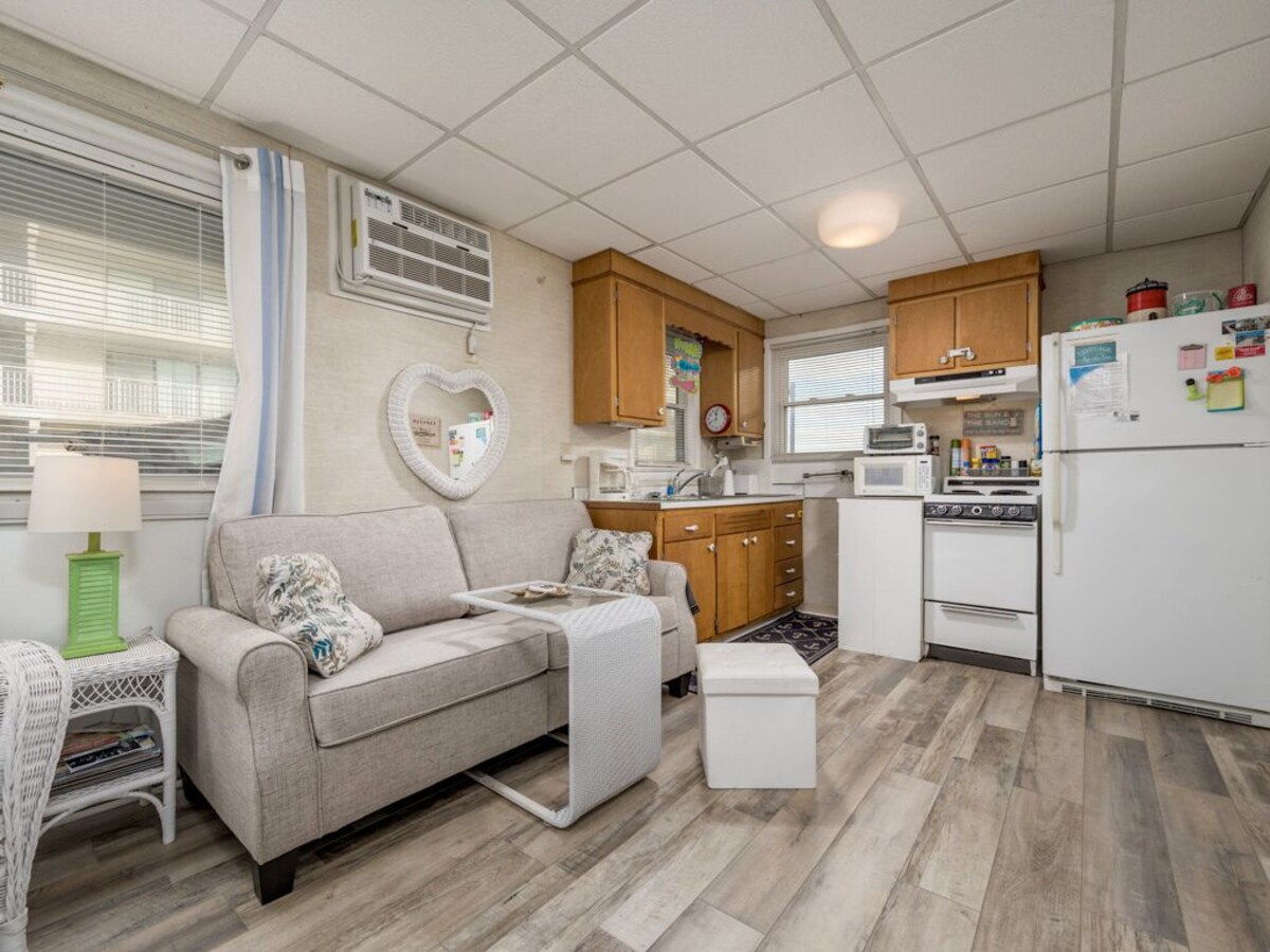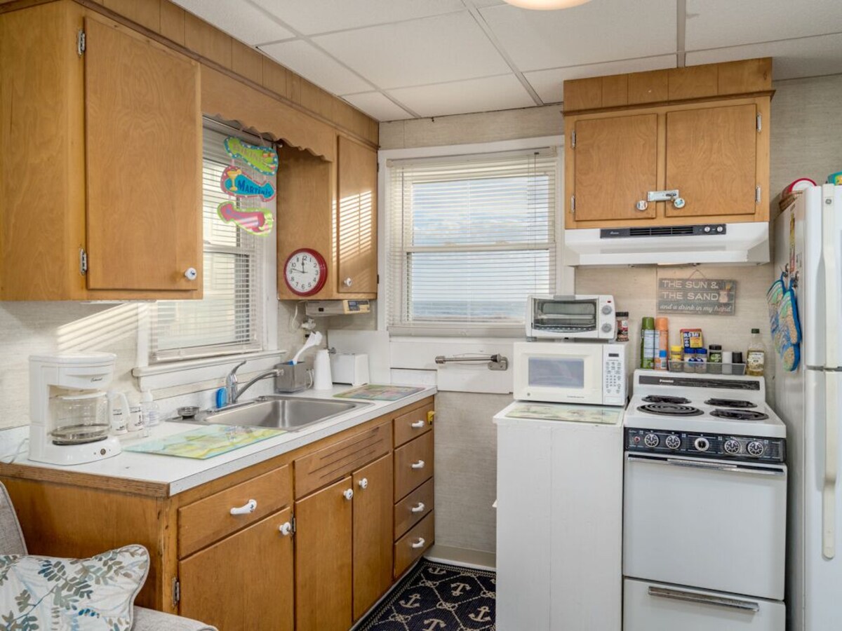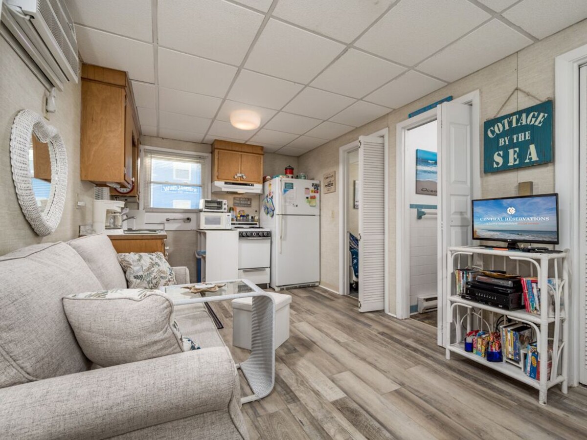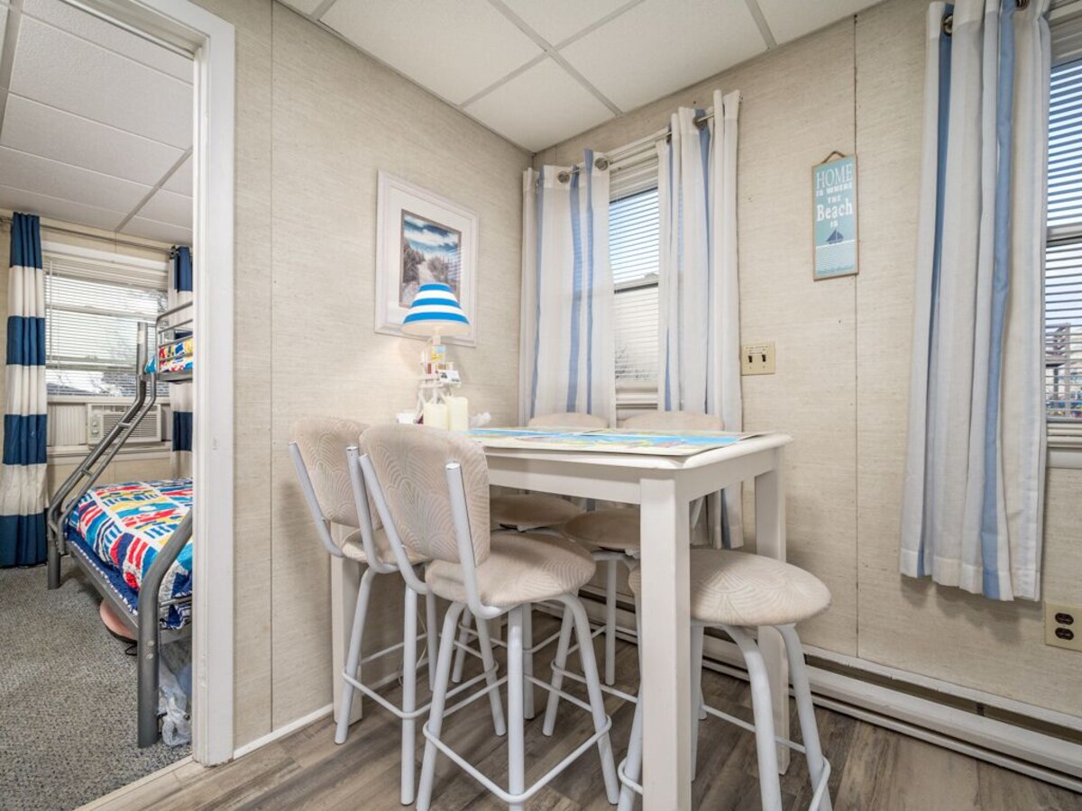 The Windjammer Condominiums located ocean front on 46th street offer that wonderful retro Ocean City feel providing the perfect setting for a memorable visit to Ocean City, Maryland. This stand-alone, 2nd floor walk-up condo is located just behind the oceanfront building on the ocean block above the rental office. Sleeping a total of five people, the condo has two bedrooms and one bath with a double in 1st bedroom and a pyramid bunk in the 2nd bedroom. A one-of-a-kind family vacation destination, each unit is individually owned and decorated offering the guest a unique feel and comfortable stay with direct beach access and ocean views. Enjoy the exclusive private sand patio for grilling, picnics and play, free WIFI, flat screen TVs. Our condos are stocked and ready for you with towels, linens, cookware and utensils. This property rents any 3 nights in-season and any 2 nights off-season. Don't pass up on the chance to stay at your home away from home at the beach! This unit permits up to two dogs: 50lb limit for one pet or 70 lb combined limit for two pets. There is an additional $35.00 per day pet fee. Although pets are allowed all season, absolutely no pets on the private sand patio courtyard. There is a designated pet area supplied with waste bags just a minute's walk away. An on-site laundry room is available for guests at no additional cost from 9am to 5pm. Non Smoking/Non Vaping. This property owner does not permit group rentals to guests under the age of 25. We make every effort to ensure the accuracy of our properties including photos, descriptions, pricing and amenities shown above. Although they are deemed reliable, they cannot be guaranteed. Please be advised we do not advertise any properties on Craig's list. Our prices include all fees. No hidden fees.