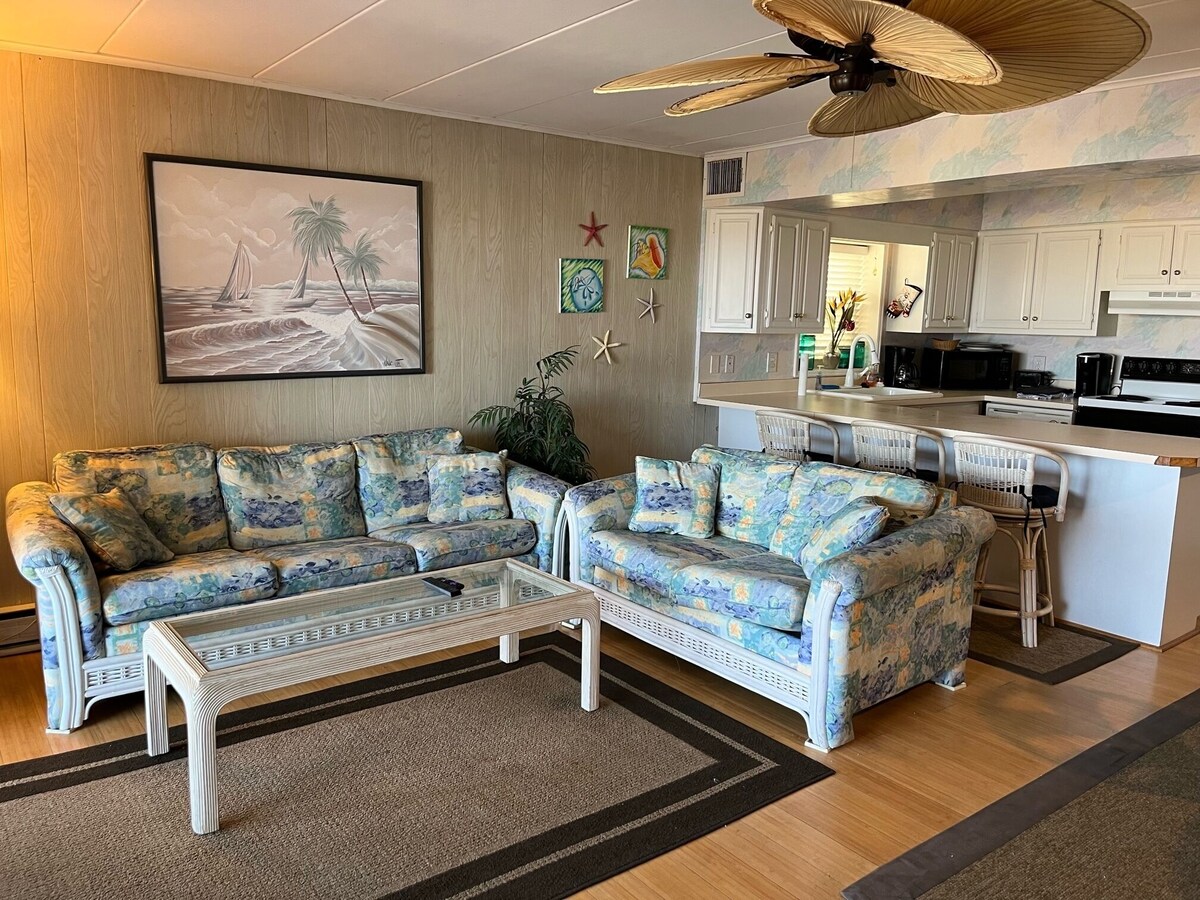 Come enjoy your summer family vacation in our humble oceanfront condo which we are making available whenever we aren't using it for our own summer family vacation. This is a first floor unit so there is a view of the sand dunes but not the ocean. Also, this is an older condo and has not been updated. First floor is ideal for families with younger children and is stocked with numerous beach toys, 2 boogie boards for older children, 8 beach chairs, a heavy duty beach umbrella, 2 beach blankets and a beach wagon to haul it all! Bring the children/grandchildren and create precious fun memories together! A fully stocked kitchen offering many pots, pans, bakeware, utensils, microwave, blender, Keurig coffee maker and a traditional coffee maker. There is a dining table for family meals and 3 countertop stools which are ideal for breakfast, lunch and snack time. Bedroom #1 - 2 double beds, a smart TV and its own small bathroom. Bedroom #2 - King bed, a smart TV and next to the hall bathroom. Queen Pullout Sofa in the Living Room for additional bedding. LINENS PROVIDED: Bath Towels, Hand Towels, Washcloths, Kitchen Towels, Beach Towels, 2 Beach Blankets and Bed Sheets/Pillowcases and Comforters for each bed including the Queen Sofa Bed. Guest provides all soaps and paper products. Free Basic Cable and WiFi Internet Service. Washer and dryer in the unit for your convenience. Gentle Reminders: This is a Non-Smoking Unit and that includes No Smoking on the balcony. Saturday to Saturday Rentals during Peak Summer Season. Our prices include all fees. No hidden fees.