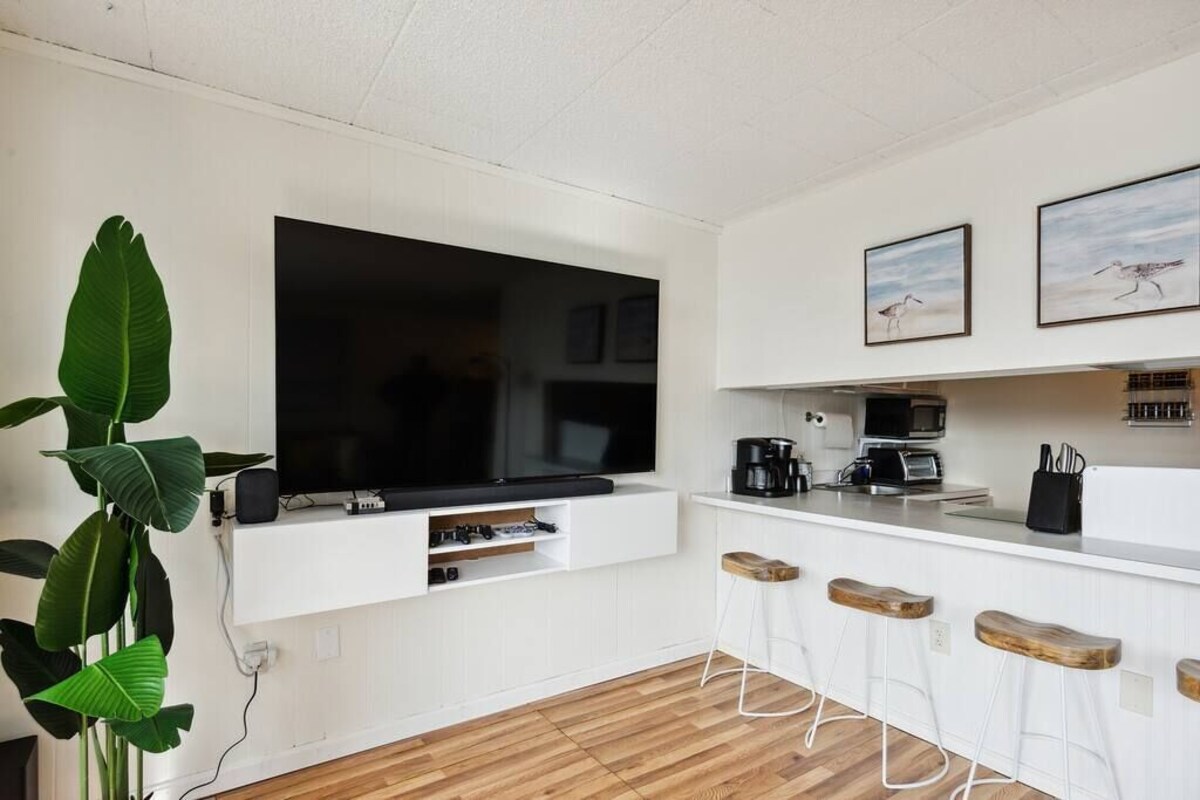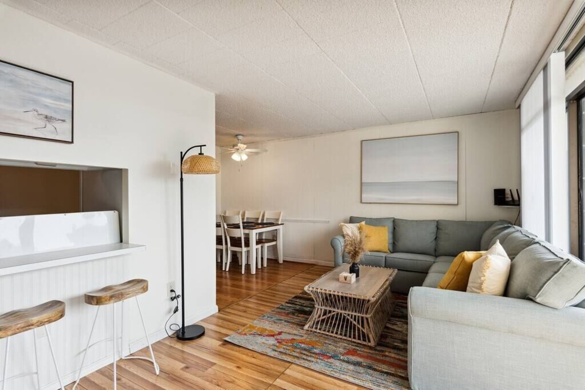 As soon as you step foot in this beautiful condo, you're greeted by the gorgeous yet highly comfortable open-concept living area, decorated in an elegant manner that complements the fantastic beachside location. The fully equipped kitchen blends with the dining area, offering a space to cook and enjoy tasty delicacies with your loved ones before unwinding in the entertaining living room, setting the scene for unforgettable evenings. Natural sunlight bursts through many windows and balcony doors, making the home shine bright during the day, accenting the hardwood floors and tastefully picked furniture, and enhancing the pleasant setting. Rest in the two comfortable bedrooms, which boast 5* hotel comforts that allow you to recharge after an exciting day of sightseeing and beach-hopping. But wait! The best is yet to come! Step out onto the private balcony to catch a breath of fresh air and savor an al fresco meal worthy of the most praised restaurants. There's so much to do in this inviting condo. We look forward to you experiencing its complete comfort and coziness. ★ LIVING ROOM ★ You will feel right at home! Take a moment to unwind, sink into the comfortable sofa, watch your favorite show, listen to some tunes, play board games, or plan your upcoming Ocean City adventures. ✔ Comfortable L-Shaped Sofa with Pillows (can be converted into an extra Queen Bed) ✔ 75” Smart TV with Disney+, Hulu, Netflix, Roku ✔ Gaming Console ✔ Infinity Game Table (over 50 classic board games) ✔ Bluetooth Soundbar with a Smart Home Speaker ✔ Stylish Coffee Table ✔ Reading Lamps ✔ Access to the Balcony ★ KITCHEN & DINING ★ This fully equipped kitchen boasts modern appliances, making it easy to whip up anything from delicious breakfasts to gourmet dinners. With ample countertops, you'll have plenty of room to showcase your culinary skills. ✔ Microwave ✔ Stove ✔ Double Oven ✔ Toaster ✔ Blender ✔ Coffee Makers (Keurig Machine, Drip Coffee Maker) ✔ Refrigerator/Freezer ✔ Dishwasher ✔ Sink - Hot & Cold Water ✔ Plates ✔ Glasses ✔ Silverware ✔ Pots & Pans Unwind and catch up with your loved ones on the balcony while the food is getting ready. When done, serve it on the dining table and enjoy a delicious meal in an inviting and warm atmosphere. ✔ Dining Table with Seating for 6 ✔ Kitchen Bar with Seating for 4 ★ SLEEPING ARRANGEMENTS – 2 BEDROOMS ★ After an exciting day of soaking up the sun at the nearby beach, you will look to rest for an equally entertaining tomorrow. Once you are ready to relax, please make your way to these comfortable bedrooms. ♛ Master Bedroom: King-Size Bed, Ensuite Bathroom ♛ Bedroom 2: Two Twin Beds All bedrooms share a similar set of amenities. ✔ Premium Mattresses, Linens, Sheets, and Pillows ✔ Smart TVs with Youtube TV (Cable), Hulu, Netflix, and Disney+ ✔ Closets with Hangers and Shelves ✔ Dressers with Spacious Drawers ✔ Night Stands with Reading Lamps ★ BATHROOMS ★ In addition to the master bedroom's ensuite bathroom, the home features another full bathroom that caters to the remaining bedrooms and the living area. All are stocked with pampering towels and essential toiletries to ensure a carefree stay. ✔ Bathtub with a Shower ✔ Vanity ✔ Mirror ✔ Toilet ✔ Towels ✔ Hair Dryer ✔ Essential Toiletries ★ BALCONY ★ A stunning getaway would not be complete without a private space where you can take in the tranquility of the outdoors. Step onto the balcony to unwind in the lovely setting that offers a glimpse of the majestic ocean. ✔ Dining Table with Seating for 6 Find your happiness in this attractive oasis. It offers a place to escape the everyday hustle and bustle, cuddle on the sofa, watch a movie, and explore exciting Ocean City attractions. Please let us know if you have any questions regarding our retreat. Happy Travels! Our prices include all fees. No hidden fees.