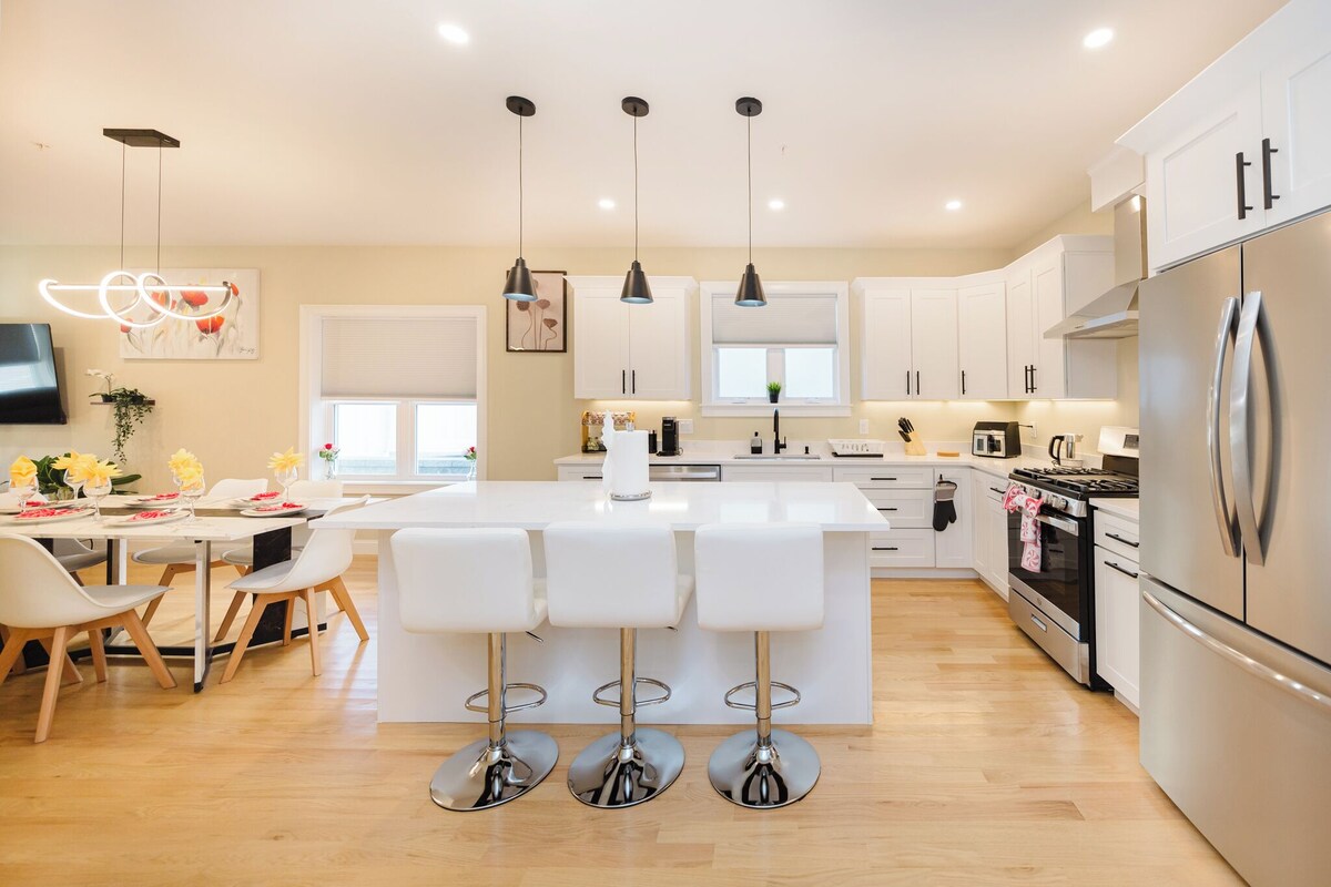BE ONE OF OUR FIRST GUESTS AT OUR NEWLY BUILT HOME! Welcome to our newly built townhouse! This spacious apartment, located on the first floor, spans 1700 sq. ft. It’s perfect for families or friends, offering comfort, privacy, and relaxation. In a peaceful neighborhood at the heart of the city, you’ll experience local lifestyle and connect with friendly neighbors. Enjoy easy access to Blue Hills Reservation and downtown Boston! The space We’re proud to offer you a beautifully designed 1700 square-foot space with all the comforts of home: 🛋️ Living Rooms: Two comfortable living rooms, each with cozy sofas and premium UHD TVs, perfect for relaxing and enjoying time together. 🛏️ Bedrooms: 1. Bedroom 1: King Bed + 1 Bunk Bed (twin over twin) 2. Bedroom 2: 1 Queen Bed 3. Bedroom 3: 1 Queen Bed + 1 Bunk Bed (twin over twin) 4. Bedroom 4: 2 Queen Beds + 1 Bunk Bed (twin over full) 🍳 Kitchen: Fully equipped to make you feel at home. 🛁 Bathrooms: Three full bathrooms, each stocked with fresh towels, shampoo, and shower gel. 🌟 Amenities: Free Wifi & Parking Bedsheets, shampoo, shower gel, and hair dryer Central air conditioning and heating Washer/dryer Laundry area is set up inside the house for your convenience. Guest access 🔑 Self Check-In: Convenient self check-in using a keypad. 🐾 Pets: Your furry friends are welcome! 🚗 Parking: 1 parking spot reserved at the rear of the house, with additional free street parking available in front of the house. The Host is not responsible for parking tickets or violations. Other things to note **Additional Information 📞We live nearby and are available via phone or Vrbo messaging to assist with any questions during your stay. 1. Early Check-In and Late Check-Out: Available upon request, subject to availability. 2. Supplies Provided: We stock essentials such as toiletries, cleaning supplies, and coffee pods for your convenience. 3. Nearby Dining and Activities: The area offers a wide range of dining options, cafes, and recreational activities within a short distance. 4. Special Requests: Let us know if you have any special requests or need recommendations for local attractions, restaurants, or services. 5. Extra Guest Fee: After 6 guests, an additional fee of $25 per guest per night applies. Pet Fee: $35 per pet per night. 6. Security: - Cameras at the entrance for your safety. Blocking or disconnecting these will lead to immediate termination of your stay with no refund. - Smoke alarms and safety features are in place. 7. Registered Guests Only: Accommodates up to 17 guests. Unregistered guests are prohibited. Occupancy will be verified via cameras. **House Rules & Policies 🕒 Check-In: 3 PM | Check-Out: 11 AM 🔞 Age Requirement: 18+ to book, government ID required. 🚭 Smoking, Drugs, and Vaping: Not allowed inside and outside the property. A $250 fine will be imposed if violated. 🎉 Parties & Loud Music: No parties allowed. Quiet hours are from 10 PM - 7 AM. If it is determined that guests are having a party or neighbors report complaints/call the police, guests will be asked to leave immediately without refund. A $250 fine will be imposed. ⚠️ Disclaimer and Liability Waiver By staying at this property, all guests acknowledge and agree to the following: Assumption of Risk: Guests assume all risks associated with their stay, including but not limited to accidents, injuries, or loss of personal belongings. Liability: The host is not liable for any injuries, accidents, or loss/damage to personal property occurring on the premises during the guest’s stay. Damages: Any existing damage or broken items must be reported and confirmed at the time of check-in. Guest Responsibility: Guests are fully responsible for any damage or loss that occurs during their stay. Deposit Use: In the event of damage or loss, the host reserves the right to use all or part of the security deposit to cover repair or replacement costs. Further charges may apply if damages exceed the deposit amount. 👶 Overnight Guests: Guests exceeding the number stated in the reservation are not allowed. Children must be included in the reservation count. Violation results in a $200 penalty per person, per night. 📦 Mail & Packages: We do not allow mail or packages to be sent to the property. Items (e.g., Amazon) can be delivered to the door or a local FedEx/UPS store. 🎬 Special Activities: Without written consent from the Host, activities such as filming, professional photography, events, or music recording are prohibited and will incur additional location fees. Contact the Host for location fees. 🏠 Property Care: Guests are expected to keep the property and furnishings in good order and maintain a respectable level of cleanliness. ⏳ Late Check-Out: Unauthorized late check-out will incur a $100/hr fee. Check-out time is 11 AM. 💡 Booking Confirmation = Rule Agreement: By proceeding with this booking, you agree to the terms outlined above. Let’s ensure a safe and enjoyable experience! Our prices include all fees. No hidden fees.