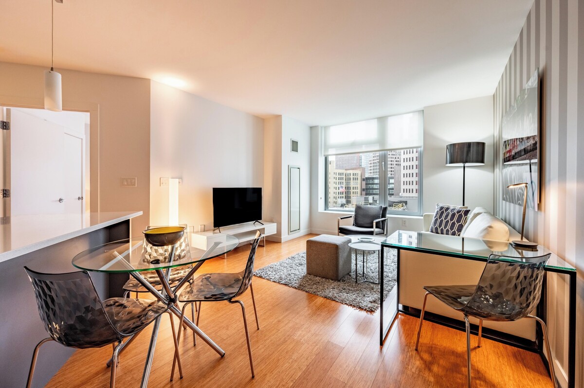 This apartment is professionally managed by Furnished Quarters, the largest independently owned and operated supplier of short-term furnished housing with over 25 years of experience in the industry. Located in Boston's Financial District, this elegantly curved 26-story glass tower has the Rose Kennedy Greenway at its doorstep. Building amenities include resident lounge, fitness facilities, outdoor space and more.This newly designed one-bedroom apartment features floor-to-ceiling windows, hardwood floors, granite counter-tops, upgraded stainless steel appliances and front-loading washer/dryer in the residence. All beds provided are fitted with plush linen sheets and pillows. All Furnished Quarters apartments include 24/7 guest service. Pets are allowed in select apartments and are subject to a $500 non-refundable pet sanitation fee for one pet, $750 for two pets. Additional charges and size/breed restrictions may apply and vary by building. All pets must be approved by Furnished Quarters. Please let us know ahead of booking if you plan on traveling with a pet. Our prices include all fees. No hidden fees.