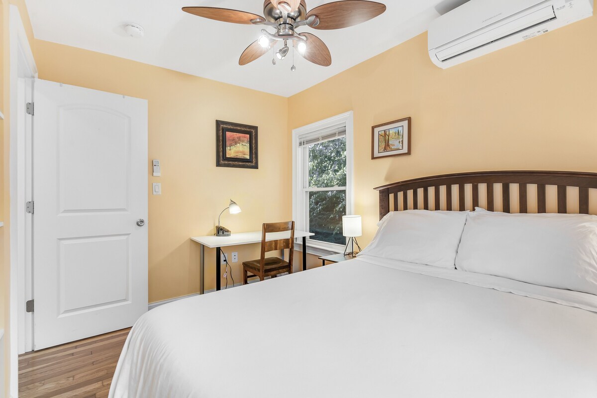 Welcome to your home away from home! This spacious and comfortable retreat features 4 large bedrooms and 2.5 modern, sparkling-clean bathrooms, ideal for families, groups, or remote workers. Enjoy a full kitchen with stainless steel appliances, gas stove, cozy living room, basement with washer/dryer, and backyard patio. Includes WiFi, TV, AC/heat, and two private parking spots. Walk to Harvard Business School, Trader Joe’s, and Allston restaurants. Pet-friendly and fully yours to enjoy! The space Everything in our home is newly renovated. There is a large living room, open dining room, and full kitchen which comes complete with stainless steel appliances + gas stove. There is also quiet backyard deck/patio. SECOND FLOOR (3 bedrooms + 1 full bathroom): The first bedroom (red) has a queen bed, chair, cubby, and bright windows. Your closet is super spacious, and we provide an iron and board. The second bedroom (yellow) has a double bed (full-size mattress), desk and chair. The third bedroom has a double bed, a twin bed, desk and chair and floor to ceiling windows. You will have access to a full bathroom on the second floor. It has a shower/tub and hair dryer. There is also a nice half-bath on the first floor you can use. THIRD FLOOR (Master Bedroom + 1 full bathroom + Private Outdoor Deck) The final and largest bedroom is the master bedroom on the third floor with a queen bed. It is very spacious and has large sliding floor-to-ceiling windows. There is a large walk-in closet and walk out deck. The third floor has it's own ensuite master bathroom with a double vanity and designer waterfall porcelain shower. Each room has a ceiling fan and individualized air conditioning / heating units. Guest access As a guest you will have access to the entire home: one master bedroom + ensuite bathroom on the third floor, three bedrooms and a full bath on the second floor and the entirely of the first floor, including all the common areas from the dining room, living room, bathroom, kitchen, patio, and deck. This energy efficient home has modern heat pump units and air conditioning in every room that will give you your own personalized temperature quickly. Our prices include all fees. No hidden fees.