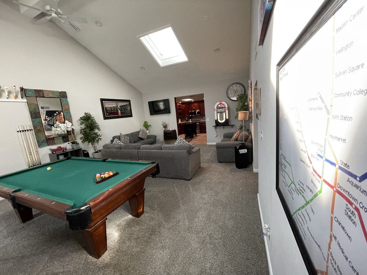 5 bedroom 2 bathroom large living room with cable tv, pool table, ping pong , juke box ,darts and a fully equiped kitchen for all your culinary needs. Perfect for bachelorette or bachelors visiting Boston. Located above a great Irish Bar called \