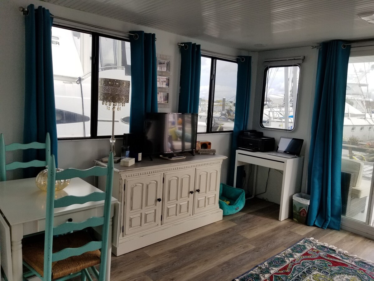 Skip the hotel and do something really unique and fun! Experience Boston from the perspective of your own floating home! Nestled in a protected marina in Boston Harbor, our houseboat is fully equipped with all the comforts and amenities of home! The boat is fully air conditioned in the summer and heated during the winter. The covered front deck has outdoor seating. Sip your cocktail and watch the harbor traffic . Free Wi-Fi is included in your rental. Perfect for 2 it can also be an economical choice for 4 with the sleep sofa in the living room. We are located in the Charlestown Marina. Accessible via water taxi, car, or taxi. Walk to the USS Constitution, Bunker Hill , TD Garden and the North End. MBTA water shuttle is a short walk. UBER readily available. Parking is available at $25 per day and must be reserved ahead or spaces can be full. Located in a very secure and gated marina, our houseboat is just minutes away from downtown Bostons' most popular attractions; Fanueil Hall/Quincy Market, the North End, the New England Aquarium, the Children's Museum and the Boston Convention Center. Our convenient location makes it easy for you reach points of interest. Traveling nurses please note. We rent our houseboats from November 1 to March 1 for $1500 per month plus electricity. Our prices include all fees. No hidden fees.