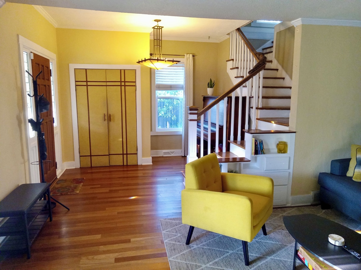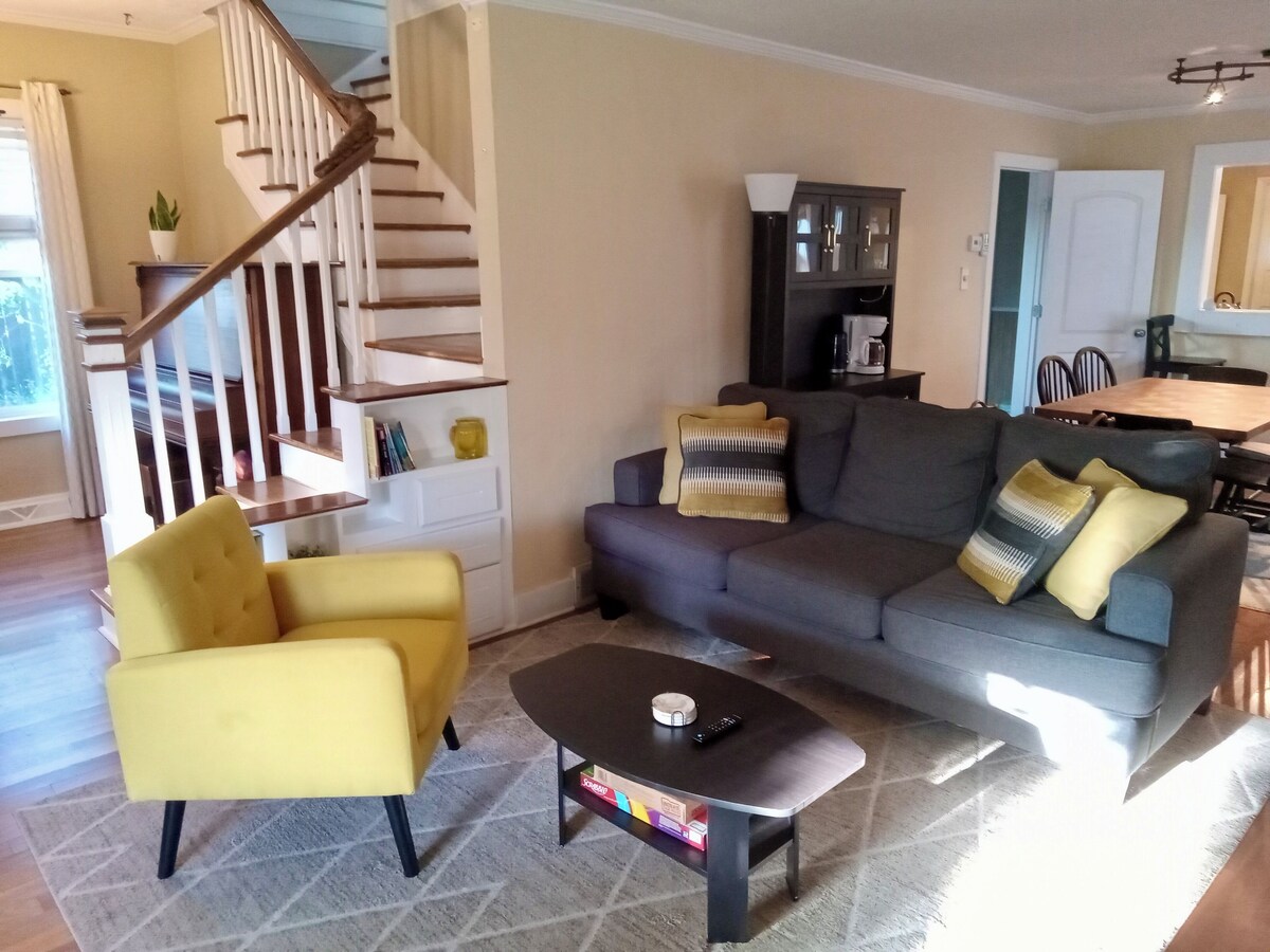 Your home away from home in Denver with 3 bedrooms. This delightful house, built in 1893, greets you with a grand entrance of an imposing custom-constructed staircase and hardwood floors. The main living room features a queen-sized sofa bed and wood-burning fireplace, perfect for relaxing after a day of work. The upstairs living room features social space and desk space for work or play. There are also 2 twin air mattresses available for additional sleep space as needed. Puzzles, board games, a piano, books, and Smart TVs in both living rooms are available for your entertainment. The bedrooms offer a mix of sleeping arrangements, including a queen bed, full bed, and twin trundle convertible to a king bed. Enjoy the convenience of amenities such as WiFi, hair dryers, Alexa Echo on both floors, black-out blinds in upstairs bedrooms, and a jetted bathtub in the master bathroom. Feel at ease knowing there's a washing machine and iron available for your use. Make yourself at home with a generous kitchen with all basic appliances and amenities, stocked with enough coffee, tea, and popcorn to settle you in. Enjoy views of downtown Denver to the east and a tease of the mountains to the west. Feel secure with security system and keyless locks on site. Fenced-in backyard provides a quiet, idyllic oasis against the backdrop of city life. Relish fresh eggs from free range chickens in the backyard coop. (Chickens tended to daily by Property Manager.) Exercise your green thumb by spending time in the lean-to greenhouse. Have a quiet evening spending time grilling with friends under the covered porch, furnished with patio table and chairs. Set out an umbrella, table, and chair next to the waterfall to enjoy the pond. Residents also enjoy exclusive use of the height-wise oversized 2-car garage. Pets are also welcome and can enjoy backyard access through a doggie door. House is conveniently located 2-5 minutes from both I-70 and I-25, making it a quick getaway to your next adventure! This exceptional location is also walkable to several area restaurants and convenient public transport, notably in close proximity to: -Colorado Rockies baseball stadium - 2 miles away -Denver Broncos football stadium - 2.5 miles away -Ball Arena - 3.5 miles away -16th Street Mall - 3 miles away *Take note that the house has a few spots with low ceilings that may be uncomfortable for those taller than 6'4\ ,