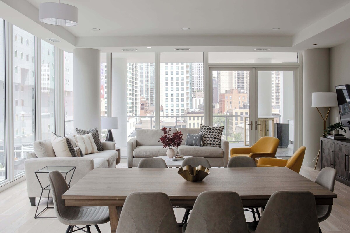 Summary: BRAND NEW LOFT IN RIVER NORTH! Enjoy your new private luxury loft in Chicago's newest and most luxurious building in bustling River North-the city's center of main nightlife and restaurants. This ultra high-end apartment features a private elevator, private terrace, free secured parking, 24 hour doorman, 3 bedrooms/3 bathrooms, and is perfect for families traveling to Chicago, professionals visiting the city on work trips, and everything in between. The cityscape views are unbeatable! The Space: Part of our luxury loft collection, our unique one of a kind lofts are located in Chicago's newest luxury building with views overlooking the city and are the most high-end rental offering in the city. Everything flows around the spacious and open living room and chef's kitchen, add the floor to ceiling windows with connecting outdoor patio and the space becomes a unique environment for entertaining and gathering with your group. Your spacious living room is decorated in modern contemporary art and features a large sectional, accent chairs, dining table for 12+ people, smart 65 inch TV (Netflix, Hulu, Prime, etc. compatible) and bluetooth speaker for entertainment. Attached to the dining room, the chef's kitchen is outfitted with gas-powered Gaggenau ranges, Gaggenau oven and microwave, restaurant sized refrigerator and freezer, plenty of cabinetry, plates, cups, and cutlery in addition to state-of-the-art kitchen appliances including a coffee maker, amongst others. In addition, enjoy your own large private covered terrace with seating and dining options (provided during the nice weather), truly a unique offering and extension of the living area! This one of a kind loft comfortably sleeps 16+ people and has 3 bedrooms and 3 bathrooms. The main bedroom with a king bed, full bath. The second bedroom can sleep up to eight people and features two full-over-full bunk beds, full bathroom with soaking tub, perfect for both children and adults. Lastly, the third bedroom can sleep two people, with two side-by-side twin xl beds. Sleeping arrangements/room layout: Main bedroom (bedroom 1): King Bed, private bathroom with tub and shower Bedroom 2: Two full-over-full bunks bed, private bathroom with shower and large soaking tub Bedroom 3: Two side-by-side twin xl beds Our units are made up fresh before each guest and their group arrives. Our cleaning services that we use on all of our properties do a thorough job of cleaning all areas, focusing on high touch point areas. Each bed is striped and all sheets, pillow covers, and duvet covers are washed thoroughly after each stay. To abide by all legal requirements and building security rules, you may be asked to provide a copy of your official government-issued photo ID, confirm your contact information, provide a valid credit card with a name that matches your ID, pass through our verification portal and, in some instances, complete a criminal background check. Important note: The information is collected for screening and verification only and is not stored or used for any other purposes. Please be advised that all guests will be asked to sign a rental usage agreement that governs the terms of the stay. By completing the reservation you agree to the following: -You agree to be bound by our rental terms and conditions. -You acknowledge that you will be required to provide a copy of a valid government-issued ID and matching credit card prior to check-in. -You acknowledge that you may be required to undergo a background check if mandated by the property management company or the building, as stated in accordance with your rental agreement and the condition of the booking. -You understand that your check-in instructions might be withheld until you have successfully completed our verification portal. Guest Access: You will have full access to all rooms and spaces inside the unit, except for one utility closet. Temporary access codes will be shared 24 hours before rental commencement by email. Other Things to Note: Our building is a highly secure building with 24/7 doorman and secure covered parking garage. Interaction with Guests: We pride ourselves on making our guest's stay as enjoyable as possible. We live in Chicago and are available should anything come up. Our prices include all fees. No hidden fees.