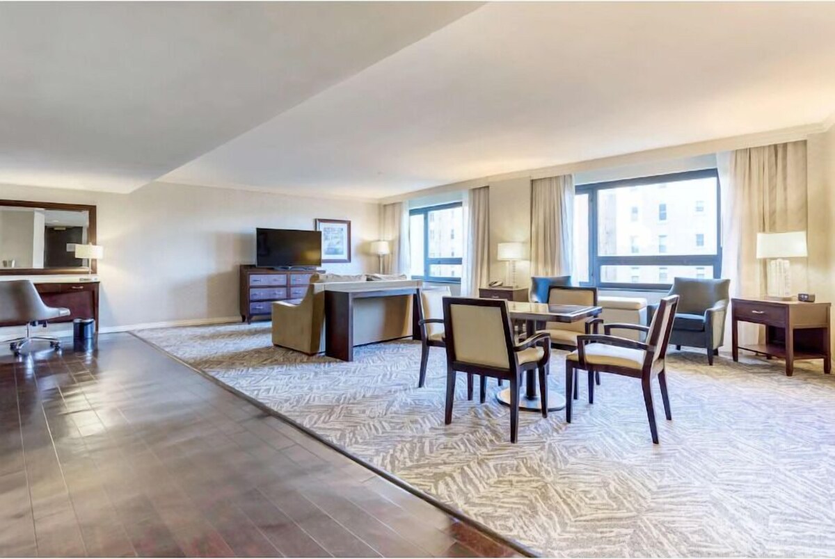 The hotel offers guest rooms and suites, complete with premium bedding, flat-screen TVs, and work desks with ergonomic chairs. Guests can enjoy free access to the seasonal outdoor swimming pool and the fitness center. There is also a variety of dining options with two onsite full-service restaurants, bars, and a coffee shop. For visitors looking to stay connected, the hotel offers complimentary high-speed Wi-Fi and a 24-hour business center for those working on the go; Add to that business facilities for meetings, and event spaces for any type of affair. PLEASE NOTE: This listing is specifically for a hotel room located within a hotel, distinguishing it from typical residential or apartment accommodations. - The property requires a damage deposit of USD 100/night/unit on the credit/debit card provided. The deposit is required for EACH UNIT and is refunded IN FULL upon check-out. - Early check-in is subject to availability upon arrival. - Following property rules, the minimum age required for check-in is 18 years old. We're delighted you're considering RoomPick’s curated selection of boutique hotels, condo hotels, and resorts worldwide. This room comes with: THE UNIT This 1,094 sf DUPONT SUITE 1 KING BED features: - 1 King Bed; - 1 Sofa Bed; - Living area; - Kitchenette with coffee maker, microwave, refrigerator, full sink; - Dining area; - Desk and ergonomic chair; - Flat-screen TV with cable channels; - Daily housekeeping; - All linens, towels, and bathroom essentials are provided. You don’t need to bring a thing!! THE PROPERTY Our family & pet-friendly property provides the following on-site amenities: - 24-hour front desk and security; - Concierge service, luggage storage, tour desk; - Seasonal outdoor swimming pool with loungers and umbrellas; - Restaurants, bars, coffee shop/cafe; - Terrace; - Outdoor fireplace; - Fitness center; - Business center; - Meeting/banquet facilities; - Fax/photocopying services; - Mini market; - Vending machines; - ATM/Cash machine; - Currency exchange; - Laundry & dry cleaning services; - Pets are allowed for an extra charge of USD 75 (1-2 nights) or USD 125 (3+ nights) per accommodation, per stay (2 per room); - Private parking is available (parking slot reservation is not required in advance) and costs USD 54 per day. Please ensure you have a valid ID for check-in, as it is mandatory for entry. Our prices include all fees. No hidden fees.