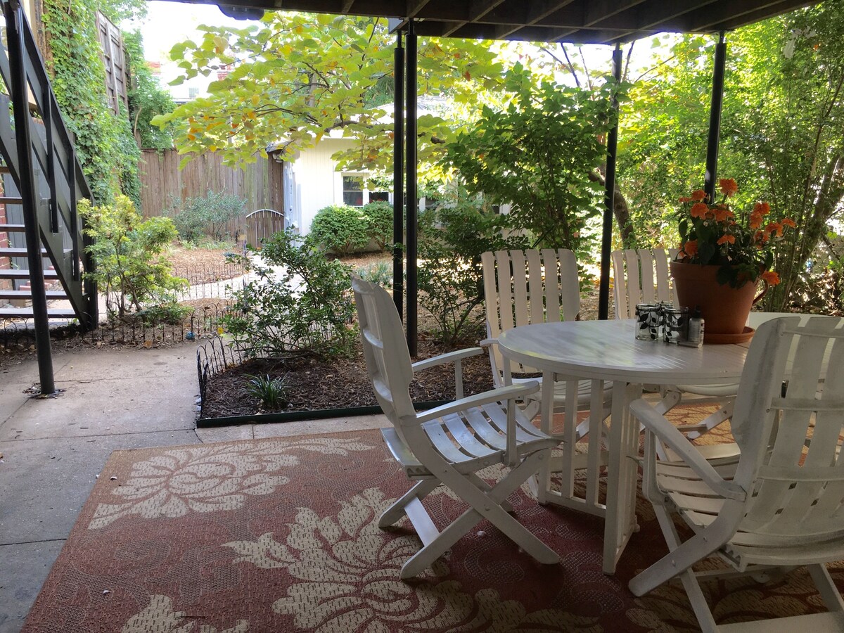 Steps from central Mount Pleasant and the Saturday farmers' market, the available apartment is the in-laws' suite below our \ townhouse on historic Lamont Street. The apartment has its own entrance off Lamont Street, and is not directly connected to our residence. A cozy, well appointed apartment in great location, is a delightful alternative to staying in a hotel but with all the same amenities, ideal for business travel or family vacation. Private entrance off street, shaded patio in tranquil back yard. Easy walks to Zoo, Rock Creek Park, and Metro. HABLAMOS ESPANOL. PARLONS FRANCAIS. Our prices include all fees. No hidden fees.