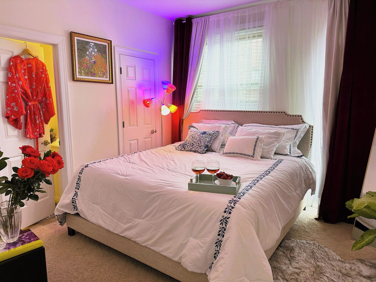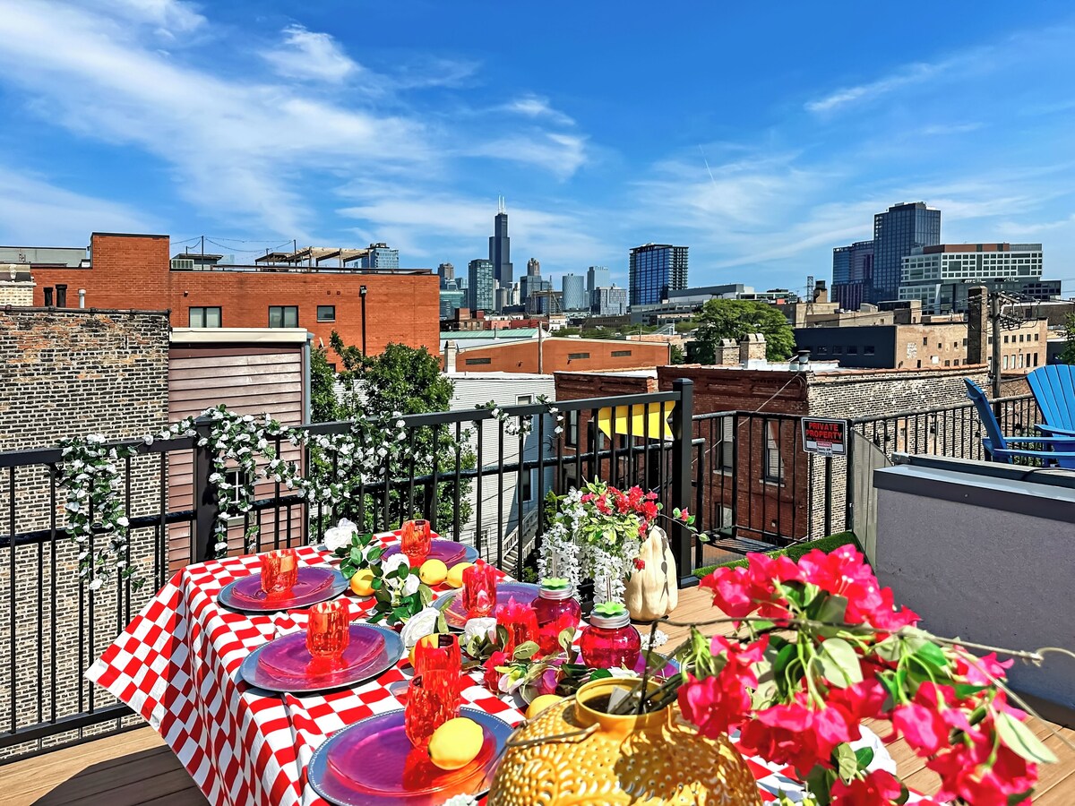 Welcome to Your Chicago Getaway This spacious home comfortably accommodates up to 12 guests, ideal for romantic getaways, family reunions, or gatherings with friends. With private keyless entry and a car garage, check-in is seamless and hassle-free. Perfectly located near Chicago’s top attractions, renowned restaurants, and vibrant nightlife, this home offers the perfect blend of comfort and convenience for an unforgettable stay. Key Features: - King Suite: Lux King bed, Fireplace, Smart TV, and a spa-like steam shower. - Queen Suite : 2 Queen beds , Smart TV, Fireplace - Private car garage + EV Charger for added convenience - Roof deck: Incredible views of the Willis Tower - SaluSpa Hollywood AirJet Hot Tub - Fully stocked kitchen with a balcony. - Coffee Bar: Equipped with a Nespresso coffee & a French press. - 65\ s best restaurants 2 minutes to the United Center Arena (games & concerts) 5 minutes to Grant Park & Michigan Avenue 10 minutes to Lake Michigan 7 minutes to the Medical District Guest access Living Room The living room is the heart of the home, designed for comfort and connection. Sink into the cozy seating while streaming your favorite shows on the 65” Smart TV with Netflix, Disney+, and Prime. The open layout and stylish décor create the perfect atmosphere for relaxing or catching up with loved ones. Kitchen The fully stocked kitchen is a chef’s dream, equipped with modern appliances, cookware, and utensils. Whether you s the perfect spot to fuel up before heading out to explore Chicago. King Suite The luxurious King Suite offers a serene retreat, complete with a cozy fireplace, a flat-screen TV, and a spa-like steam shower. Whether you ,