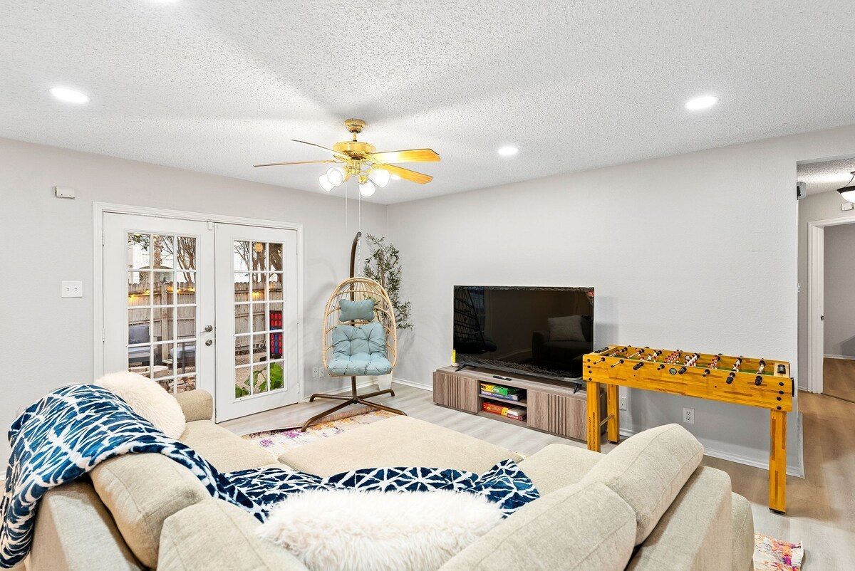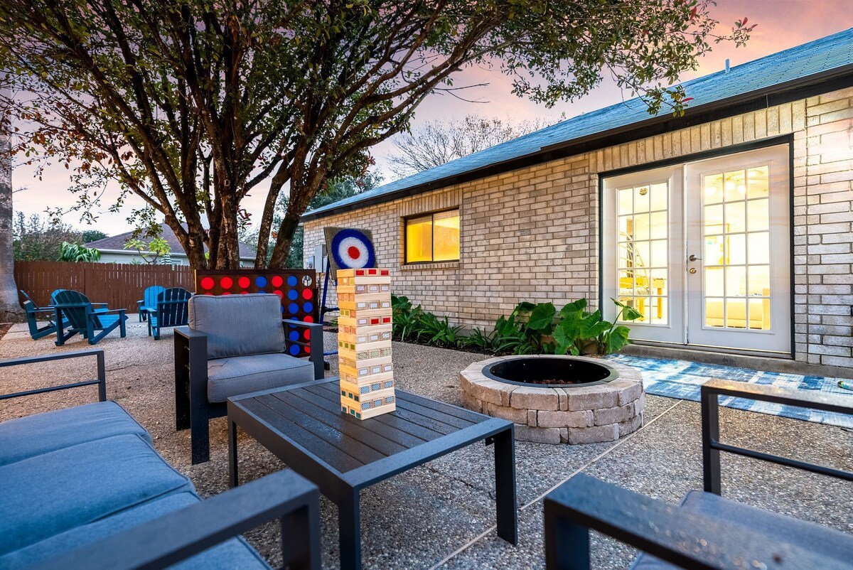 Welcome to Villa @ April! 3-bedroom villa with a patio and amenities. Perfect for a family gathering or short escape. Inside the villa, you will love the cozy rooms with comfy beds (1 king, 1 queen, 1 bunkbed twin over full). Enjoy your time with foosball, board games, and large TVs in every room. In the backyard, you have full access to the private pool, firepit, BBQ and life-size games. We love to accomodate families, and have pack & play and high chair ready. 12 mins / 7 miles to Seaworld 18 mins / 10 miles to Six Flgas 20 mins / 15 miles to Lackland 25 mins / 19 miles to Riverwalk 15 mins / 6 miles to San Antonio Aquarium Pool is not heated Our prices include all fees. No hidden fees.