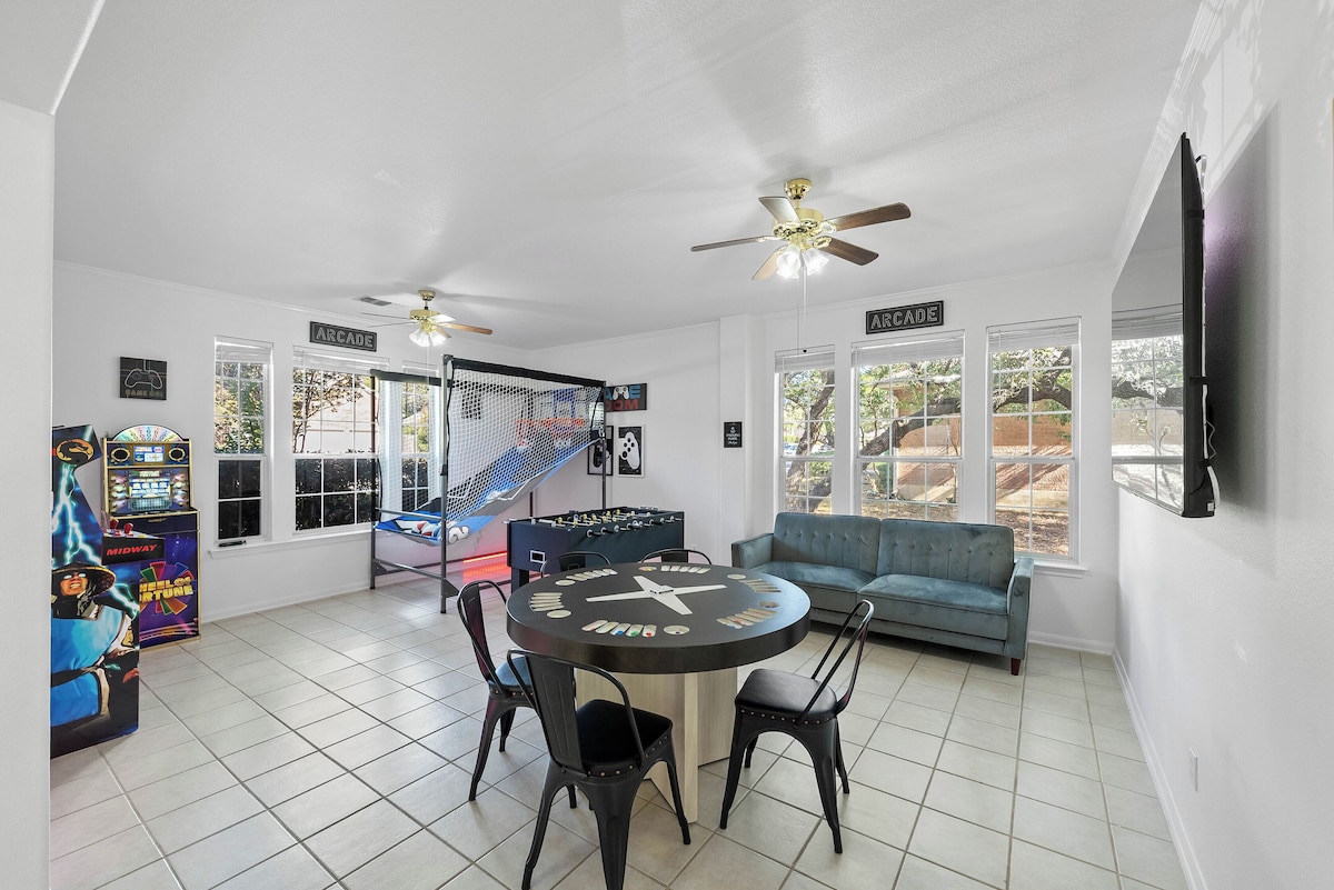Your FAMILY vacation starts here! Rent this gorgeous, renovated home today and get ready for SA attractions galore! Beautiful 5 bed/3.5 bath home w/ private jacuzzi accommodates up to 16 guests. Large open floor plan w/ loaded kitchen and TVs in every room! We are here for you during your stay, but our level of interaction is up to you. I’m only a message away. You will be able to self-check in upon arrival. 😎 Seaworld is 3 miles 😎 Six Flags Fiesta Texas is 19 miles 😎 Lackland Air Force Base is 9 miles 😎 The Tower of the Americas is 17 miles 😎The River Walk (and Alamo) is 17 miles 😎The Pearl is 17 miles 😎 The San Antonio Zoo is 19 miles 😎 Fort Sam Houston is 20 miles 😎 Schlitterbahn Water Park (New Braunfels) is 45 miles 24/7/365 Contactless check-in. Guests have full access and complete privacy inside the home and may enjoy full use of outdoor amenities. Instructions for access, check-in, checkout, and directions to the home are provided in the house manual on your booking channel. When checking out, please be sure all windows and doors are locked before your departure. Other things to note If you have any questions about the property or need any additional information regarding calendar availability, directions, parking, access, or check-in/check-out procedures, don't hesitate to get in touch with us directly using the message center on your booking channel. Completely renovated and beautifully furnished throughout, this stylish five-bedroom luxury home includes: • Amazing private backyard with Hot-TUB! • Dedicated game room with tons of seating! • Separate bonus room and game room with arcade style games, poker table, and foosball table! 3.5-bathroom house with Spa-like en-suite master bathroom and a HUGE walk-in closet. • Large, fully appointed kitchen with all appliances including stove, oven, coffee maker, refrigerator, dishwasher, and microwave. • Full laundry room w/ washer and dryer. • Modern living room with comfy sofa and large screen Smart HDTV. • Modern dining room table that seats eight with eat-in kitchen breakfast bar. • Luxurious bedrooms with Smart HDTVs in each room. • Private fenced backyard with large patio deck perfect for entertaining or relaxing. • High-end sound system for the backyard and a charcoal BBQ grill. • Free high-speed Wi-Fi, off-street driveway parking, free street parking and keyless access. Pet Fee's: There is a $64 pet fee added to your rent for your first pet. This fee is fixed, regardless of the duration of your stay. Any additional pets are charged separately at $12/ per night per pet. ❤️ Gated Community ❤️ Huge House w/ up to 16 guests ❤️ Near SeaWorld & 6 Flags ❤️ Foosball table, poker table & Hot TUB! ❤️ Near Northside Sports complex ❤️ Arcade - Wheel of Fortune, Big Buck Hunter, & Mortal Combat ❤️ Dedicated game room ❤️ Pets allowed ✅Book Now Our prices include all fees. No hidden fees.