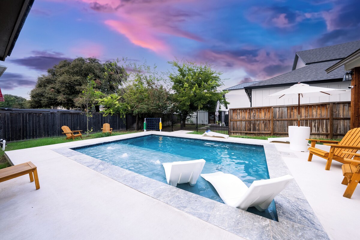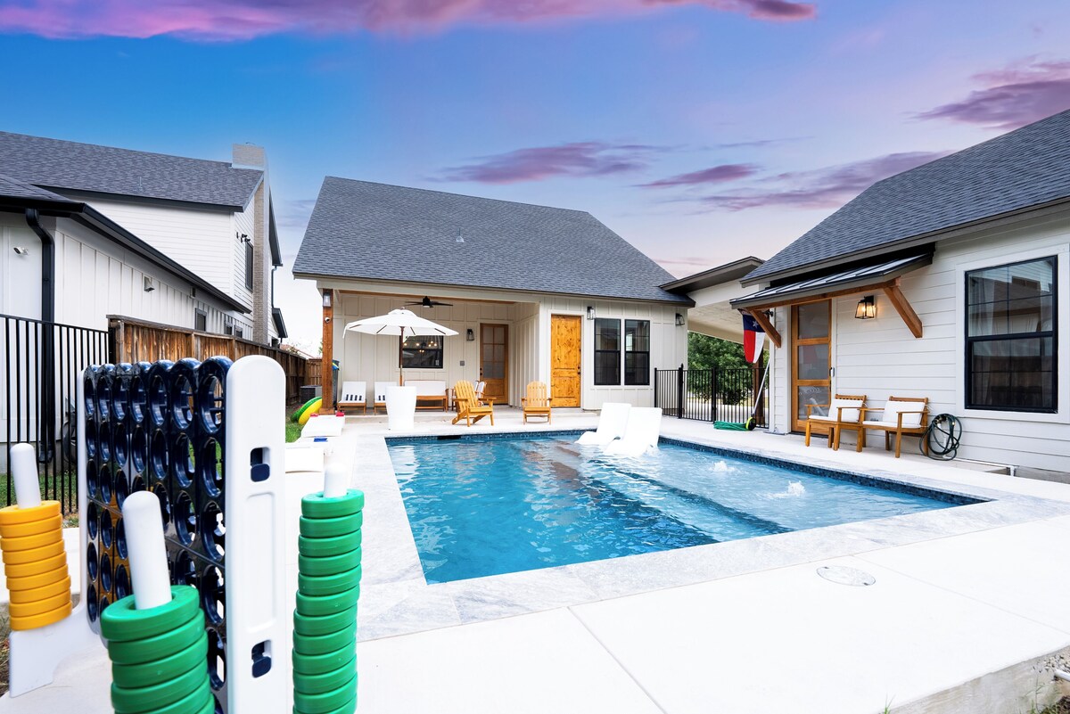 Relax with the whole family at this peaceful place to stay. Welcome to our luxurious custom-built 3-bedroom home in the heart of San Antonio, Texas! Offering modern style, comfort, and a shared pool, this home is perfect for families or groups up to 8 guests. The space Luxury Custom Build: Spacious design with three queen beds and a comfy sofa bed. Sparkling Pool: Enjoy the shared pool, or relax on the patio with plenty of seating and lounge chairs. Outdoor Fun: Cornhole and oversized Connect 4 offer entertainment for all ages. Fully Equipped Kitchen: Modern appliances and spacious dining area make mealtime easy. Central Location: Conveniently located near San Antonio's top attractions, restaurants, and entertainment. KITCHEN AND DINING • Dining table with seating for 6 • Kitchen island with 4 bar stools for casual meals • Full-sized refrigerator, freezer, microwave, oven, and stove • Toaster, coffee maker, and electric kettle (coffee provided) • Fully stocked with cookware, utensils, and dishware MASTER BEDROOM • Plush queen-sized mattress • Nightstands with lamps • Work Desk with leather office chair • Smart TV for streaming your favorite shows • Closet for storing personal belongings • Window with blackout curtain for a restful sleep SECOND BEDROOM • Queen-sized bed • Nightstands and lamps • Smart TV for streaming your favorite shows • Closet for storing personal belongings • Window with blackout curtain • Full body length mirror THIRD BEDROOM • Queen-sized bed • Nightstands and lamps • Smart TV for streaming your favorite shows • Closet for storing personal belongings LIVING AREA • Comfortable sofa bed, perfect for extra guests or lounging • Smart TV for streaming your favorite shows • Reading material available OUTDOOR SPACE • Shared patio with outdoor seating and lounge chairs • Cornhole and oversized Connect 4 for outdoor fun POOL INFORMATION • Shared pool • NO LIFEGUARD ON DUTY • Quiet hours: 9:00pm – 8:00am • The pool is not heated PARKING • Shared driveway • Driveway is double-wide with designated covered parking for one car for each property. You will be provided information for the side that is designated for your unit with your check-in instructions. • There is additional uncovered parking that can accommodate up to 2 more cars comfortably for each property, as well as ample free street parking **NOTE**: This property shares a driveway, backyard and pool with another home on the same lot. The owners also live next door. Guest access You will have access to the entire home other than the locked linen closet. The yard space and pool are shared. Other things to note **NOTE** The owners also live next door. Our prices include all fees. No hidden fees.