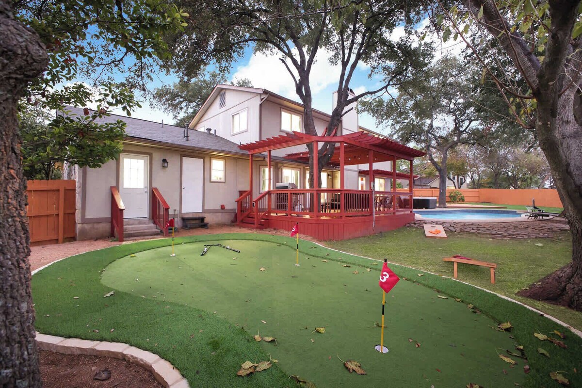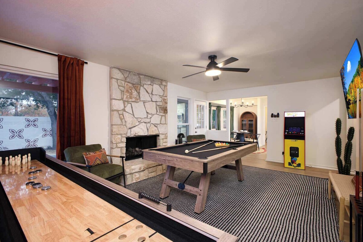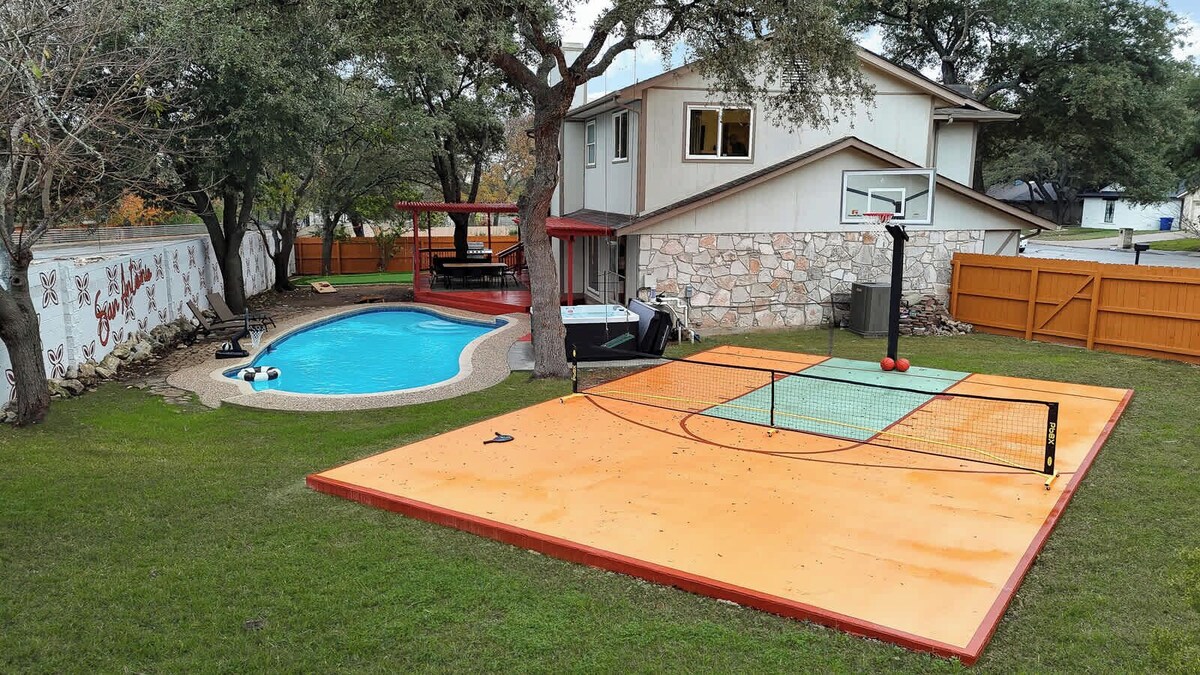 Summary: This 5-bedroom house is jam-packed with amenities & has EVERYTHING you need for an amazing vacation in San Antonio, TX! • Private Pool • Sportscourt: Basketball & Pickleball • Hot Tub • Outdoor Patio/Dining • BBQ Grill • Game Room: Pool Table, Bowling Shuffleboard, Arcade Games & Wet Bar! • Movie Theater • Fully Stocked Kitchen • Putt Putt & Corn Hole • TVs in Each Bedroom • Dedicated Workspace • Indoor Fireplace • Dog Friendly The Space: Nestled in a peaceful neighborhood, our luxurious and spacious home offers the ultimate retreat with resort-style amenities. With 5 bedrooms and 3.5 bathrooms, this stunning property comfortably accommodates up to 18 guests. Conveniently located near top attractions, shopping, and dining, it’s the perfect base to explore San Antonio or simply relax in comfort. Your unforgettable getaway starts here! MAIN SPACES OF THE HOME: – 5 BEDROOMS & 3.5 BATHROOMS – BEDROOM 1 (Lower Level): * King-sized Bed * Smart TV * Nightstand & Lamps * Direct Outdoor Access * Dedicated Workspace * Ensuite Bathroom BEDROOM 2 (Upper Level): * King-sized Bed * Smart TV * Nightstand & Lamps * Ceiling Fan BEDROOM 3 (Upper Level): * King-sized Bed * Smart TV * Nightstand & Lamps * Closet * Ensuite Bathroom BEDROOM 4 (Upper Level): * Double & Queen-sized Bed * Nightstand & Lamps * Full Bathroom BEDROOM 5 (Garage): * 2 Full over Full-sized Bunk Beds * Smart TV * Plush Seating * Ceiling Fan – 3.5 BATHROOMS – * Ensuite Bathroom with a Walk-in Shower * Ensuite Bathroom with Shower/Tub Combo * Full Bathroom with Shower/Tub Combo * Half Bathroom – CHEF’S KITCHEN – * Fully Stocked * High-end Appliances * Large Refrigerator * Ample Cabinetry & Cooking Space * Coffee Makers: Coffee Pot, Keurig & French Press – LIVING ROOM– * 65\ s Mexican Restaurant Cuisine: Mexican Highlights: Authentic dishes like burritos and chimichangas Nonna Osteria Cuisine: Italian Highlights: Tuscan flavors, wood-fired pizzas, and risotto Kumi Cuisine: Asian Fusion Highlights: Sushi and Asian-inspired dishes Getting Around: By Car: Renting a car is a convenient option to explore the area at your own pace. Having a car makes it easy to visit the many shopping centers, restaurants, and other points of interest in the area. Rideshare Services: Services like Uber and Lyft are readily available in the area, providing a convenient alternative to driving. Simply book a ride through the app, and you ,