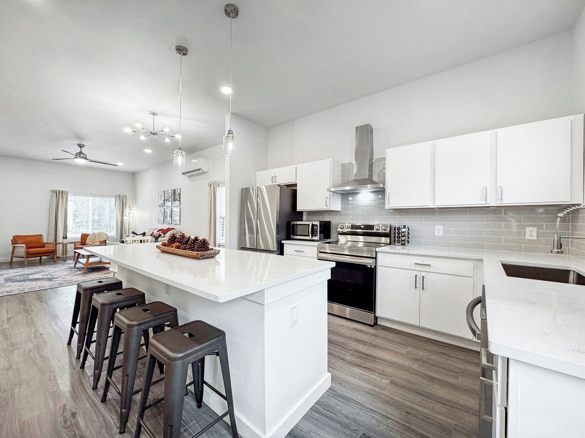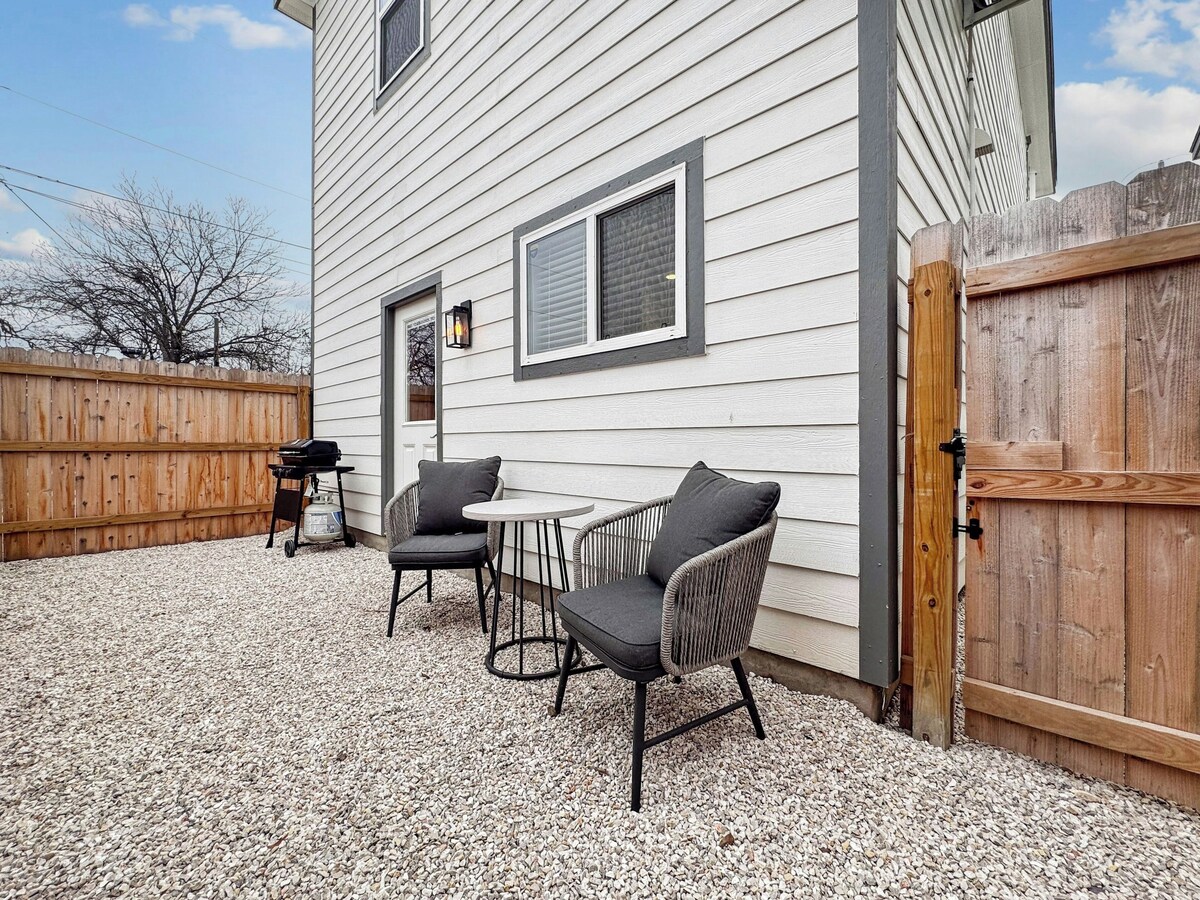 • *NEW*modern home •Short ride to Downtown/. Alamodome • Pet Friendly/Fenced backyard •In BMT Graduation boundaries • 2 driveway parking spots/unlimited street parking • Lackland AFB/Ft. Sam/Sea World /Six Flags are an easy drive away • Fully stocked & equipped kitchen • 3 bedrooms + sleeper sofa • Smart TVs in each room • Fast WiFi/Work area • Central location/1.5 miles from the Alamodome • Nearby Frost Bank Center/Alamo/Riverwalk/Southtown/Pearl ✹ 3 comfortable bedrooms; 1 king, 1 Queen, 1 Queen, 1 queen sleeper sofa (living room) ✹ 2 full bathrooms + 1 half bath; essential toiletries provided for a few days stay ✹ Full kitchen w/ high-end stainless steel appliances + coffee bar ✹ Large kitchen island w/ 4 bar stools, modern dining table with 4 chairs ✹ Open-concept living room w/ large flat screen smart TV ✹ High-speed Wi-Fi w/ speeds up to 1000+ Mbps + dedicated workspace ✹ Board games/puzzles/kids books/16 bit gaming system (all the vintage games from the 90s) ✹ Small private fenced-in back yard ✹ Family-friendly -pack n’ play, baby gate, high chair, bed rail, kids toys/books ✹ In-unit washer + dryer ✹ Free on-site parking ✹ Keyless entry ✹ 1 exterior security camera at the front door ★★ BEDROOMS ★★ After a busy day exploring San Antonio, you can look forward to relaxing in any of the three bedrooms. **All equipped with blackout curtains for a great night's sleep. ✹ Master bedroom: Second floor, king-sized bed, TV, bedside table + full-length mirror, closet, + ensuite bathroom, luggage rack ✹ Second bedroom: Second floor, queen-sized bed, bedside table, TV, closet, luggage rack ✹ Third bedroom: Second floor, queen-sized bed, TV + kids toys ✹ Living room: First floor, queen-sized sleeper sofa for 2 additional guests ★★ BATHROOMS ★★ ✹ Master bathroom: Ensuite master bedroom w/ walk-in shower, dual vanity (second floor) ✹ Bathroom 2: Shower/tub combo (second floor) ✹ Half bath: Adjacent to living room (first floor) Each bathroom is stocked with essential toiletries, in case you forget the following: ✔ Shampoo, conditioner & body wash ✔ Fresh towels (bath, hand, makeup) ✔ Complimentary make-up pads + q-tips ✔ Hair dryer ✔ Laundry room w/ iron, ironing board, detergent ★★ KITCHEN & DINING ★★ The open-concept kitchen and dining area is perfect for cooking and enjoying delicious meals. ✔ Fully stocked kitchen w/ stainless steel appliances ✔ Microwave, dishwasher, stove, oven ✔ Drip coffee machine with complimentary coffee, tea, syrups, cream, and sweetener ✔ Toaster, blender, + basic cookware & dinnerware, filtered water pitcher ✔ Huge kitchen islands w/ 4 bar stools ✔ Dining table for 4 ✔ Island seating for 4 ★★ LIVING ROOM ★★ The living room is spacious and has plenty of natural light. ✔ Large smart TV with guest login ✔ Comfortable sofa + 2 chairs ✔ Board games /puzzles ✔ High-speed Wi-Fi (1000+ Mbps) ★★ OUTDOOR SPACE ★★ ✔ Private fenced back yard ✔ Dinette table for 2 & Gas grill. *** PETS- up to 2 dogs- max weight -50lbs. **** There is a $75 pet fee - per pet - per stay. Please select traveling with pets at checkout and share breed and weight. Our prices include all fees. No hidden fees.