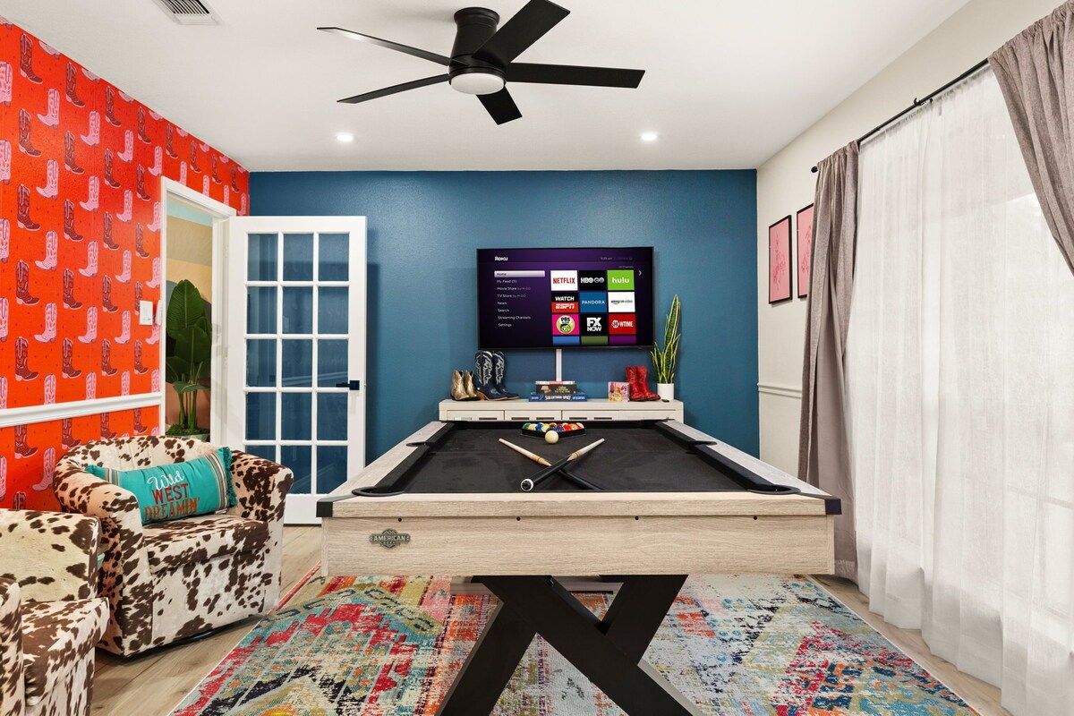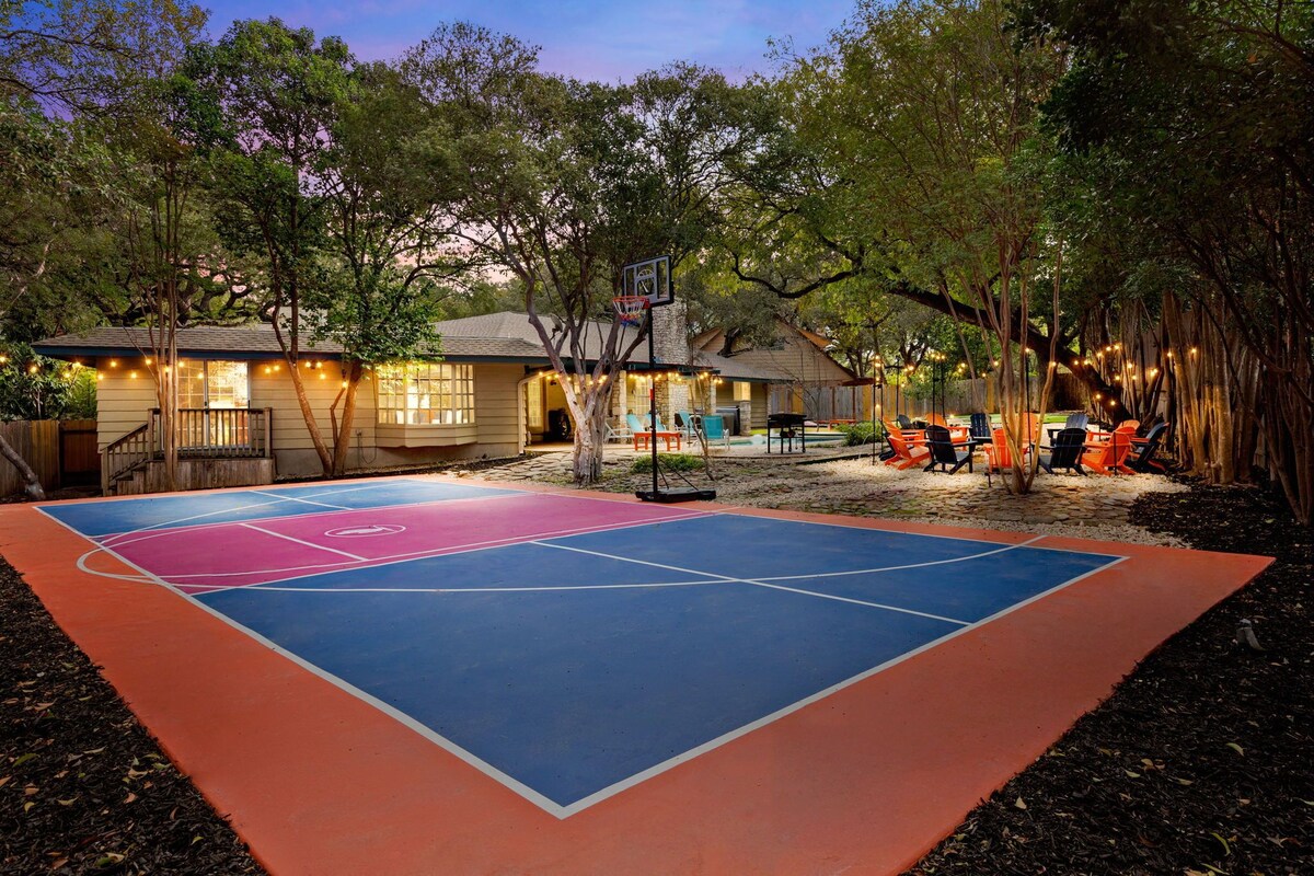 ☆☆ HIGHLIGHTS ☆☆ ✹ 5 bedrooms w/ fun themes; 2 kings, 4 queens, and 2 single pull out sofas ✹ 3 full bathrooms; essential toiletries provided ✹ Full kitchen w/ modern appliances ✹ Complimentary coffee bar ✹ Spacious kitchen island w/ seating for 4 ✹ Formal dining area w/ seating for 12 ✹ Lounge area w/ample seating for the entire family ✹ Numerous smart TVs in living room + bedrooms ✹ High-speed wifi + laptop-friendly surfaces ✹ State-of-the-art theater room w/ deluxe seating, Arcade games, Nintendo Switch, air-hockey, popcorn machine ✹ Game room w/ pool table, multiple board, + large TV ✹ Full-sized washer + dryer ✹ Shaded outdoor space w/ dining and comfortable seating ✹ Heated pool + separate hot tub ✹ Pickleball/basketball court, Mini-golf, kids Swingset, and much more ✹ Free parking on large driveway ✹ Furry family members welcome ✹ Convenient location w/ easy access to San Antonios's best-known attractions, restaurants + grocery Eager to Read More? Here Are A Few Kind Words From Our Previous Guests at our OTHER locations: Amazing! ★★★★★ The house was wonderful, and our host was fantastic! We travel with pets and four kids to Orlando multiple times a year: usually staying in Emerald Island Resort. This house was one of the best we've stayed in! Pool was great, the playroom was entertaining, the kitchen was fully stocked, the movie theater made movie night a blast, I could go on. We greatly enjoyed our stay here and are already looking forward to booking our next trip! (Other Location) “This home was absolutely amazing!! It was spacious and family-friendly. The fully stocked kitchen and other items provided made us feel at home. The home was just as pictured. The themed rooms were a big hit with the entire family. It's great that it was so close to Disney and many other places. We had a great experience with the host. We can't wait to visit again.” –Evan (Other Location) “Because of Andrienne, our family trip was nothing short of AMAZING!!! She is an outstanding host. She always responded to any questions I had in a timely manner. Making sure I had a clear understanding of everything. And the home was ABSOLUTELY BEAUTIFUL!!! It had literally everything we needed. We thoroughly enjoyed our stay. The neighborhood was so peaceful. Thanks again for being an outstanding host.” –Latysha (Other Location) ★★ BEDROOMS ★★ With 5 spacious bedrooms and comfortable beds, this home is the perfect base for large families or multiple families. Kids and adults alike will find the our themed bedrooms amazing. They are tastefully decorated and impeccably furnished to offer maximum comfort. ✹ Primary Bedroom: King-sized bed, 55” smart TV, + ensuite bathroom ✹ Bedroom 2: King-sized bed, 55\ smart TV ✹ Bedroom 4: Queen-sized bed, closet, and 43\ smart TV ✔ Plush mattresses, luxurious linens + pillows ✔ Flat-screen smart TV in each room ★★ BATHROOMS ★★ With three full bathrooms, with 2 ensuites, and a main bathroom. Each bathroom is spacious and clean. ✹ Bathroom 1: Ensuite to primary bedroom w/ dual vanity, walk-in shower + toilet ✹ Bathroom 2: Ensuite to double Queen room with shower. ✹ Bathroom 3: Full bath w/ tub/shower combo ✔ Essential toiletries provided (including shampoo, conditioner + body wash) ✔ Hair dryer ✔ Fresh towels ✔ Laundry room w/ full-size washer + dryer ★★ KITCHEN & DINING ★★ The enormous family-sized kitchen is stylish yet practical, offering the perfect place to prepare delicious meals. Enjoy spacious countertops, modern appliances, cookware, gadgets, and utensils you need to nourish your family between exploring local attractions. The formal dining area is just steps away. This sleek setting is ideal for enjoyable family meals. The large kitchen island has enough room for 4, perfect for pulling up a chair for a light bite or a drink. A vacation isn’t complete without eating under clear blue skies, so grab your food and head to the stunning outdoor sanctuary for a memorable alfresco dining experience. ✔ Open-plan kitchen w/ modern appliances (including huge fridge/freezer, oven + dishwasher) ✔ Coffee maker + complimentary coffee ✔ Basic cookware + dinnerware ✔ Generous dining table w/ seating for 12 ✔ Large kitchen island w/ seating for 4 ✔ High chair for kids ★★ LIVING ROOM ★★ You won’t be short of comfortable places to hang out with your nearest and dearest. Multiple lounges and seating areas are spread throughout the home, so you’ll never feel crowded. The charming gameroom near the kitchen is a great place to relax and play some board games. The living room at the center of the home offers more plush sofas, ample natural light, and another TV. ✔ Modular couch + smart TV adjacent to kitchen ✔ Natural light + lovely decor ✔ Direct access to the pool + backyard oasis ✔ Board games ★★ HOME THEATER & GAME ROOM ★★ Decorated with a hint of Texas, the sophisticated theater room will impress the whole family. Whip up a batch of popcorn, settle into one of the deluxe seats, and immerse yourself in the latest blockbuster during a cozy movie night, play air-hockey, or test your joystick skills on the arcade games. For something a little more active, head to the game room, where you’ll find plenty of wholesome activities to keep the family smiling! Challenge your loved ones to an exciting game of pool, traditional board games, or sit back a reaf of good book. ✔ Movie room w/ leather seats + 85” smart TV, Pacman Arcade and Marvel Arcade games, Nintendo Switch, and Air-Hockey. ✔ Game room w/ 65” smart TV, pool table, traditional board games, and books. ★★ OUTDOOR SPACE ★★ The offerings are so many in this vibrant space. Whether you decide to relax by the firepit, or under our shaded outdoor dining space, take a swim in the pool, chill out in the hot tub, or play a game or pickeball, basketball, mini-golf, mini-bowling, e