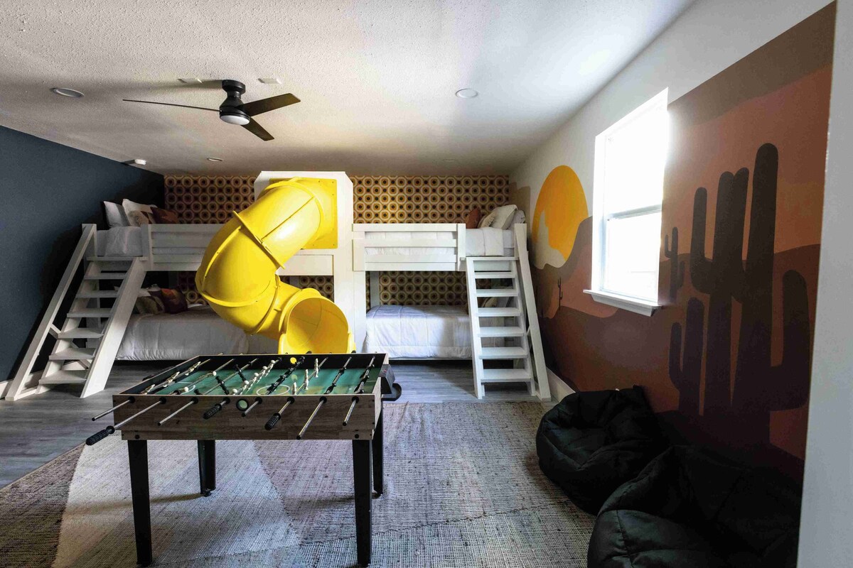 MORE PHOTOS COMING SOON!! This PERFECT San Antonio escape has so much room for activities. Jam-packed with amenities, this 5-bedroom house is perfect for your next family vacation, reunion, or bachelor/bachelorette party! • Family Friendly! Fully Private House • Pool • Sport Court: Basketball/Pickleball • Fire Pit • BBQ • Corn hole • Mini Golf • BBQ Grill • Shuffleboard Table • Fully Stocked Kitchen • Kid Friendly! High Chair, Pack n Play, and Children's Dishes • TVs in Each Bedroom • Indoor Fireplace • Ample Parking • Dedicated Workspace • Smarthouse with Keypad entry, Nest Thermostat, high-speed WIFI, and Smart TV in EVERY room. This gorgeous 4-bedroom, 2.5-bathroom plus playroom home is perfect for your next San Antonio getaway. Great for large families, group getaways, or special celebrations, this house can sleep up to 16 guests, making it the perfect place to make new memories. Hidden away in peaceful Castle Hills on a beautiful tree-lined street, this house offers easy access to all of San Antonio's top attractions without the hustle and bustle of downtown. Whether you're lounging by the pool, grilling with the family, or need a comfortable place to rest after a day of Six Flags roller coasters, this house has everything you need for your next Texas adventure. • 5 Minutes from Walmart, H-E-B, Whole Foods, and numerous chain and local restaurants. • 10-15 Minutes to San Antonio Airport, The Alamo, River Walk, Six Flags Fiesta Texas, and UTSA. Parking is available in the driveway, with ample additional free parking on the street. NO PARKING IN GARAGE. GARAGE DOOR DO NOT OPEN. The Space: BEDROOM 1 (Primary Bedroom): • King Bed • Twin Daybed • Ensuite Bathroom with His and Hers Sinks • Walk-in Closet • Smart TV • Ceiling Fan • Fullsize Mirror BEDROOM 2: • Queen Bed • Walk-in Closet • Smart TV • Ceiling Fan • Fullsize Mirror BEDROOM 3: • Queen Bed • Walk-in Closet • Smart TV • Ceiling Fan • Fullsize Mirror BEDROOM 4: • King Bed • Smart TV • Dedicated Workspace PLAYROOM (Lower Level through Laundry Room): • 2 Full/Full-sized Bunk Beds • Slide • Smart TV • Mini Foosball, Air Hockey, Pool • Boardgames • Children's Books BATHROOM 1: • Ensuite to Primary Bedroom • Shampoo, Conditioner, Bodywash • Towels •Tub • His and Hers Sinks • Extra Pillows and Linens BATHROOM 2: • Full Bath • Shampoo, Conditioner, Bodywash • Hairdryer • Towel • Tub BATHROOM 3 (Lower Level): • Half Bath CHEF’S KITCHEN: • Fully Stocked • High-end Appliances • Large Refrigerator • Ample Cabinetry • Children's Dishes and Cutlery • Island with Seating for 4 • Open Floor Plan to Breakfast Nook with Seating for 4 DINING ROOM: • Formal Dining Table with Seating for 6 • Shuffleboard • Coffee Station with Coffee Makers: French Press, Keurig, Coffee Pot, Hot Water Kettle, Syrups, Sugar, Tea • Open Floor Concept to Kitchen LIVING ROOM: • Smart TV • Large Leathered Sofa • Indoor Fireplace • Photo Wall with Custom LED Sign • Ample Seating SPECTACULAR RESORT-STYLE BACKYARD & POOL • Private Pool and Spa • Sportscourt: Basketball & Pickleball • Fire Pit • BBQ Grill • Putt Putt • Giant Connect 4 • Poolside Loungers Guest Access: Guests will have access to the entire home, yard, and pool. POOL LIABILITY: Please note that by booking this listing, you agree to take total and complete responsibility for the use of the pool and property. You understand that during the stay, there is no lifeguard on duty, and you shall be responsible for all guests and relatives using the pool. You understand that there are risks involved in the use of the pool facilities, such as injury or death, and consent that the hosts are not liable. GRILL: Please clean THOROUGHLY after use. Gas canisters for BBQ and Fire Pit will be on the property but may need to be refilled. The local Walmart is less than 5 minutes away, and you can exchange tanks. We will reimburse the cost (~$20). PETS: DOGS ONLY allowed at an additional pet fee of $249 Per Pet for your entire stay. If bringing more than one pet, once booked, we will send you a request through the platform to cover the additional pet fee. You are responsible for any damages, so please only bring trained dogs, no puppies! You are responsible for bringing doggy bags and picking up all their waste. Our prices include all fees. No hidden fees.
