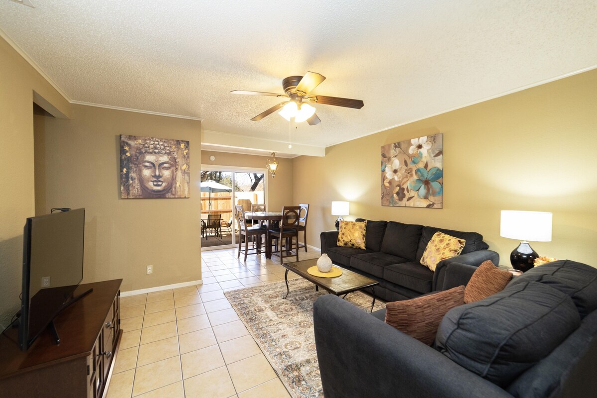 This stylish 1,400 square foot townhome has 3 bedroom, 2 bathrooms to accommodate 6 adults comfortably (8 max). The home is single-story, so the entire living area is on the ground floor. The home is centrally located near the medical center (less than 5 minutes), Six Flags Fiesta Texas (10 minutes), Sea World (15 minutes), the Riverwalk/Alamo/downtown (15 minutes), the airport (10 minutes), Lackland Air-force Base (15 minutes). The master bedroom features a king size bed, a walk in closet and a master bathroom with a huge walk-in shower with an Italian tiled motif. Bedroom #2 features a queen size bed. Bedroom #3 includes two full beds and a walk in closet. These two bedrooms share a full bathroom with shower/tub. There are 4 TVs in the home - one in each of the three bedrooms and one in the living room The kitchen has granite countertops and stainless steel appliances. It includes pots, pans, and the necessary dishes and silverware to prepare and serve a deliciously home cooked meal. Small appliances include a drip system coffee maker, blender, a mixer, and a 4-slice toaster. The formal dining room includes a great dramatic table that seats 8 people that you will love, while the breakfast room has a convenient casual table for 4 that is next to the family room so that you can grab a quick bite to eat without missing your favorite TV program or use it for a fun evening of board games. The family room has a very comfortable sofa and love seat, a 55 inch LED Smart TV that you can use to watch your own Netflix or other streaming account (no cable). All bedrooms have their own smart TVs also for streaming (no cable) The townhome is wired with high speed WiFi internet. It includes a small business center area with a desk and wireless printer/scanner for those of you who need to work during your visit. The private patio includes a gas bbq grill, a patio table with an umbrella and seating for 6 people. The patio is completely fenced-in so you can feel comfortable letting your children or pets play in the back patio. Please pickup and dispose of your pets poop before you check-out. When you exit the back patio into the common area of the complex, you will find a nice green belt with a walking path that goes around the gated complex. If you walk your pet in the common area of the complex, it must be on a leash at all times. The pool is located a few steps away from the house in the middle of the complex. The pool is currently OPEN. The pool season opens mid-May and goes through mid-September. As with any pool, unforeseen issues sometimes arise which requires the HOA to close it temporarily for maintenance. It does not happen often, but when this happens, it is beyond my control, so I am unable to offer any guarantees. We are pet friendly. There is a $50 pet fee. The supermarket, Wal-Mart, movie theaters, and an array of restaurants are less than 2 miles away. I really enjoy staying at my townhome. I am sure you will enjoy your stay too! Our Short Term Rental Permit # 22-13500336 (Exp 3/2/28) Our prices include all fees. No hidden fees.