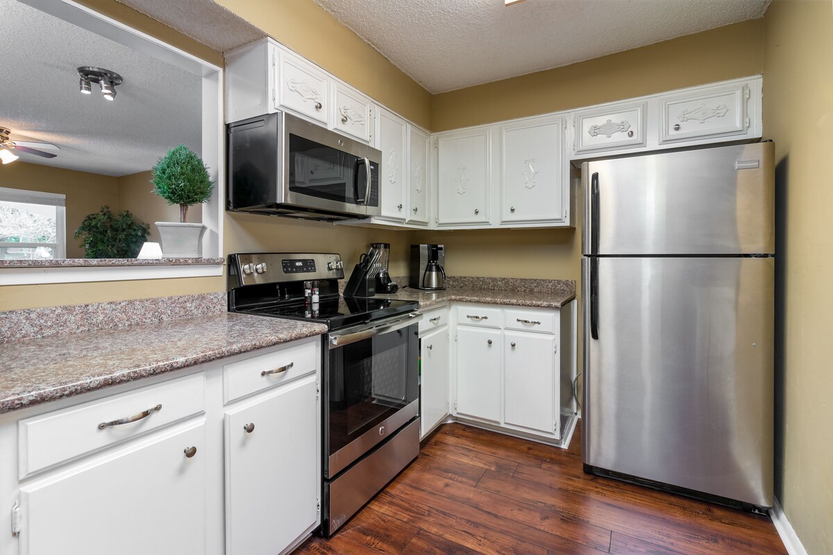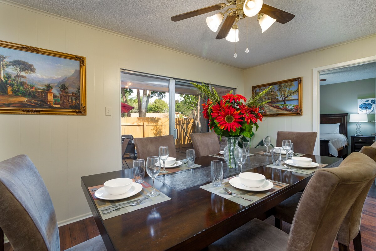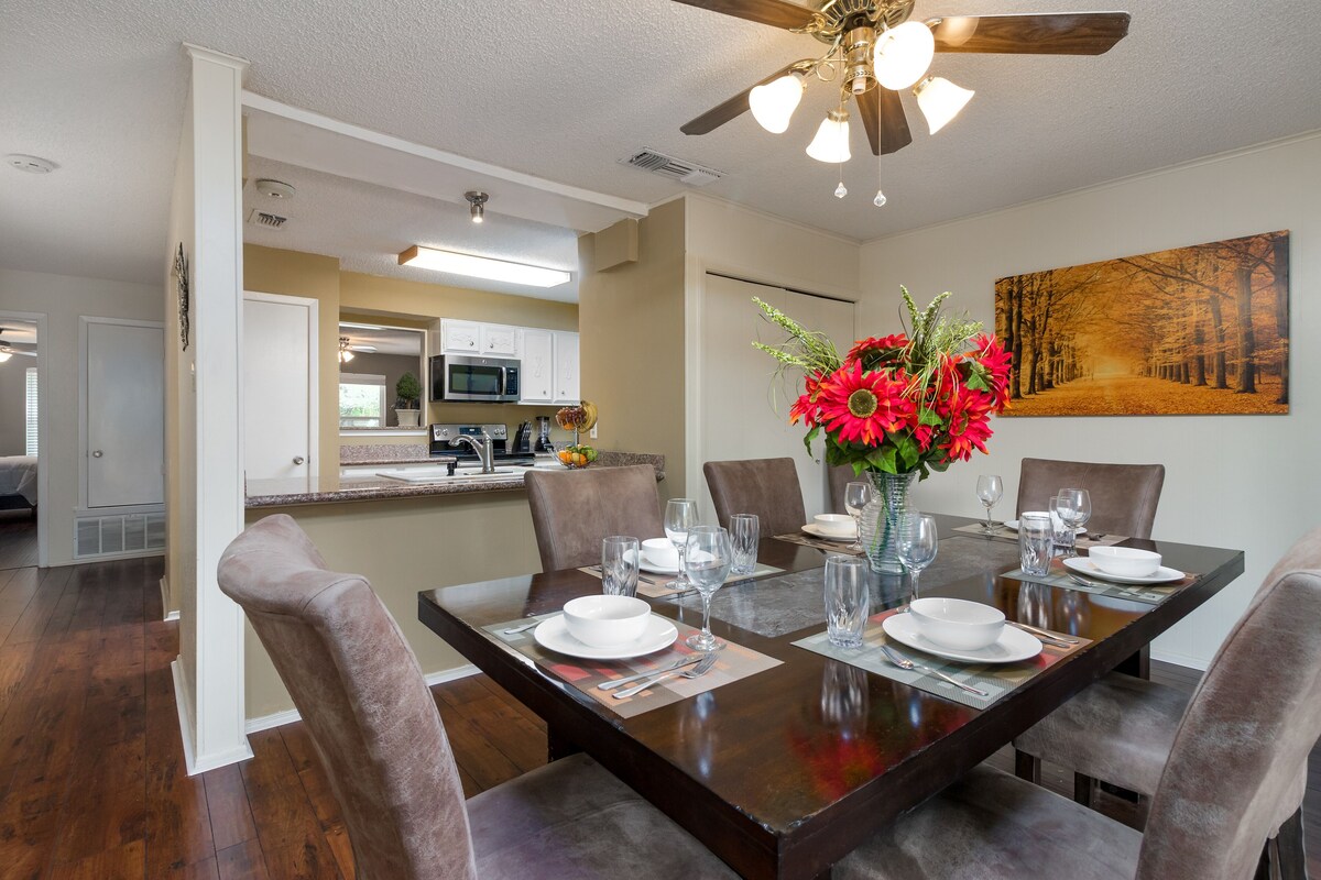 Recently remodeled 3 bedroom townhouse in the Northwest side of San Antonio., centrally located just 10-20 minutes away from the major tourist attractions - Lackland AFB (15min west), Sea World (15min northwest), Fiesta Texas (10min north), and the famous Alamo and Riverwalk (15min south). This 3 bedroom, 2 bath townhouse located in a quiet gated community with a beautiful park-like setting and a sparkling community pool (not artificially heated). The bedrooms include 1 king size bed, 1 queen size bed and 2 full beds to accommodate 6 adults comfortably. The master bathroom has a standing shower. The guest bathroom has a shower/tub combo. The living room has a comfortable leather sofa and love seat and a 55\ ,