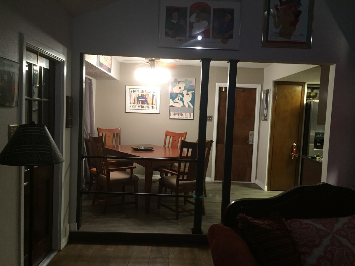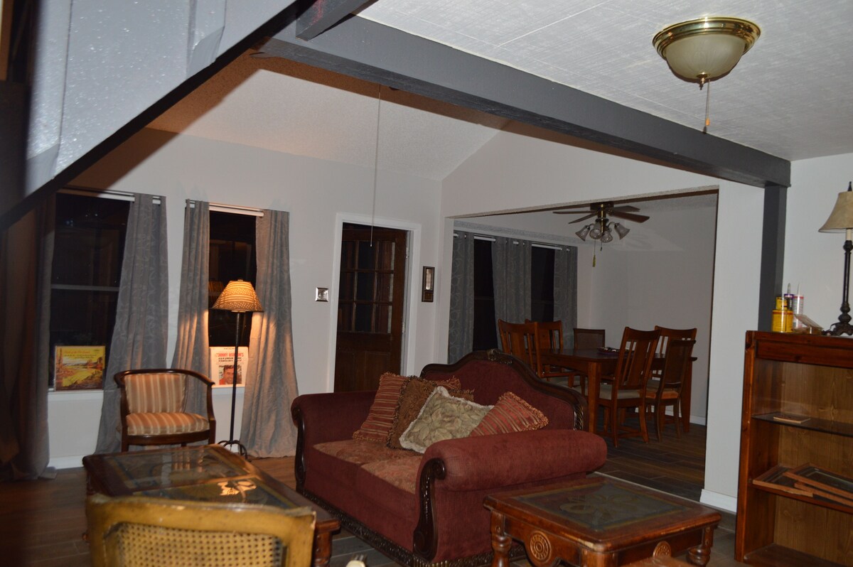 Master bedroom includes a king size bed, Direct TV, and private full-size bath. Two additional bedrooms each have a full size bed. Bedrooms all equipped with chest of drawers, ample closet space, and ceiling fans. Large Direct TV in living area. Screened in attached porch. Large wood deck in back leading to grass covered lawn. Washer and dryer available inside attached two-car garage. All new appliances in the kitchen. Our prices include all fees. No hidden fees.