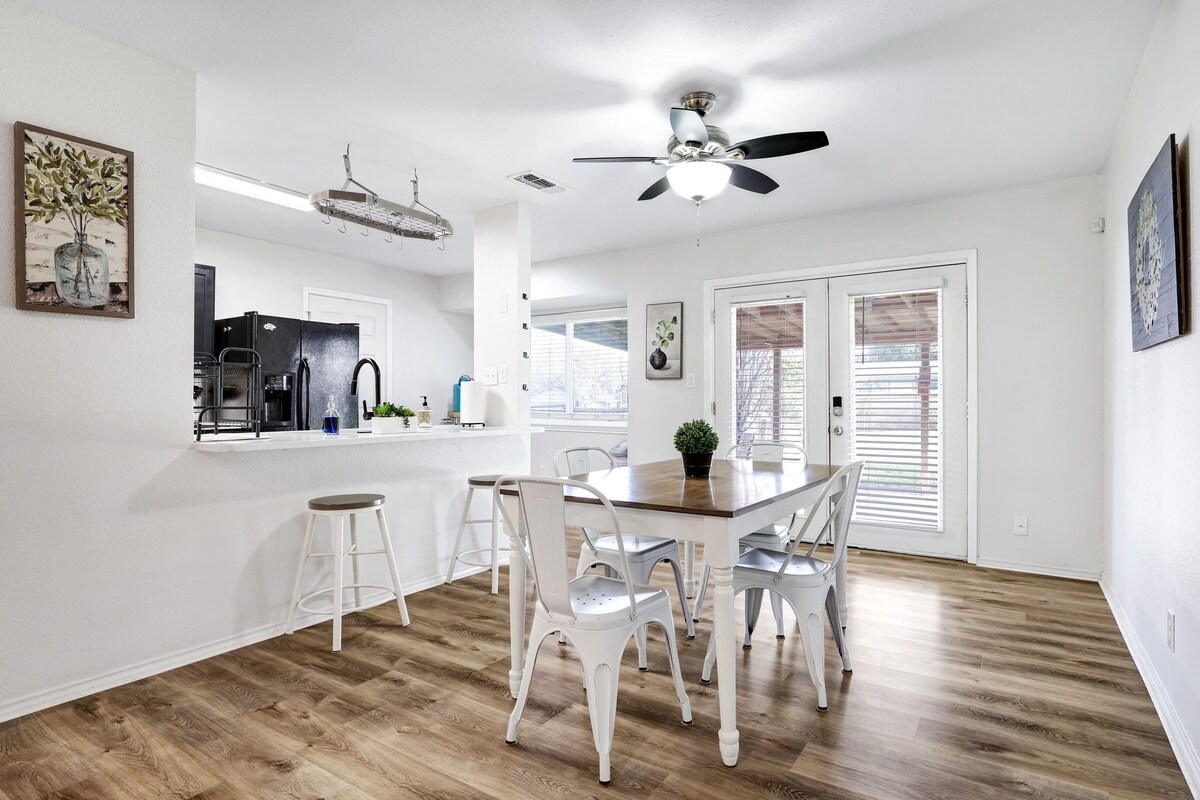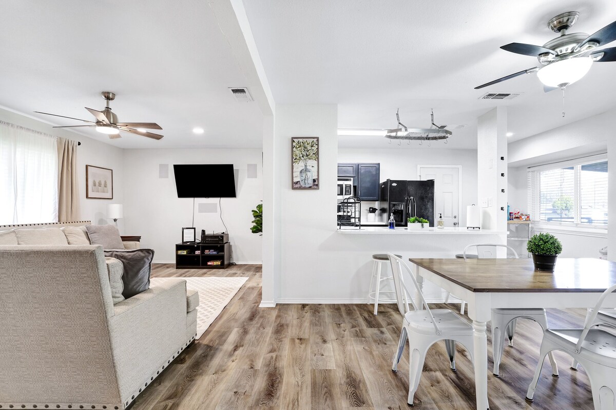 This 3 bed 2 bath 1500 sf home away from home is centrally located! Easy access to all highways throughout San Antonio. 5 miles (10 minute drive) from the San Antonio Airport, 7.8 miles (12 minutes) to Six Flags Fiesta Texas & La Cantera. Shops, grocery store, gas stations, restaurants and entertainment are just minutes away. Enjoy movie nights with an amazing surround sound. Water, coffee, a full kitchen, wifi, Netflix, fresh towels, and linens, are included with your stay.
