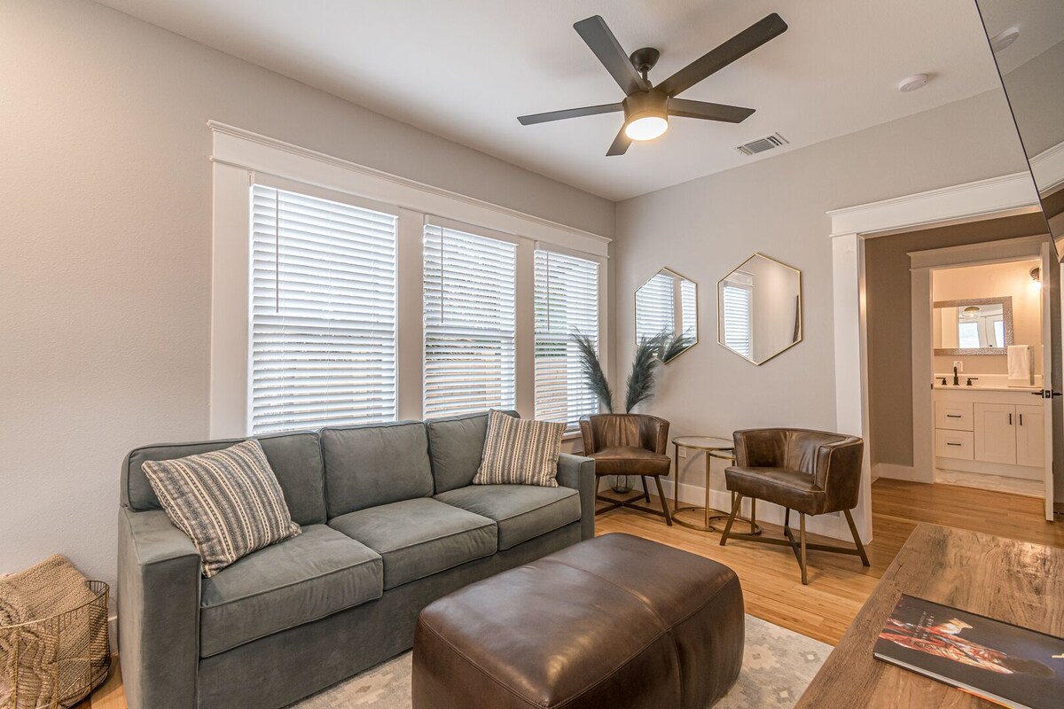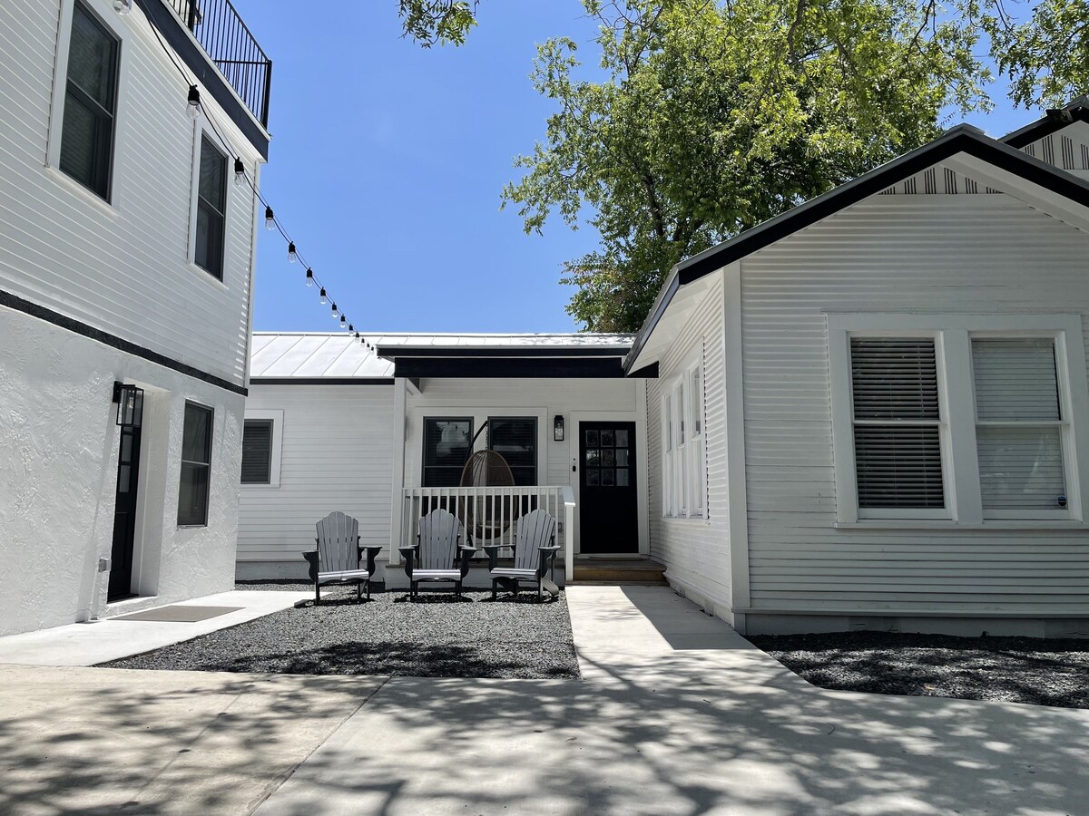 Enjoy your stay at our stylish Casa Blanca centrally located in Downtown San Antonio. You will have the entire house and grounds to yourself. Enjoy the state-of-the-art appliances and fast wireless internet. The house sleeps 6 adults, has a fully equipped kitchen, spacious dining, washer & dryer, plenty of parking, and peaceful outdoor seating including an off main balcony. Enjoy your private hot tub which fits 7. In the Lavaca neighborhood which offers some of the best bars & restaurants in the city. Casa Blanca is great for shopping, art, and downtown events! Plenty of parking and EV charger available. Inquire for contacts to trusted local professional services such as car rentals & child-care services. Our prices include all fees. No hidden fees.