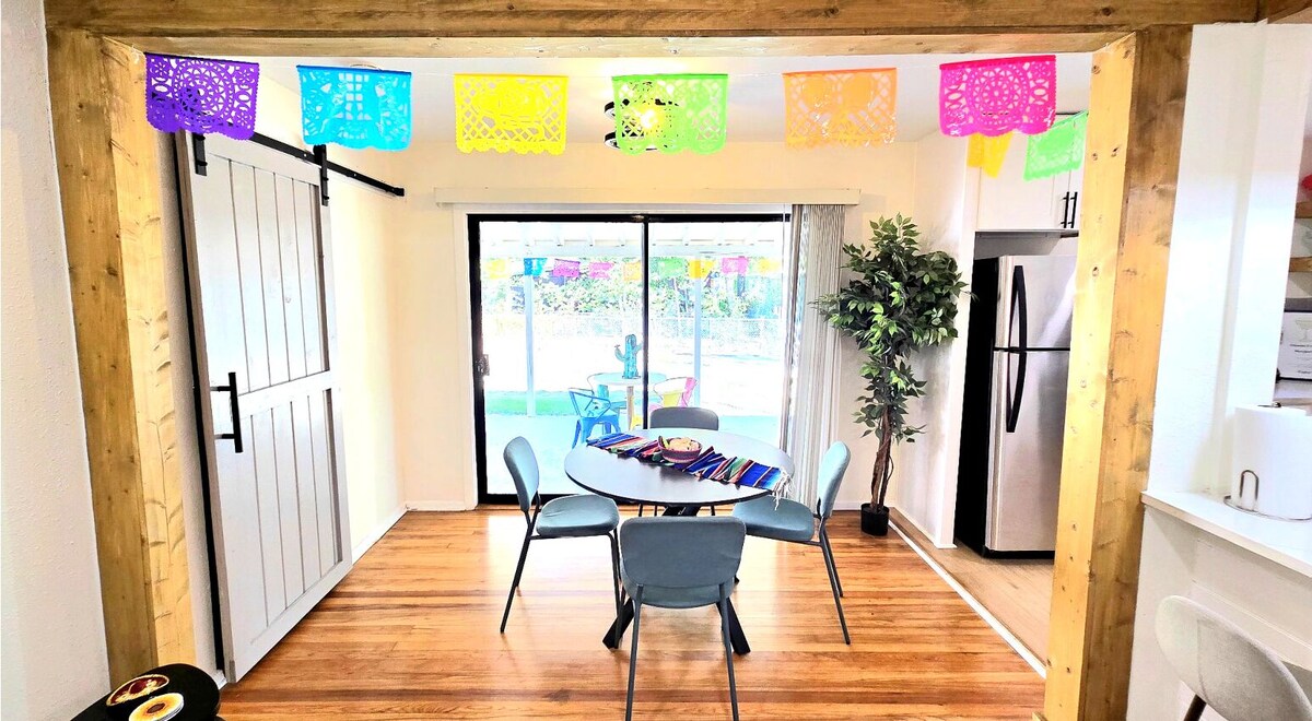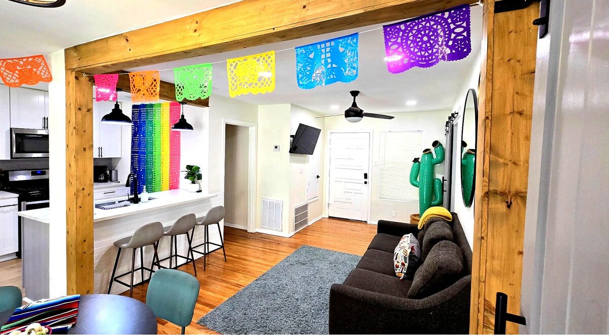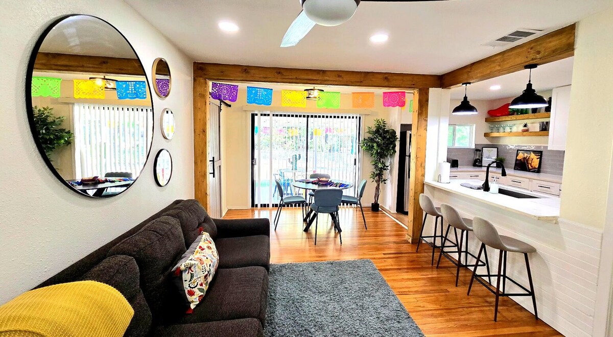 Modern twist on a classic 1950s home, freshly revamped with a vibrant Fiesta theme! Located in the heart of San Antonio, this stylish retreat blends retro charm with contemporary comforts for a unique stay experience.