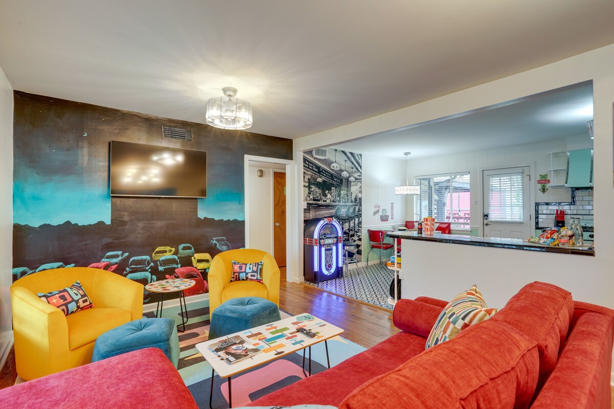 Let the charm of this amenity-packed vacation rental set the scene for your next south-central Texas getaway. Situated near local attractions and filled with retro decor, this duplex is perfect for those hoping to experience San Antonio with ease. Spend your days having fun at local waterparks, touring historic sites, or exploring outdoor attractions. Return to this tranquil 2-bedroom, 1-bath retreat to take a dip in the hot tub, gather around the chiminea, or enjoy a meal made on the gas grill. -- THE PROPERTY -- STR-23-13500682 | Pets Welcome w/ Fee | Private Hot Tub | Close to Downtown Bedroom 1: King Bed | Bedroom 2: King Bed | Living Room: Sleeper Sofa | Additional Sleeping: Crib INDOOR LIVING: Smart TVs, DVD player, video games, 2-person arcade game, jukebox, clawfoot soaking tub, ceiling fans, dining table, breakfast bar, high chair, books, board games, popcorn machine OUTDOOR LIVING: Private fenced-in yard, patio, gas grill, outdoor seating areas, chiminea KITCHEN: Stove/oven, fridge, coffee maker, coffee grinder, Crockpot, microwave, toaster, toaster oven, blender, tea kettle, ice maker, dishware/flatware, spices, basic cooking essentials, wine cellar, coffee & tea GENERAL: Free WiFi, keyless entry, central A/C & heating, washer/dryer, laundry detergent, iron/ironing board, towels/linens, hair dryer, complimentary toiletries, trash bags/paper towels FAQ: 2 small steps required to enter, 2 Ring security cameras (facing out), NoiseAware monitoring system, pet fee (paid pre-trip) PARKING: Carport (1 vehicle), driveway (1 vehicle), street parking available (first-come, first-served) ADDT’L ACCOMMODATIONS: An additional 2-bedroom property for 6 guests is available on-site with a separate nightly rate. If you would like to reserve both rentals, please inquire for more information prior to booking -- THE LOCATION -- THINGS TO SEE & DO: Alamo Quarry Market (2 miles), San Antonio Zoo (4 miles), JBSA-Sam Houston (5 miles), San Antonio River Walk (7 miles), San Antonio Aquarium (13 miles), Six Flags Fiesta Texas (16 miles), Lackland AFB (19 miles), SeaWorld San Antonio (21 miles) MUSEUMS: Witte Museum (3 miles), San Antonio Museum of Art (5 miles), The Alamo (6 miles), Briscoe Western Art Museum (7 miles), San Antonio Missions National Historical Park (19 miles) OUTDOOR RECREATION: Northridge Park (walking distance), The Park at Pearl (5 miles), San Pedro Springs Park (6 miles), Cathedral Rock Park (15 miles), Tom Slick Park (16 miles), Pearsall Park (18 miles), Medina River Natural Area (20 miles) GOLF: The Quarry Golf Course (2 miles), Brackenridge Park Golf Course (4 miles), Willow Springs Golf Course (9 miles), Riverside Golf Course (12 miles) AIRPORT: San Antonio International Airport (3 miles) -- REST EASY WITH US -- Evolve makes it easy to find and book properties you'll never want to leave. You can relax knowing that our properties will always be ready for you and that we'll answer the phone 24/7. Even better, if anything is off about your stay, we'll make it right. You can count on our homes and our people to make you feel welcome — because we know what vacation means to you. -- POLICIES -- - No smoking - Pet friendly w/ $75 fee (+ fees & taxes, 2 pets max) - No events, parties, or large gatherings - Additional fees and taxes may apply - Photo ID may be required upon check-in - NOTE: The property requires 2 small steps to enter - NOTE: Your safety matters. This property features 2 Ring security cameras located on the front entrance facing the front outdoor entry and located on the back of the property facing the back parking area. The cameras do not look into any interior spaces. The cameras record video when motion is detected or when the video doorbell button is pressed - NOTE: This property includes an internal smart device used to measure excessive noise in the home called NoiseAware System. It does not have a camera or recording device but does measure volume levels throughout the home while guests are present - NOTE: There is another bookable vacation rental on-site; other travelers may be present during your stay Our prices include all fees. No hidden fees.
