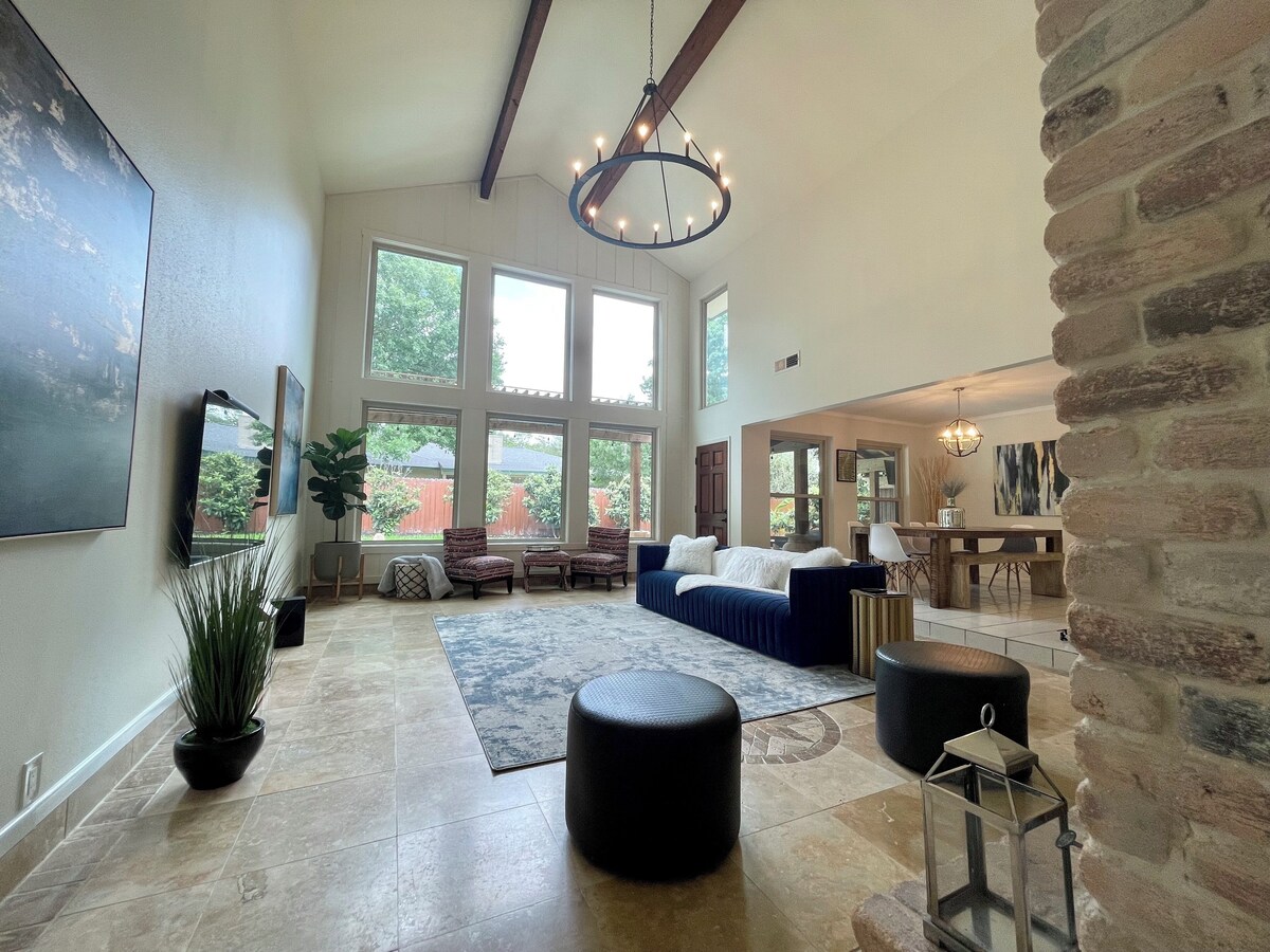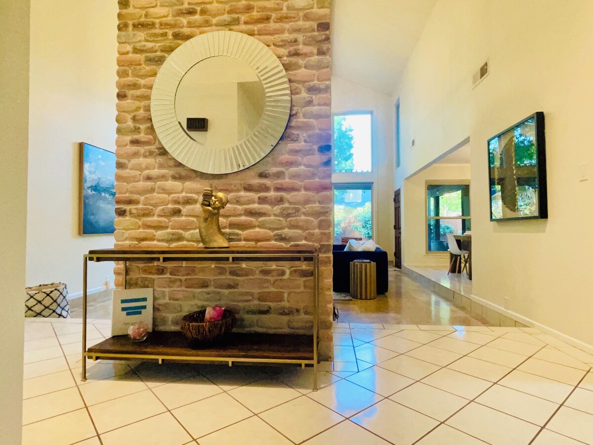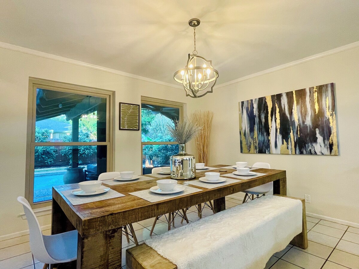 This stylish place to stay is perfect for group trips. An entertainer's dream! Stylish single story interior living with a private backyard oasis. The spacious living room has ample amounts of seating and is equipped to host movie nights with a surround sound system and streaming platforms readily available. The cozy, contemporary interior is complemented by outdoor living space. Pool cabana makes for seamless indoor outdoor space for relaxation, connecting, and recharging. Our prices include all fees. No hidden fees.
