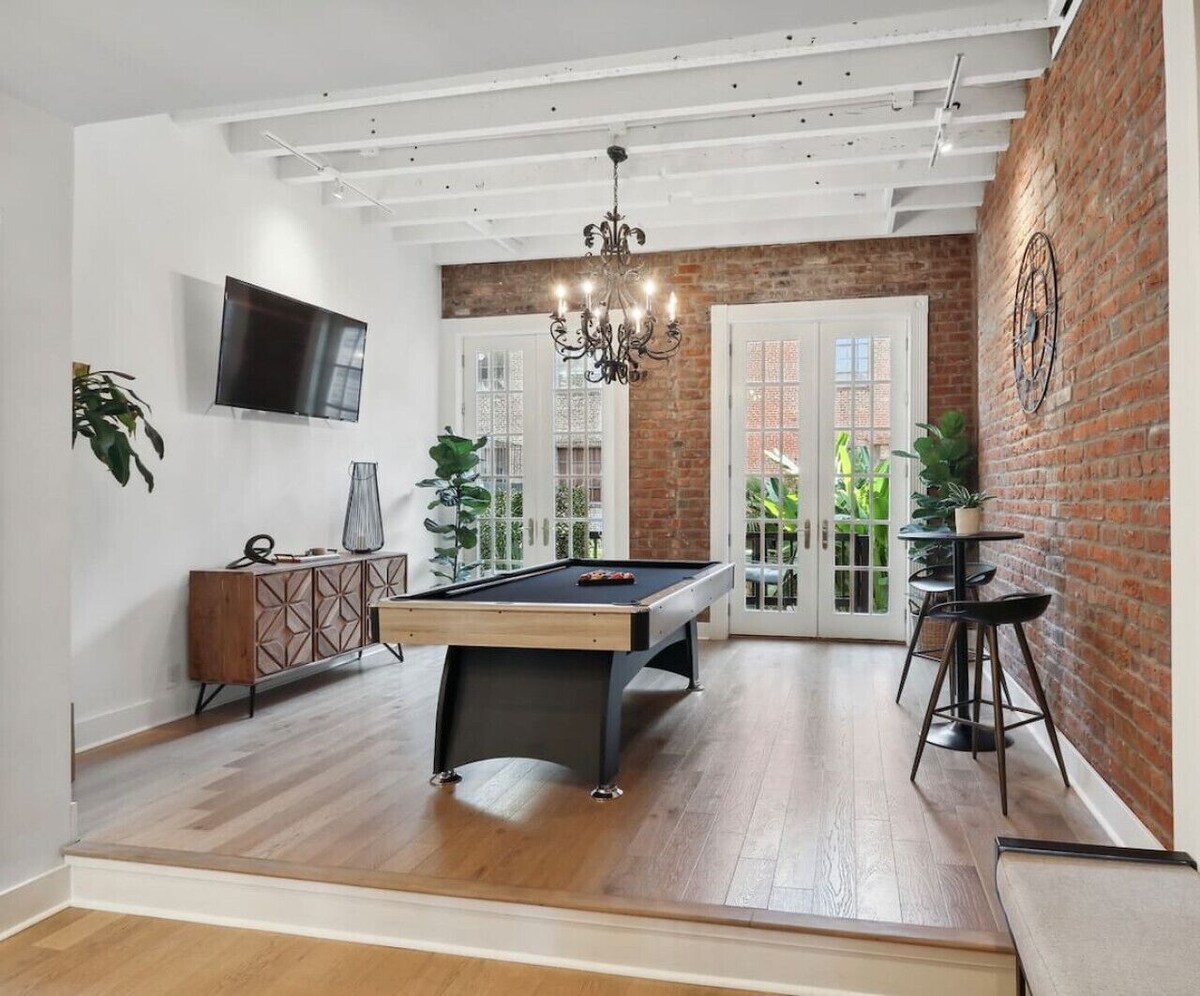 Beautiful new renovation occupying the second and third floors of a historic townhouse in a prime downtown location with great restaurants on the doorstep. Open plan living room, dining room and kitchen. There is a pool table room with balcony access overlooking a beautiful courtyard. Smart TVs with cable. Spacious master suite with king bed, living area with TV and large modern bathroom with soaking tub. There are two bedrooms with queen beds and one with two twin beds. Open plan living kitchen dining room. Pool table room with balcony and courtyard access. Spacious primary suite with king bed, living area with fold down sofas and large separate soaking tub and shower plus double vanities. Two bedrooms with queen beds and one with twin beds. 2 full bathrooms in the hallway outside of the bedrooms. The entire home is all yours. The courtyard is shared with the first floor businesses during regular business hours. We live locally and are available as needed. The house is located in the warehouse district downtown right between the French quarter and garden district. One block from the streetcar, Mardi Gras parade route and world war 2 museum. There are excellent restaurants and nightlife in the neighborhood. Please message us prior to booking if you plan on bringing pets. Our prices include all fees. No hidden fees.