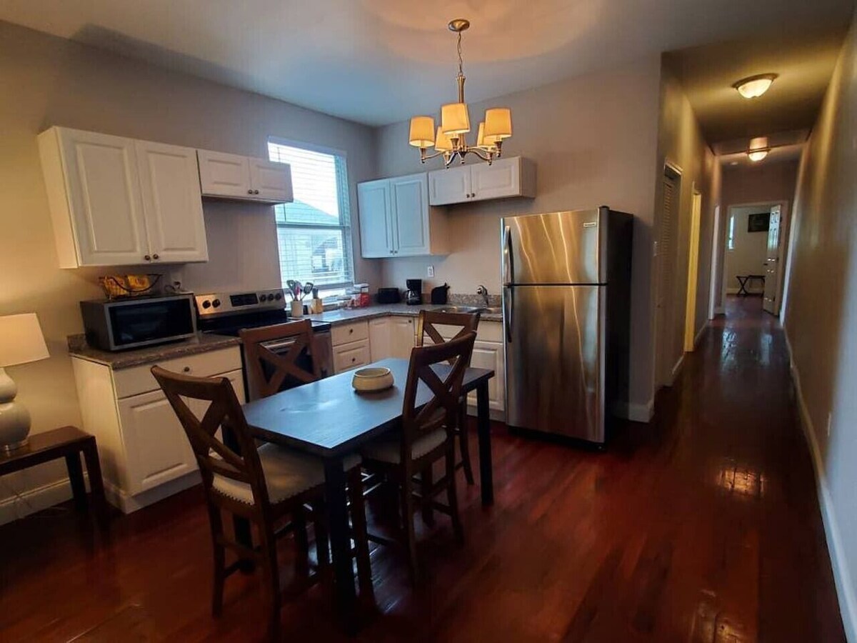 Newly renovated apartment with two bedrooms. Each bedroom has a queen bed. Full kitchen with stainless steel appliances, one bathroom, laundry room (with washer and dryer) and living room with sofa bed. Amenities such as shampoo, conditioner, soap, towels, iron, ironing board, hair dryer, coffee, and a fully stocked kitchen all included. Hardwood floors throughout the apartment. Apartment is on the second floor. Wash dishes before check out. Put trash out. No parties or loud noises. No smoking inside. Our prices include all fees. No hidden fees.