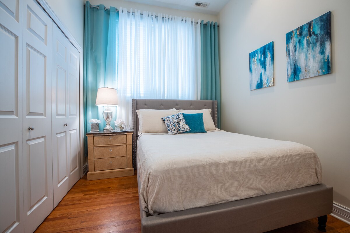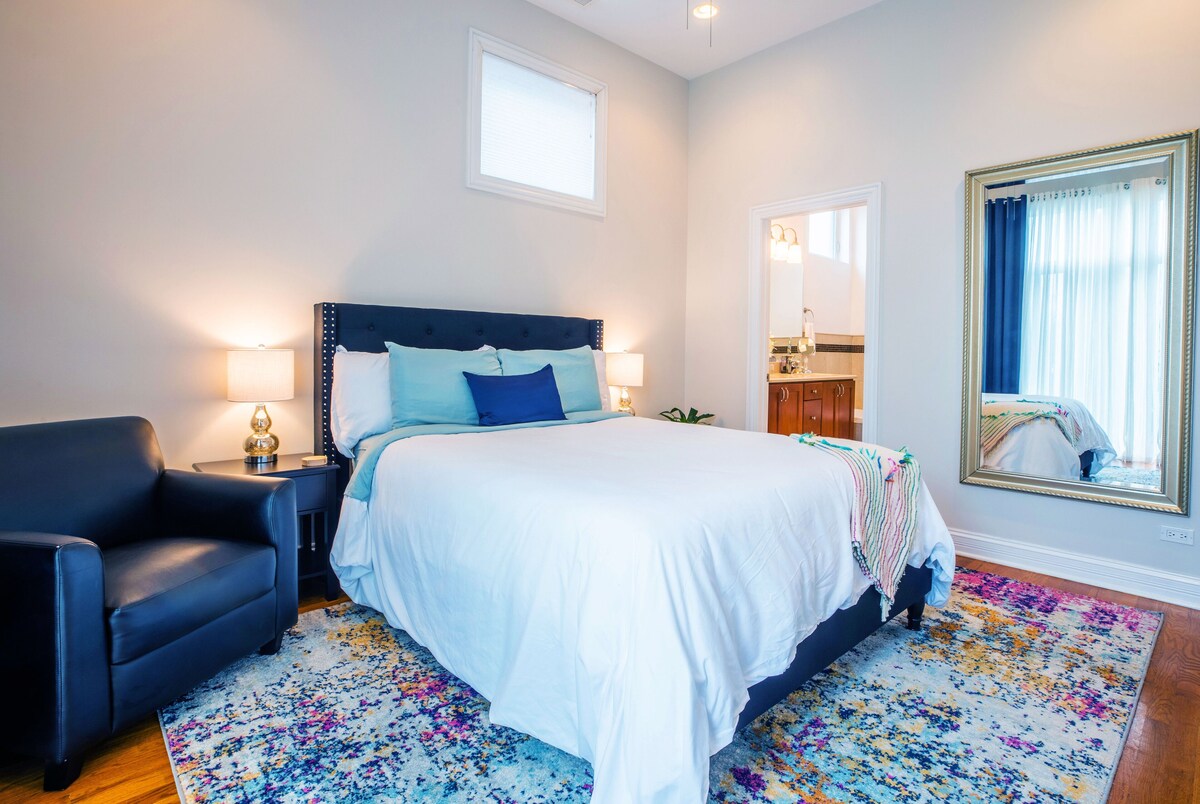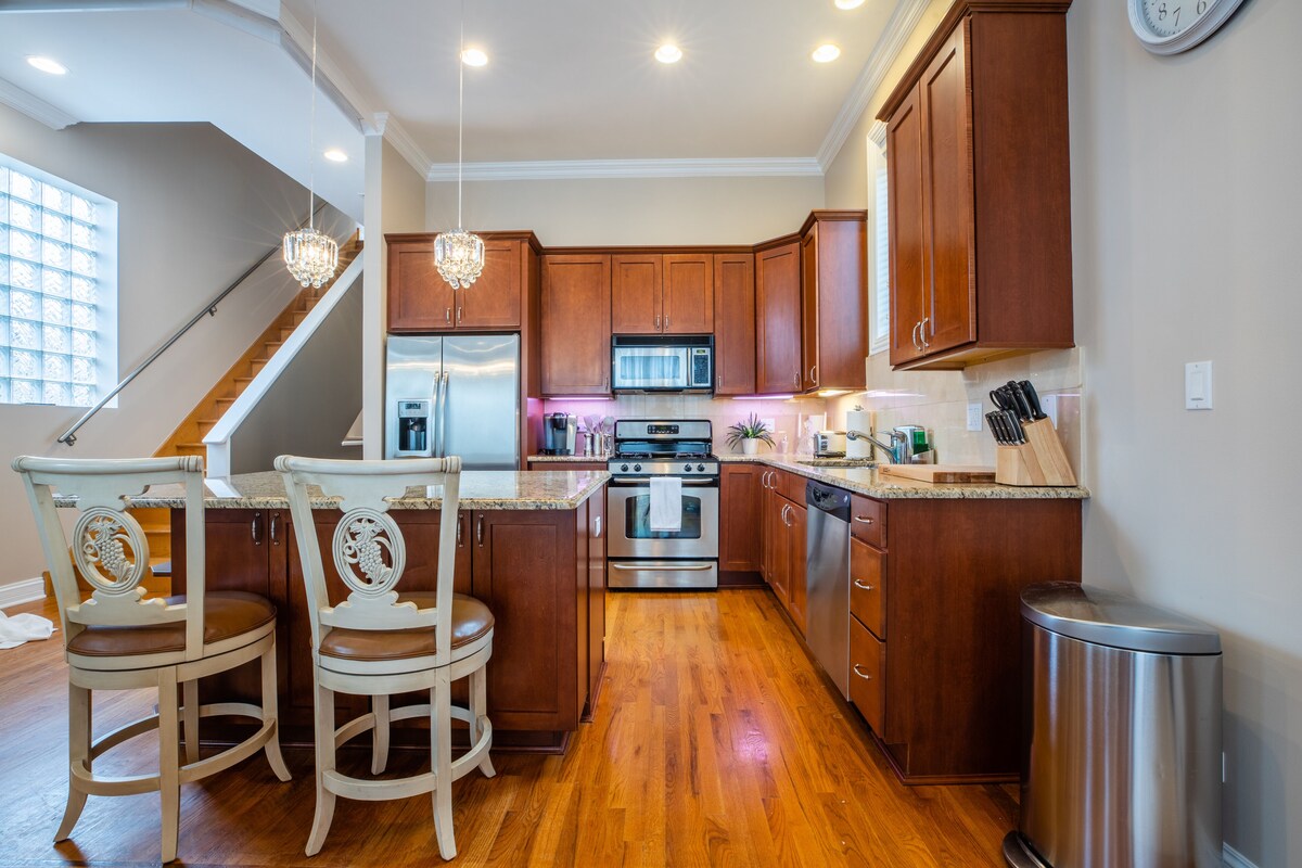 OVERVIEW: This is a spacious penthouse condo with an amazing city skyline view on private rooftop terrace. Comfortably sleeps 9 persons. Luxury bathrooms. Fully equipped chef’s kitchen with top of the line stainless steel appliances and marble counter tops. Gorgeous hardwood floors throughout. High speed internet and smart TV’s with Netflix, Amazon Prime, YouTube and more. Adjustable AC/Heat. In unit washer and dryer. Complimentary secure garage parking and remote provided for use during your stay. Access to condo via smart locks for contactless check in at your convenience. BEDROOMS & SLEEPING ARRANGEMENTS: The master bedroom features a queen bed with stylish decor, a smart TV, and an outdoor patio balcony. There is an attached master spa-like bathroom with a double marble vanity, large jacuzzi with handheld sprayer, and incredible 6 head walk-in shower where you can also enjoy a hand held sprayer, shower head, rain head, and multiple body sprays. A twin sized collapsible bed which sleeps one is located in the closet and can be set up in advance upon request. The second bedroom has a queen bed and clothing storage space in the bureaus and closet. There are also two 3 seat sofas in the living room, both of which open up into queen sized sleeper sofas with memory foam mattresses. Privacy curtains are available to separate the living room from the common area hallway and other bedrooms. This condo comfortably sleeps 9 persons as there are a total of 4 queen beds and 1 twin sized bed. LUXURY BATHROOMS: 2.5 Bathrooms. The master bathroom has a double marble vanity, large jacuzzi with handheld sprayer, and incredible 6 head walk-in shower where you can also enjoy a hand held sprayer, shower head, rain head, and multiple body sprays. The second full bathroom with shower/bath tub is located in the hallway between the master bedroom and second bedroom. Each of these bathrooms are stocked with white towels, automatic antibacterial hand soap dispensers, hand sanitizer, 4 rolls of toilet paper, and tissues. There is also a half bathroom located on the rooftop level which is accessible from the south deck outside area. There is a total of 18 white bath towels, 18 wash cloths, 21 hand towels, and 3 bathmats. Personal toiletries, feminine products, shampoo, conditioner and body soap are NOT provided. CHEF’S KITCHEN & 12 PERSON DINING TABLE: This gorgeous fully equipped kitchen is an entertainer’s dream. Top of the line stainless steel appliances- fridge, freezer, ice maker, oven, stove top, dishwasher, disposal, and toaster. White porcelain dishes include 15 large dinner plates, 15 small dinner plates, 15 pasta bowls, 15 cereal bowls, 2 serving bowls, and 12 coffee mugs. Glassware includes 12 highball glasses, 12 rocks glasses, 12 champagne flutes, 12 white wine glasses, 12 red wine glasses, 12 crystal old fashioned glasses, 12 shot glasses, a crystal serving bowl, and flower vase. Silverware includes 12 small forks, 12 large forks, 12 dinner knives, 12 large spoons, 12 small spoons, and 12 tasting/coffee spoons. 18 piece knife block set, 12 steak knives, 17 piece cookware set, 14 piece bakeware set, and 14 piece cooking utensil set, 5 metal mixing bowls, 5 measuring spoons, measuring cup, cookie sheets, can opener and peeler provided. Keurig coffee maker with coffees, teas, creamers, and sweeteners provided. Salt, pepper and boos block, and 3 plastic cutting boards provided. Stainless steel 60 qt beverage tub, 3 gallon beverage dispenser, and ice bucket provided. Cocktail shaker and bar set provided with wine openers and Champagne stoppers. A kitchen hand towel, 2 paper towel rolls, automatic dish soap dispenser, automatic antibacterial hand soap dispenser, hand sanitizer, a sponge, dishwasher detergent, kitchen garbage bags, and extra bedroom trash liners are provided. Cooking oil is NOT provided and no used kitchen items will be left in the fridge or in the cabinets. Placemats are provided for the 12 person dining table. There are also two bar stools located at the kitchen island. Silver charger plates, white cotton napkins, and napkin rings available upon request for special events. PENTHOUSE ROOF TOP DECK: Stunning private terrace with Tiffany blue cushions topping a 3 seater sofa and 2 arm chairs. Queen sized day bed can be fitted with a special dark blue cover that is taken in and washed in between rentals so guests can put it out dry. Coffee table and cooler located on the north rooftop deck. On the attached south deck you will find a 6 person outdoor dining table, 2 bars with 3 bar stools each, and access to the half bathroom. The bar stools are placed inside the bars to ensure they remain dry for guests. There are 2 total bars and 6 total bar stools. Move the bars together to create a longer buffet or additional group seating. Our prices include all fees. No hidden fees.