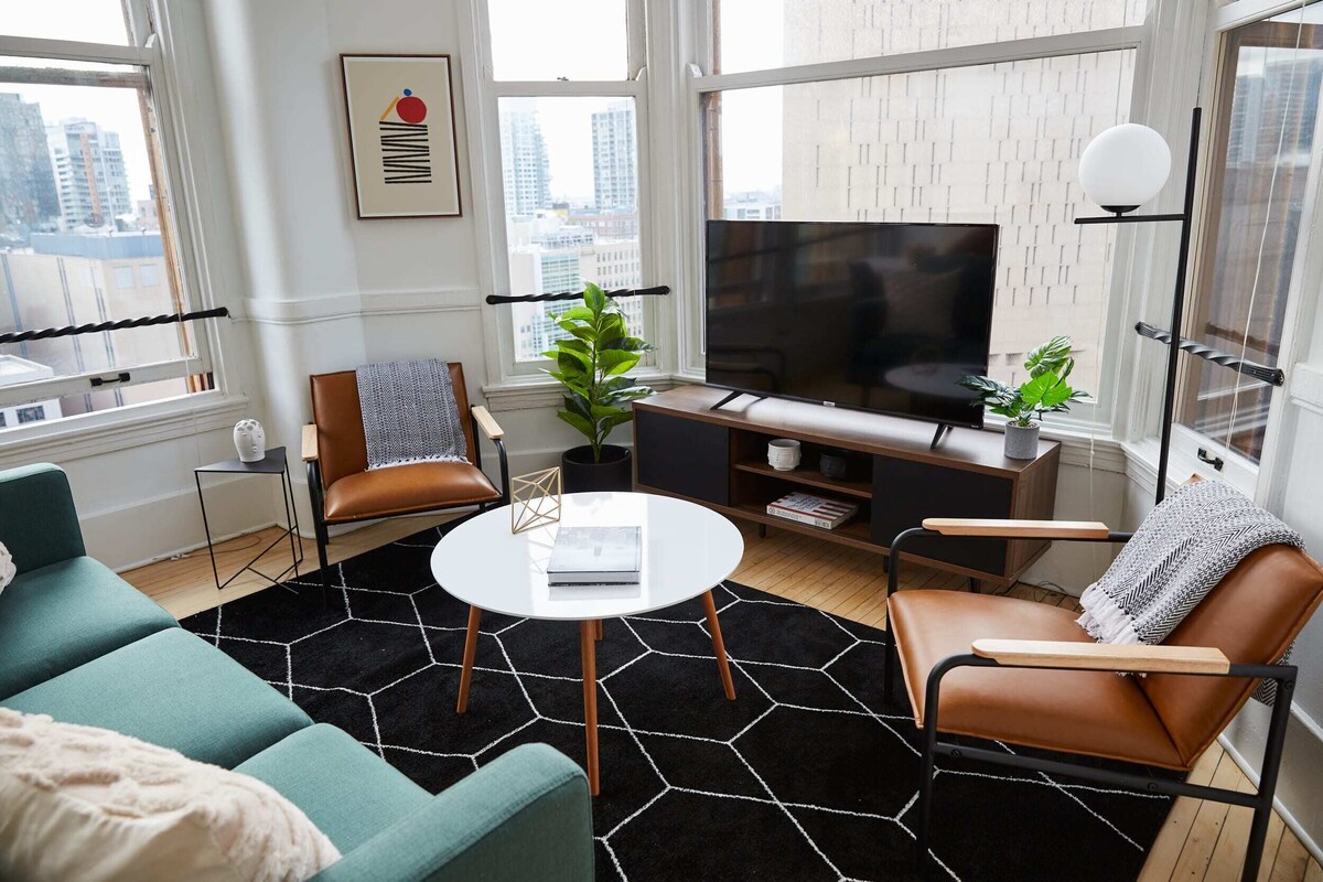 Summary: Stylish 1,400+ square foot corner apartment with 12 foot tall ceilings, massive windows, an open layout, and fabulous city views in multiple directions. This dramatic light-filled three bedroom, two bathroom space is perfect for groups looking for a luxurious escape in the sky in the heart of downtown Chicago. Centrally located in a historic building close to everything you want to visit, this is the best location in the city! The Space: Located on a high floor in a secure, high-end building in the center of Chicago! Once inside, you're greeted by a airy light-filled space with large windows on multiple sides overlooking the city skyline and the neighborhood below (you can even see Lake Michigan in the distance). The views are fabulous during the day and at night! Interior design is a passion of ours and the chic furnishings reflect that! There is fast internet, a 50\ ll have complete and private access to our apartment and the building ll have no trouble getting around without a car. Directly next to our building are stops for all of the city ,