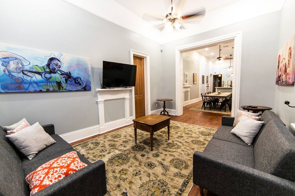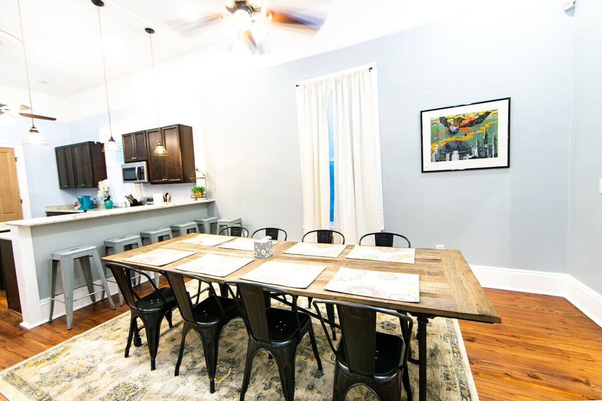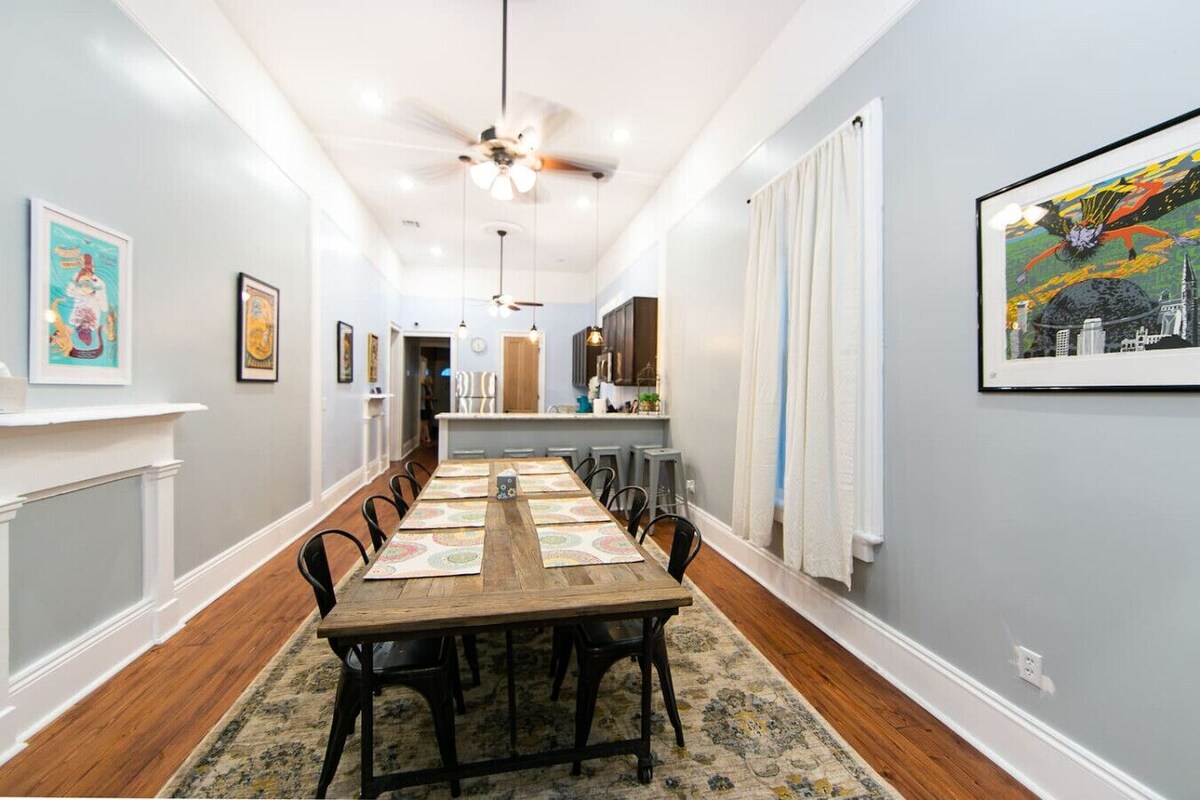 Welcome to your home away from home! This lovingly restored, 150 year-old historic home, sitting right on tree-lined Elysian Fields Avenue is the perfect home base for a weekend of NOLA exploring. An open concept kitchen/dining room with brand new appliances and original hardwoods with 14 foot ceilings are just some of this home`s grand features. Relax with beer and crawfish in our tree-lined backyard before hitting the French Quarter, just a 15 minute walk away. Welcome! Each bedroom has an ensuite bathroom, plus a half bath in the common area with washer/dryer combo. Sleeps 8. Kitchen stocked to prepare any meals, Keurig with coffee provided. Lovely living room and kitchen with breakfast bar + dining room. All bathrooms come with essentials such as 3-in-1 shampoo/conditioner/bodywash and fluffy towels! Street parking available. 5 minute walk to street car, full-service grocery store. 1% of your booking goes to direct aid charities that help displaced Ukrainian families 🇺🇦 Owner lives in separate area on the premises. (Accessed through walkway shared with guests). Our prices include all fees. No hidden fees.