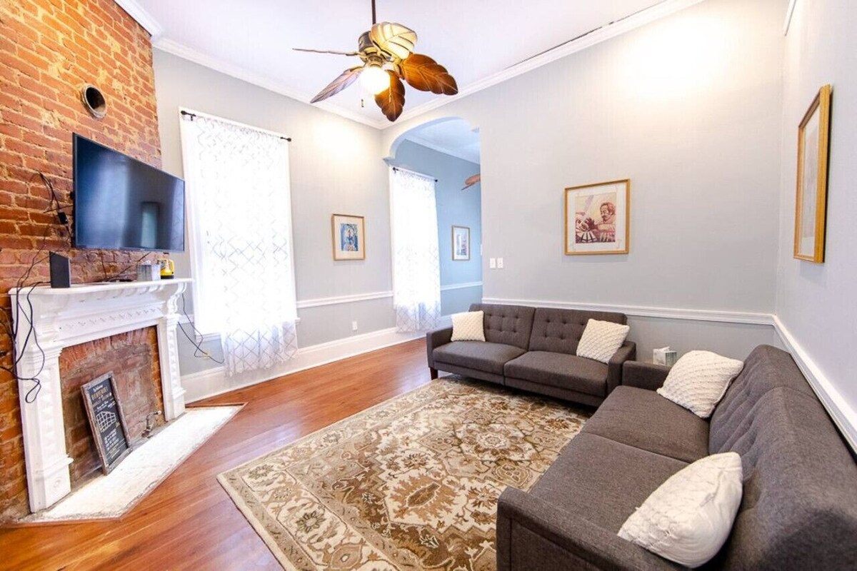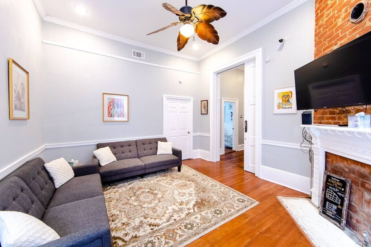 Location, location, location! Just 6 blocks from the French Quarter, this Victorian mansion is the perfect place for groups looking to stay near the action. Rest up in this newly-restored home before you hit the town again. Featuring original hardwood floors, back patio, antique furniture and a full set of amenities (smart tv, full kitchen, washer dryer), we`ve got everything you need for your perfect New Orleans weekend! Kitchen stocked to prepare any meals, Keurig with coffee provided. Lovely living room and kitchen with breakfast nook. All bathrooms come with essentials such as 3-in-1 shampoo/conditioner/bodywash and fluffy towels! Street parking available, driveway shared with upstairs unit. Driveway parking is 1st come, 1st serve. Property is on a busy commercial avenue and can be noisy outside in front. Faces Hwy overpass. Blue Door Management offers assistance during your stay. A host will help plan your arrival and answer any questions you have before and while visiting. A lot of action in this neighborhood. Second lines and gatherings often spring up out of nowhere and will enhance your experience of New Orleans traditions. At times it can be noisy. This is a bustling street that hosts a large walking celebration most Sundays. It`s filled with street vendors, food, drinks and was started years ago to celebrate New Orleans Saint`s WINS! We encourage you to join in on the fun! There is the potential for loud noise during :) Ubers and Lyfts are highly recommended. 5 min rideshare to the French Quarter 8 min ride to Canal Street 10 min ride to the Super Dome (Who Dat) 15 min ride to the Lower Garden District (Magazine Street Shopping, St Charles Ave sightseeing) 20 min ride to the Upper Garden District (Zoo, Tulane, Loyola) A long term tenant lives on property in a private apartment on the third floor of the building. Does not have access to your unit. Property is on a busy commercial avenue and can be noisy outside in front. Faces Hwy overpass. Our prices include all fees. No hidden fees.