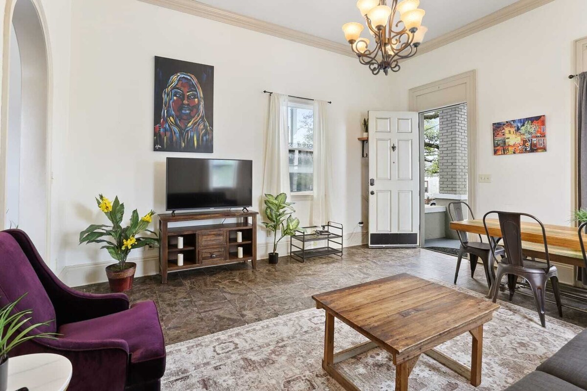 Summary: Steps from Saint Charles, this newly remolded home offers everything you need to relax while at home after a long day exploring all our wonderful city has to offer. The house is filled with local art, 3 separate bedrooms all with smart TVs. The living room is designed to comfortable hold your whole group. Enjoy the front porch with a cocktail and when you are ready to explore the city the Saint Charles street car is steps away- easy access to the French Quarter and whole city. The Space: The unit is the entire top floor of the house. Filled with natural light and modern amenities. We have partnered with local artists to display their work (which is also for sale- all proceeds go straight to the artist if you would like a reminder of your trip to NOLA). Three separate bedrooms offer every guest there own space. Two full bathrooms, one being an ensuite off the master bedroom. The galley kitchen has plenty of room to cook if you decide to stay in, and a full refrigerator gives you a place for all the yummy leftovers you may pick up as you explore the city. The living room has updated furniture and enough seating hold your whole group comfortably. Enjoy drinks and evenings on the front porch. 1 off street parking spot is dedicated to this unit. The house has centrally heat and AC, so you can be comfortable in all temperatures. Guest Access: Take a historical streetcar ride down to the French Quarter and Bourbon St. The house is less then a block from the St. Charles streetcar line, which will take you to the French quarter or to uptown- either direction take in the beautiful houses along St. Charles while riding the only moving historical landmark in the United States. Uber or taxi are also great options, and you will be able to get to most attractions in the city in less then 10 minutes. There is also 1 off street parking spot for this unit. The neighborhood is also fairly walkable or if you have bikes, there are easy paths down to the French Quarter. Centrally located, this house put you in the center of access, but far enough away to enjoy quiet if you prefer. The Neighborhood: Vibrant and centrally located the neighborhood allows walkability to the streetcar and close by restaurants. The house sits back from one of the main streets allowing for quick access to the airport and freeways, while still being quiet and in the thick of the city. During carnival (Mardi Gras) you will be within blocks of most major parades. Getting Around: There is an off street parking spot for your use, and all street parking is free and first come, first serve. The St. Charles streetcar line is a block away and will take you to all the main tourist attractions. Walking or biking are also options for reaching most parts of the city. Uber or taxi will get take guests to most areas in the city in about 10 minutes or less. Other Things to Note: This home does contain a decibel monitoring device. The device is located in a common area and not in any bedroom or bathroom. The house is a tri-plex, with one other downstairs unit rented as a short term rental- if you are interested in renting both units for bigger parties please reach out as we are happy to work with you on combined pricing. There is also a long term tenant on the property, for these reasons we ask that there is no loud music past 9, and the guest limit is adhered to. We want to make sure the home is a good fit, please agree to the below House Rules before booking: -WE DO NOT HOST LOCALS WITHOUT PRIOR APPROVAL. IF YOU ARE FROM NEW ORLEANS OR THE SURROUNDING AREAS YOU MUST CONTACT US BEFORE BOOKING. -NO GATHERINGS OR PARTIES. -NO SMOKING ANYTHING INSIDE THE HOME INCLUDING MARIJUANA. -6-PERSON GUEST LIMIT. Interaction with Guests: Kickback Properties values our guests’ space and gives you privacy to enjoy your stay. We are available via messaging for questions or issues - messaging us through your booking app is the best way to reach us. We love our city and enjoy giving recommendations on restaurants, bars, events, music, transportation, sightseeing, tours, and all things New Orleans! Please only call after 6pm for emergencies (lockout, fire, flood, no heat or AC etc.) Our prices include all fees. No hidden fees.