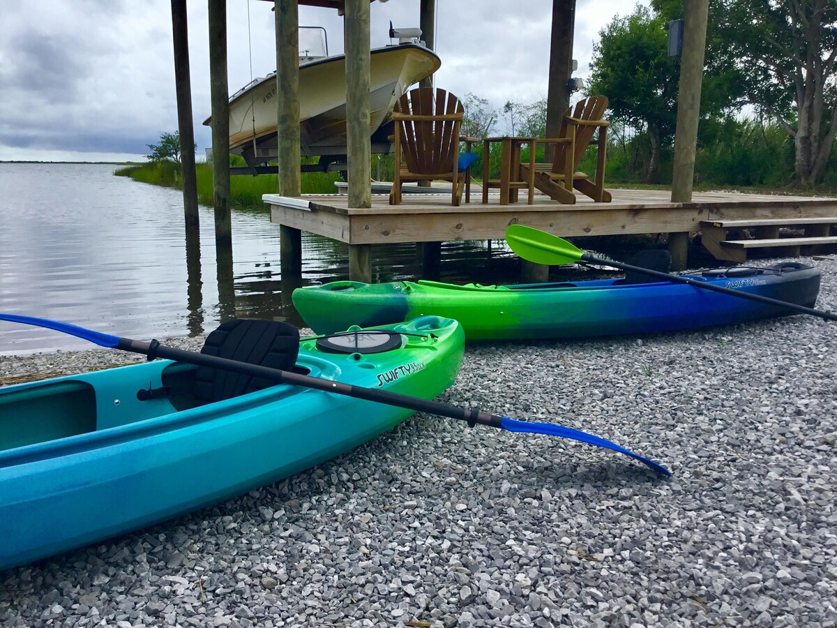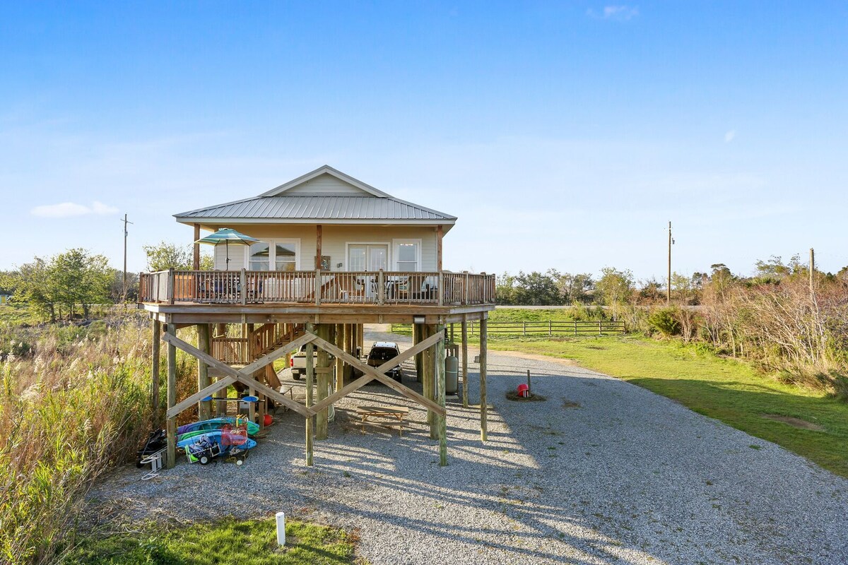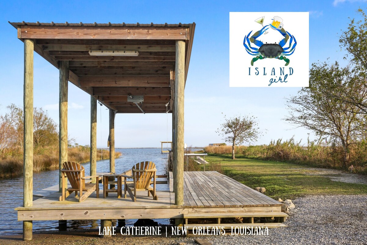 Our 1-acre lakefront location is the showstopper that makes Island Girl the perfect vacay getaway. This gorgeous, pet-friendly home features fantastic outdoor living areas, a spacious interior, a private canal, pier & boathouse, and direct Lake Catherine access. Beautifully styled + equipped with kayaks, fishing & crabbing gear, the property is ideal for families or friends traveling together. Step in, drop your luggage, and be on the water in under 5 minutes–it doesn’t get any better than this! Island Girl is a beautiful lakefront home just 30minutes from the heart of New Orleans that comfortably accommodates up to 6 guests. The residence boasts a gourmet kitchen with stainless steel appliances and convenient bar seating that seamlessly transitions to the dining and living areas. Guests will love this social space’s hardwood floors and large windows that take full advantage of the breathtaking lake views. French doors offer quick access to the home’s wrap-around deck where there is a dining table, gas grill, and more of those amazing Lake Catherine views. Down the hall, each of our 3 bedrooms is impeccably styled with soothing, modern finishes that immediately relax the senses, sleeping configurations as follows: Bedroom 1 – King bed Bedroom 2 – Queen bed Bedroom 3 – Two twin beds The home’s 2 full bathrooms are modern and bright with shower/tub combos that make bathing the kiddos after a day on the lake a breeze. Outdoor living is unparalleled at Island Girl with Lake Catherine as your backyard and endless views for scenery! In addition to the upper wrap around deck, the lower-level houses private parking, a picnic table, and all the gear you need for enjoying the lake including 4 kayaks, life jackets, fishing poles, and crab traps. When it’s time to get out on the water, simply launch the kayaks directly from our shoreline into the private canal or walk down our dock to the boathouse for fishing and crabbing in the shade. Bringing your own boat? Easy – launch it at Island Marina just down the road then drive along the shoreline to our boathouse where you can tie off. And they don’t call this area fisherman’s paradise for nothing! We also have great recommendations for local, professional fishing guides to maximize your sporting time on the water. Be sure to inquire if you are interested. Staying at Island Girl provides the best of both worlds with a location just 25 minutes from New Orleans and 30 minutes to the MS Gulf Coast. Spend the days/nights enjoying the parties, parades and casinos then head to Island Girl for a relaxing and quiet stay away from the excitement. Additional Amenity Highlights Include: - Complimentary unlimited Wi-Fi - 4 TVs throughout the home - Dedicated workspace - Boiling pot - Comprehensive housewares package + Keurig coffee machine - Fresh linens and towels for every guest - Full-size washer and dryer - RV hookup Traveling with a larger group and need more space? We have a nearly identical 3-BD/2-BA home just down the street – ask us about renting both units! Pet welcome with pre approval and $100.00 pet fee. Operator Licenses: 21-CSTR-17658, 21-OSTR-17516 Our prices include all fees. No hidden fees.