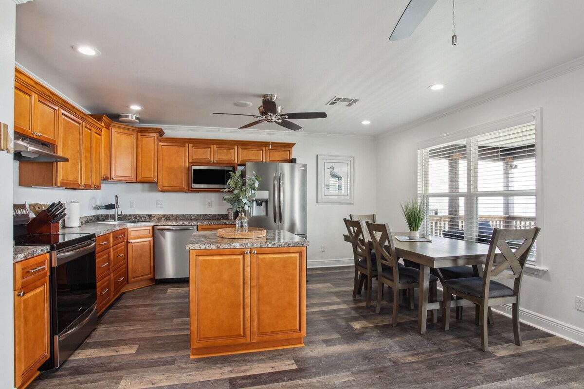 Located just 30 minutes from NOLA, Island Girl II is an incredibly special lakeside retreat. Our cheerful 3-BD/2-BA lake house is smartly styled with a modern coastal theme, has bright and airy social areas, comfortable bedrooms, and fantastic outdoor living spaces. Kayaks, fishing & crabbing gear are provided for use on our private pier and dock that sits directly on Lake Catherine. Smart TVs, Wi-Fi, 2 BBQ grills, pro fishing guides and more – we have everything you need for an amazing time! Inside the home we have a large, modern kitchen with upgraded stainless-steel appliances, a prep island, and dining table for 6 – a perfect space for fish fries and crab boils! Open sightlines from the kitchen to the family living area are an entertainer’s dream, and the outdoor covered patio right off this space was made for lazy days enjoying nothing but free time on the lake. Plan on grilling the catch of the day out here on the propane grill then dining alfresco at our outdoor table with gorgeous lake views as your backdrop. After spending a long day on the lake, there are 3 beautifully styled bedrooms waiting for you that comfortably accommodate up to 6 guests. Sleeping accommodations are as follows: Bedroom 1 – King bed Bedroom 2 – Queen bed Bedroom 3 – Two twin beds Outdoor living down by the lake at Island Girl II is amazing, too! Our private pier and dock are the ideal place to fish, crab and soak up some rays when not out in our kayaks on Lake Catherine. Below the home is an additional paved outdoor living space with a charcoal BBQ grill, fish cleaning station, shady picnic spot, and hose for rinsing off. Bringing your own boat? Easy – launch it at Island Marina just down the road then drive along the shoreline to our pier where you can tie off. And they don’t call this area fisherman’s paradise for nothing! Wrigley’s marina is a very convenient 3 minutes away and they sell live shrimp. We also have great recommendations for local, professional fishing guides to maximize your sporting time on the water. Be sure to inquire if you are interested. Staying at Island Girl II provides the best of both worlds with a location just 30 minutes from New Orleans and the MS Gulf Coast. Spend the days/nights enjoying the parties, parades and casinos then head back to Island Girl for a relaxing and quiet stay away from the excitement. Amenity Highlights Include: - Complimentary unlimited Wi-Fi - Smart TVs throughout the home - Dedicated workspace - Comprehensive housewares package + standard small appliances - Fresh linens and towels for every guest - Full-size washer and dryer - Cargo Elevator Traveling with a larger group and need more space? We have a nearly identical 3-BD/2-BA home just down the street – ask us about renting both units! Guest access All parts of the house, pier and dock are accessible to our guests. Other things to note Pet welcome with pre approval and $100.00 pet fee. We have plenty of space for guest parking including additional family that may visit during your stay. #21-OSTR-17516 | #22-CSTR-06548 Our prices include all fees. No hidden fees.