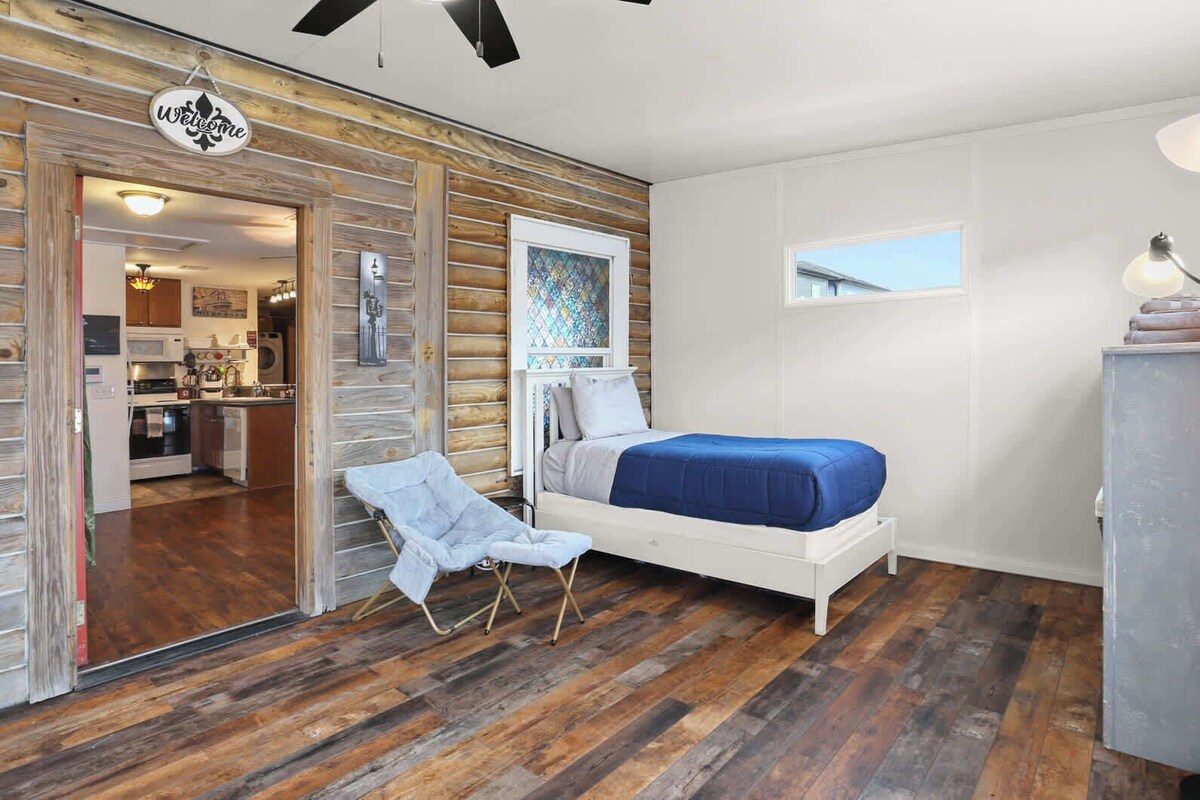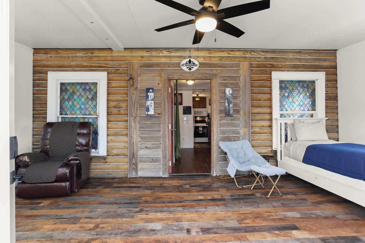Summary: Enjoy a memorable stay in this unique 1 bedroom, 1 bathroom 'urban-cabin' in the heart of the historic 7th ward. The wood walls adorned with local art create an inviting and comfortable space. The central location makes it easy to get anywhere in the city within minutes, including the French Quarter! The Space: This stylish space has all the amenities to make your stay comfortable: central AC, a washer/dryer in the unit, and a back porch for relaxing on. The bedroom includes a queen size bed with luxury linens, and the bathroom includes a walk in shower that is handicap friendly. The kitchen is fully stocked for your cooking needs. There is also a sun room with an additional twin size bed, but we do not list that as a bedroom since it is a sunroom and gets a bit warmer than the rest of the house. Guest Access: You will have full and private access to the 1 bedroom rear unit. The building is a double (duplex) and shares one wall with the owner's unit in the front. The Neighborhood: This home is located in the historic 7th Ward. This diverse and vibrant neighborhood sits just off beautiful Esplanade Ave. and has close proximity to the French Quarter, Interstate 10, local restaurants, and coffee shops. It is very central and only takes about 10 minutes or less to get to most places in the city. Getting Around: This home has one off-street driveway parking stop and plenty of free 24-hour street parking right out front. It's an easy 5-minute Uber or Lyft ride to the French Quarter! Other Things to Note: The building is a double (duplex) and shares one wall with the owner's unit in the rear. The owner of the unit has a blocked off space for personal storage by a curtain. Please do not disturb this area. Pets are welcome for a one-time $250 fee per pet. Interaction with Guests: Kickback Properties values our guests’ space and gives you privacy to enjoy your stay. We are available via messaging for questions or issues - messaging us through your booking app is the best way to reach us. We love our city and enjoy giving recommendations on restaurants, bars, events, music, transportation, sightseeing, tours, and all things New Orleans! Please only call after 6pm for emergencies (lockout, fire, flood, no heat or AC etc.) Our prices include all fees. No hidden fees.